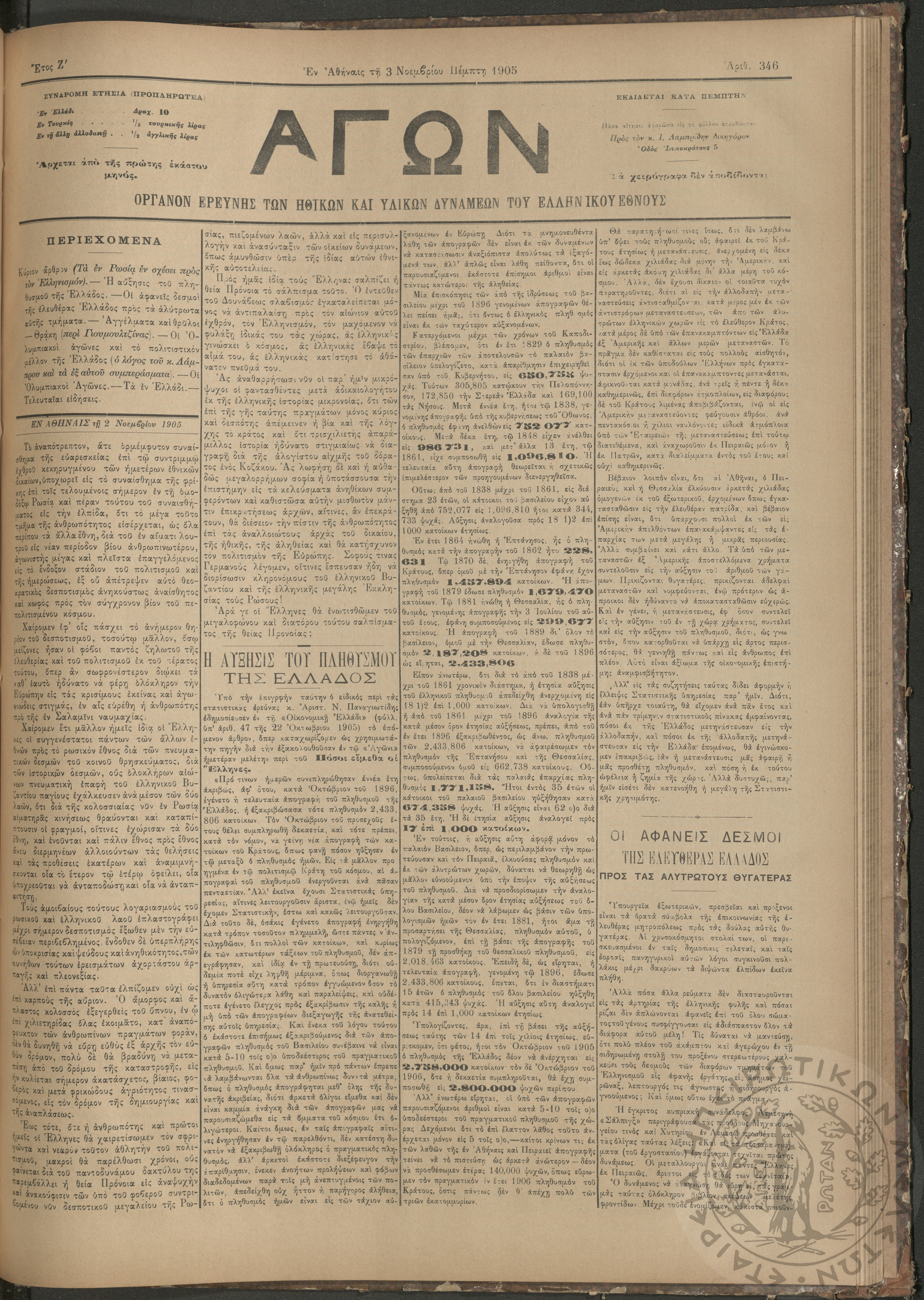 Αγών: Όργανον ερεύνης των ηθικών και υλικών δυνάμεων του Ελληνικού Έθνους, 1905 (Φ. 346)Έτος Ζ΄, Φ.346...
