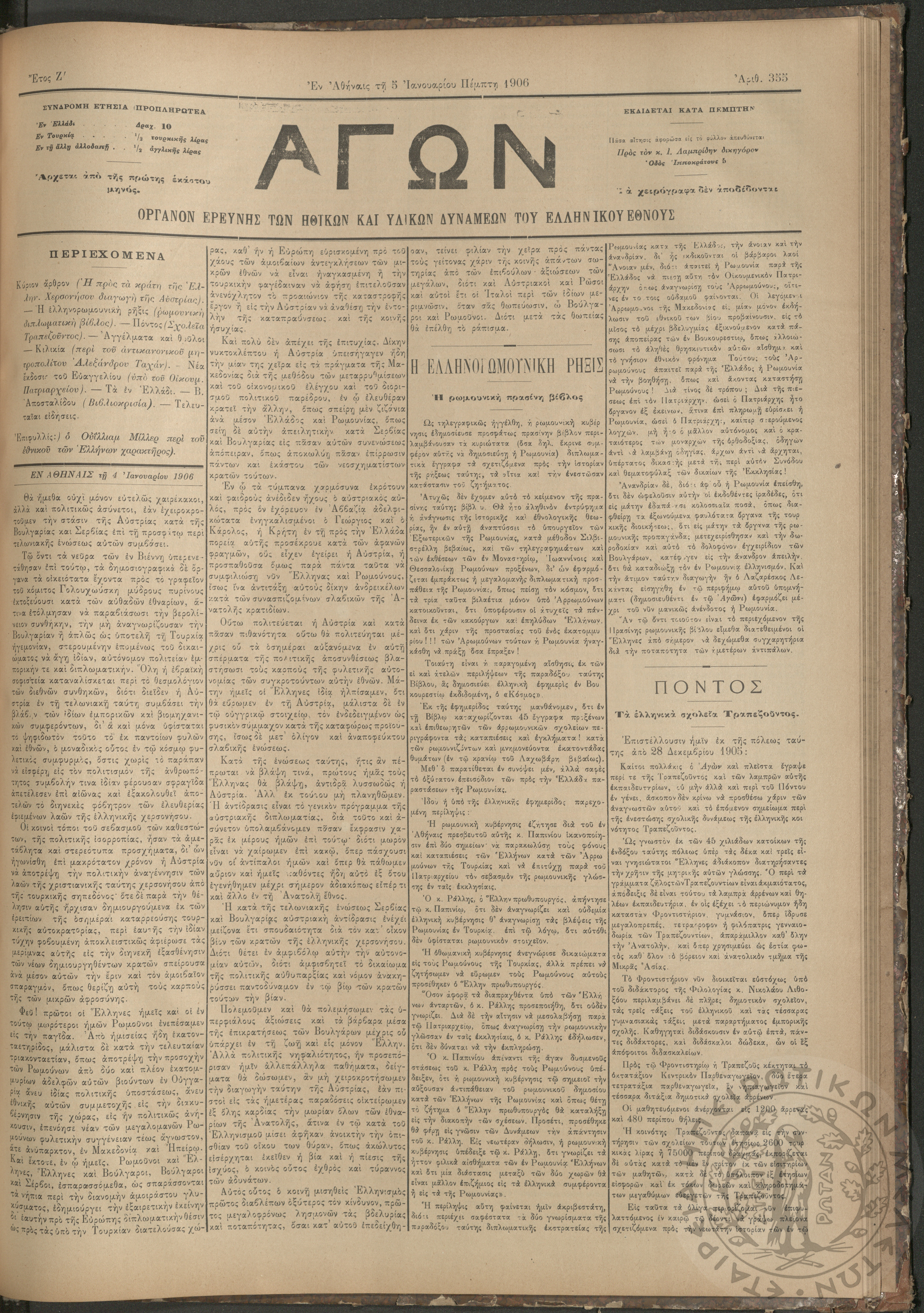 Αγών: Όργανον ερεύνης των ηθικών και υλικών δυνάμεων του Ελληνικού Έθνους, 1906 (Φ. 355)Έτος Ζ΄, Φ. 355...