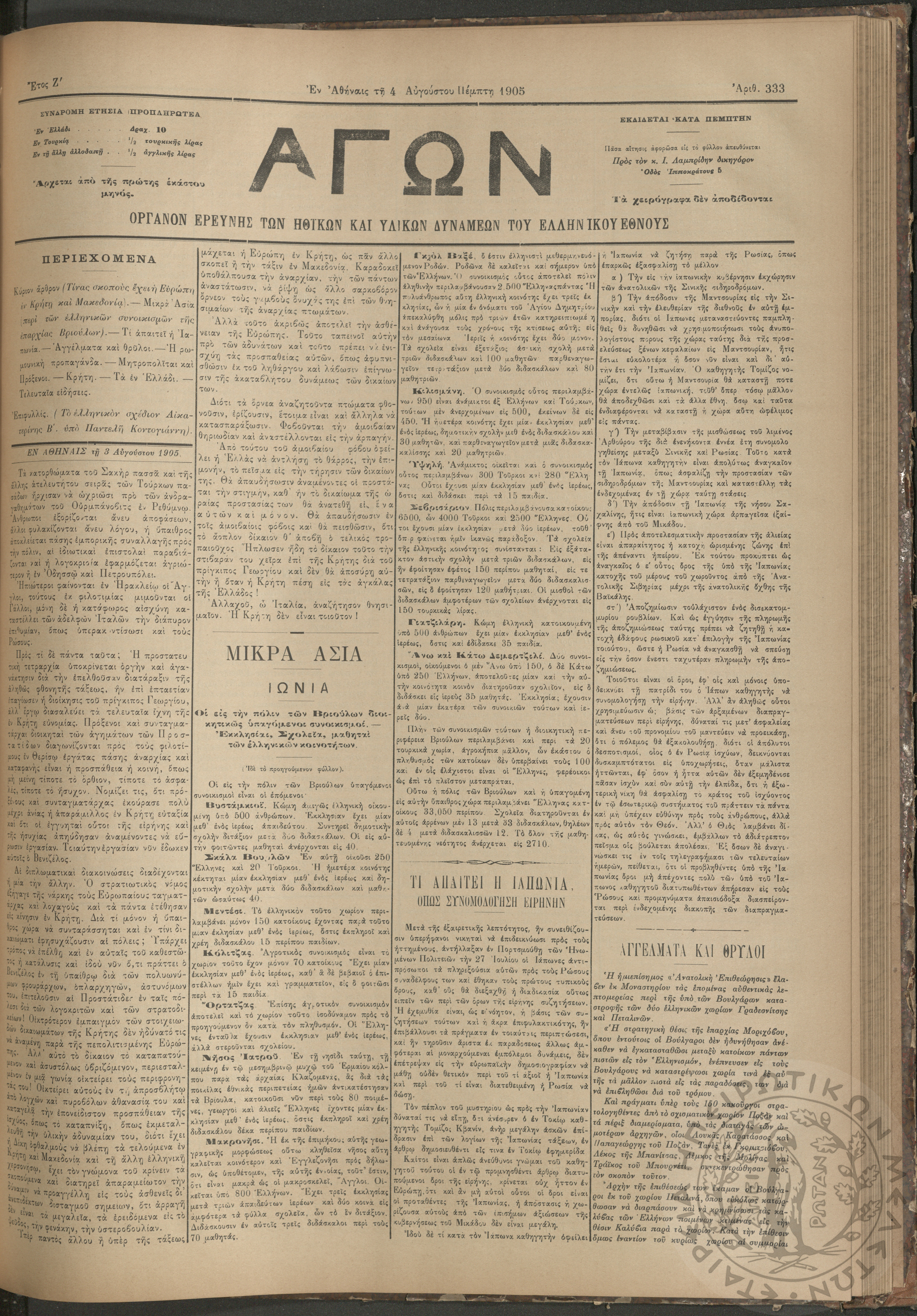 Αγών: Όργανον ερεύνης των ηθικών και υλικών δυνάμεων του Ελληνικού Έθνους, 1905 (Φ. 333)Έτος Ζ΄, Φ.333...