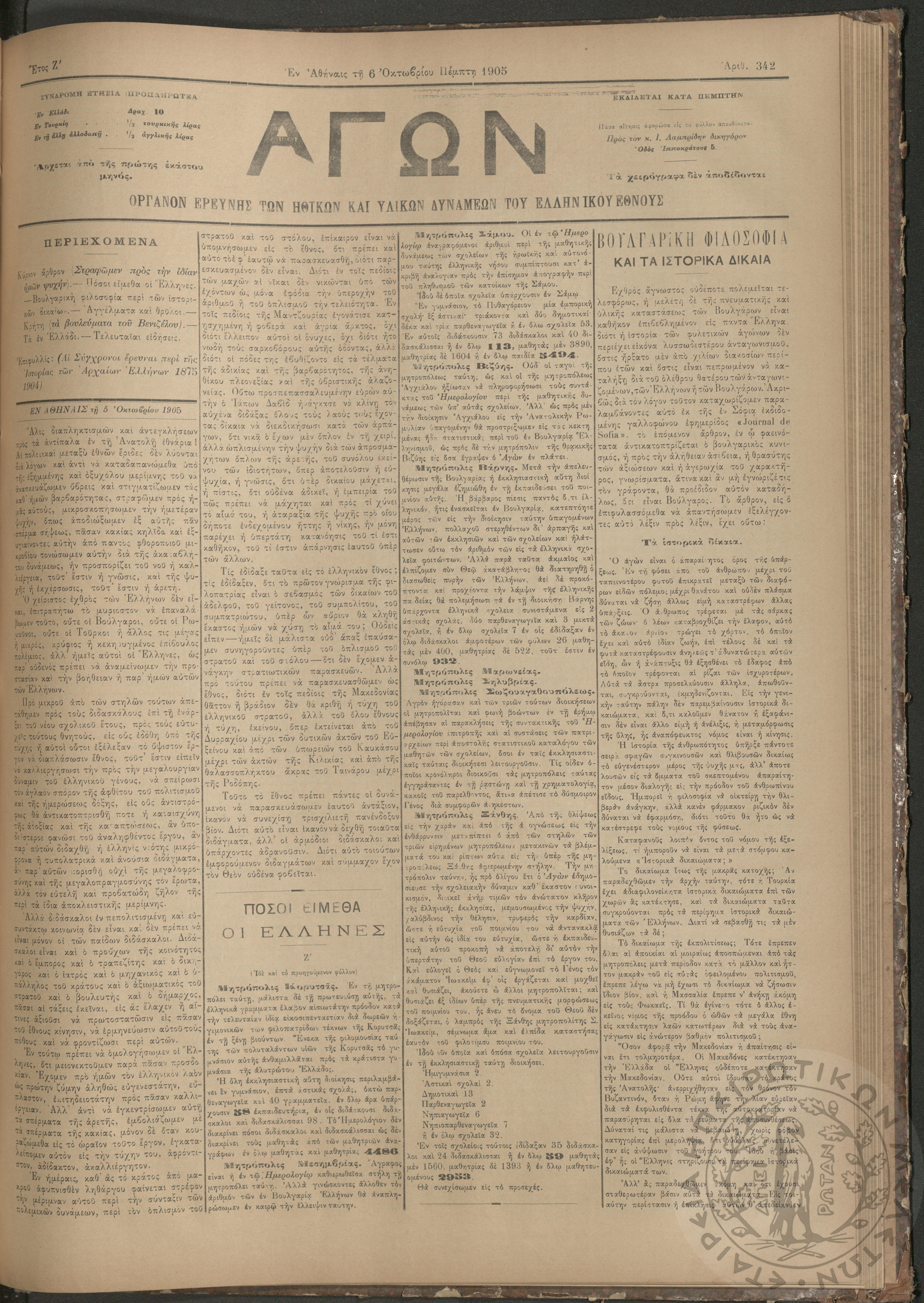 Αγών: Όργανον ερεύνης των ηθικών και υλικών δυνάμεων του Ελληνικού Έθνους, 1905 (Φ. 342)Έτος Ζ΄, Φ.342...
