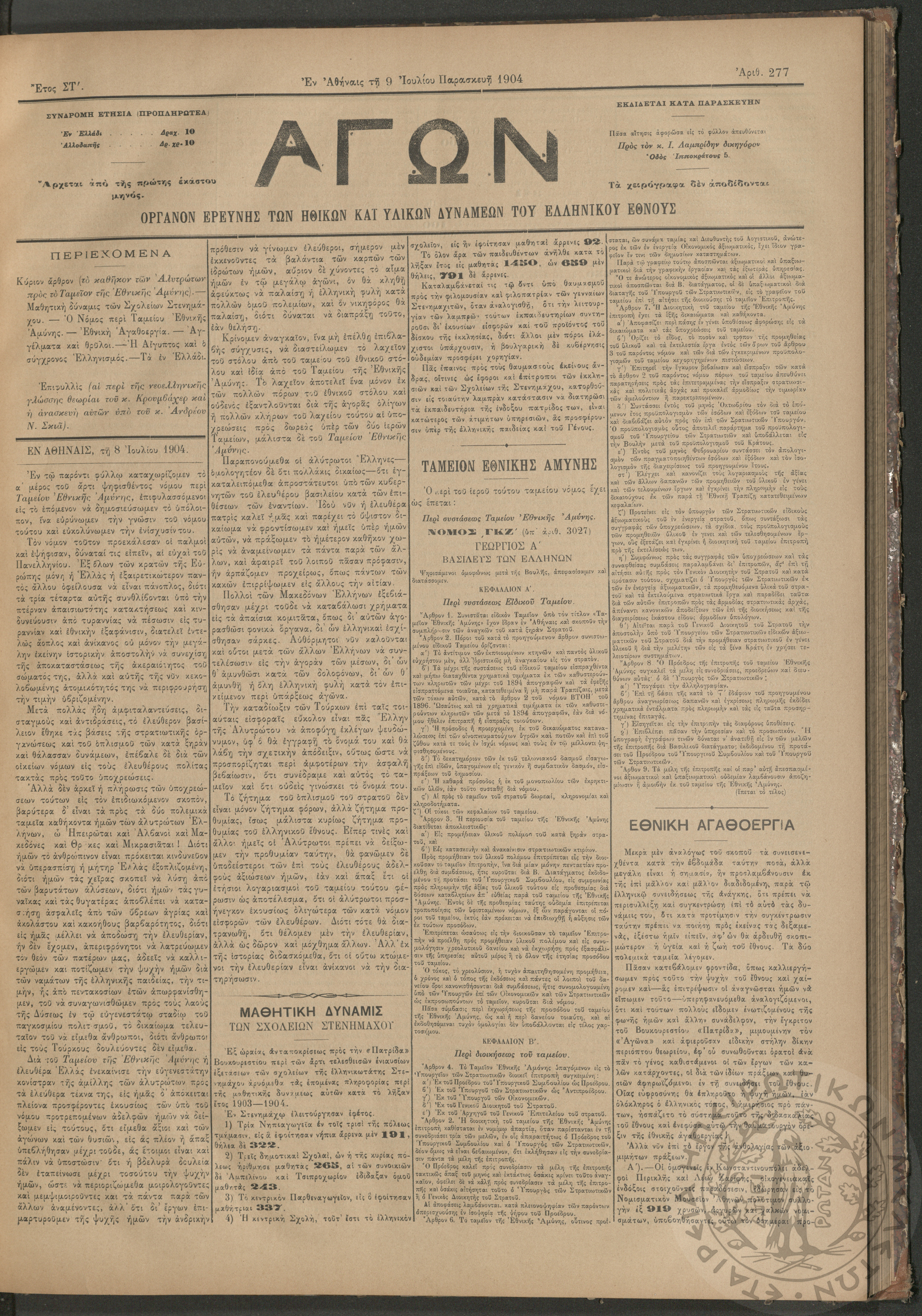 Αγών: Όργανον ερεύνης των ηθικών και υλικών δυνάμεων του Ελληνικού Έθνους, 1904 (Φ. 277)Έτος ΣΤ΄, Φ. 277...