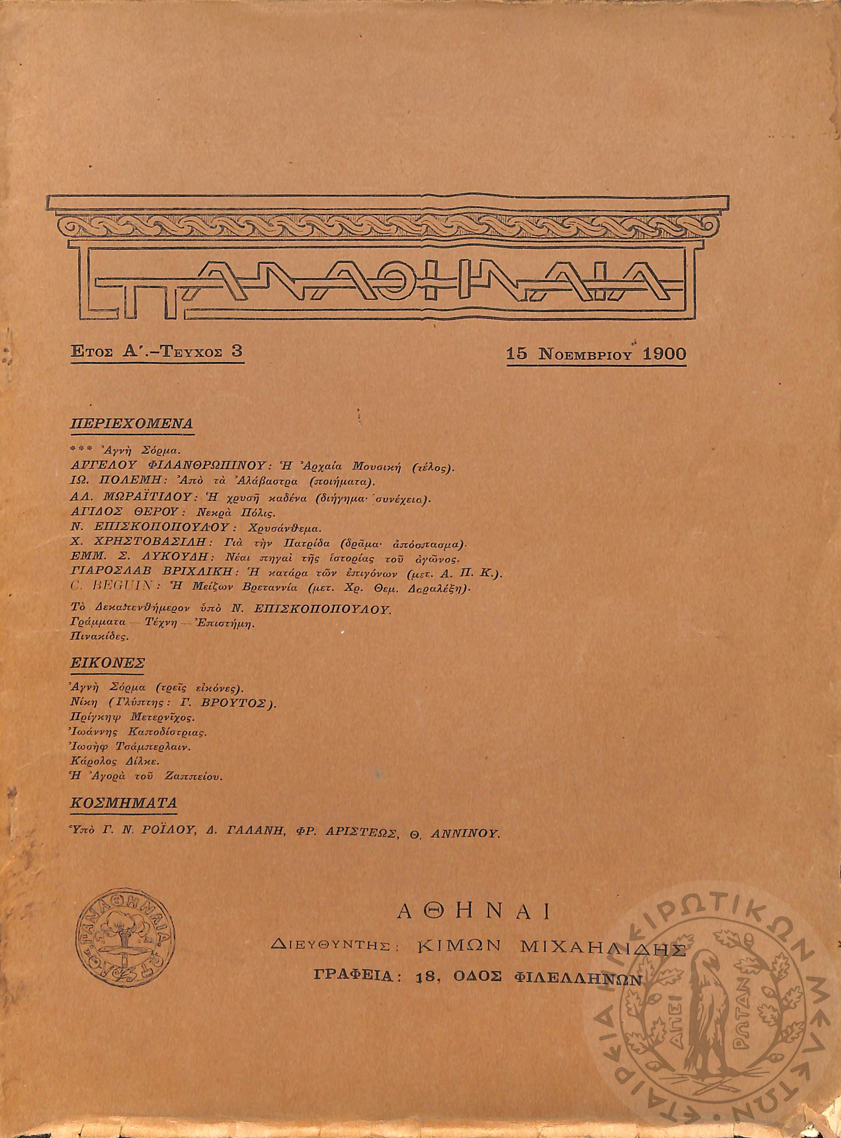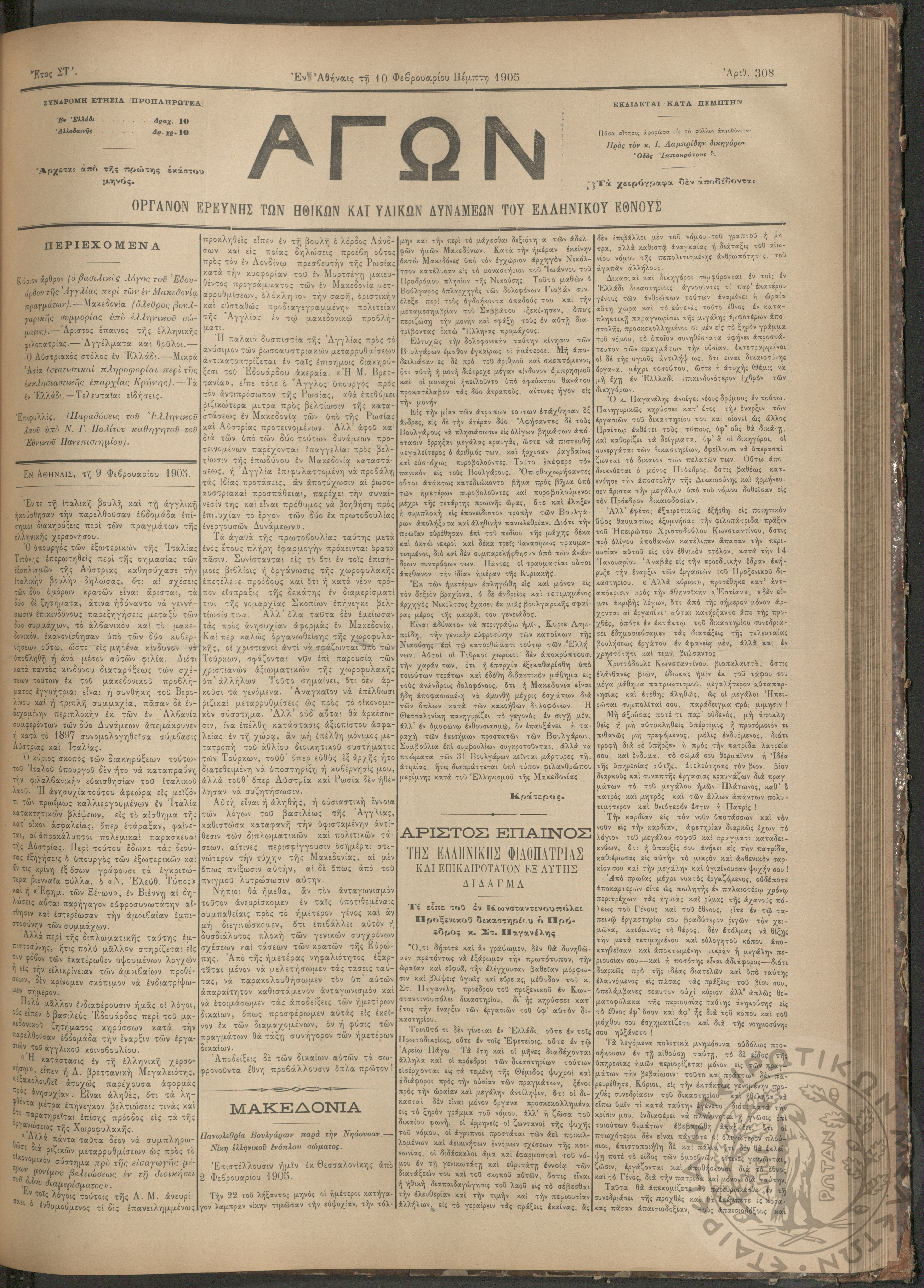 Αγών: Όργανον ερεύνης των ηθικών και υλικών δυνάμεων του Ελληνικού Έθνους, 1905 (Φ. 308)Έτος ΣΤ΄, Φ. 308...