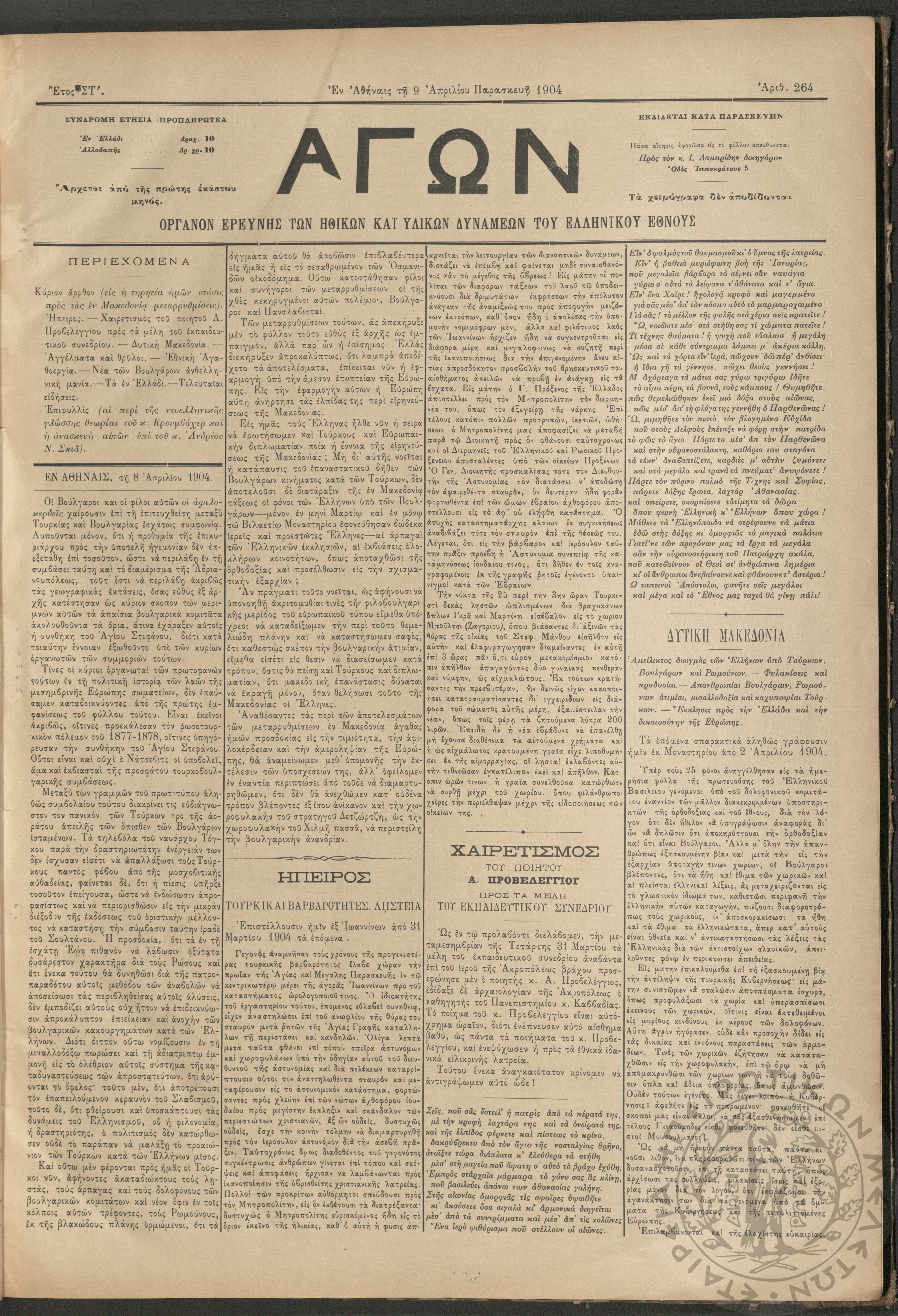 Αγών: Όργανον ερεύνης των ηθικών και υλικών δυνάμεων του Ελληνικού Έθνους, 1904 (Φ. 264)Έτος ΣΤ΄, Φ. 264...