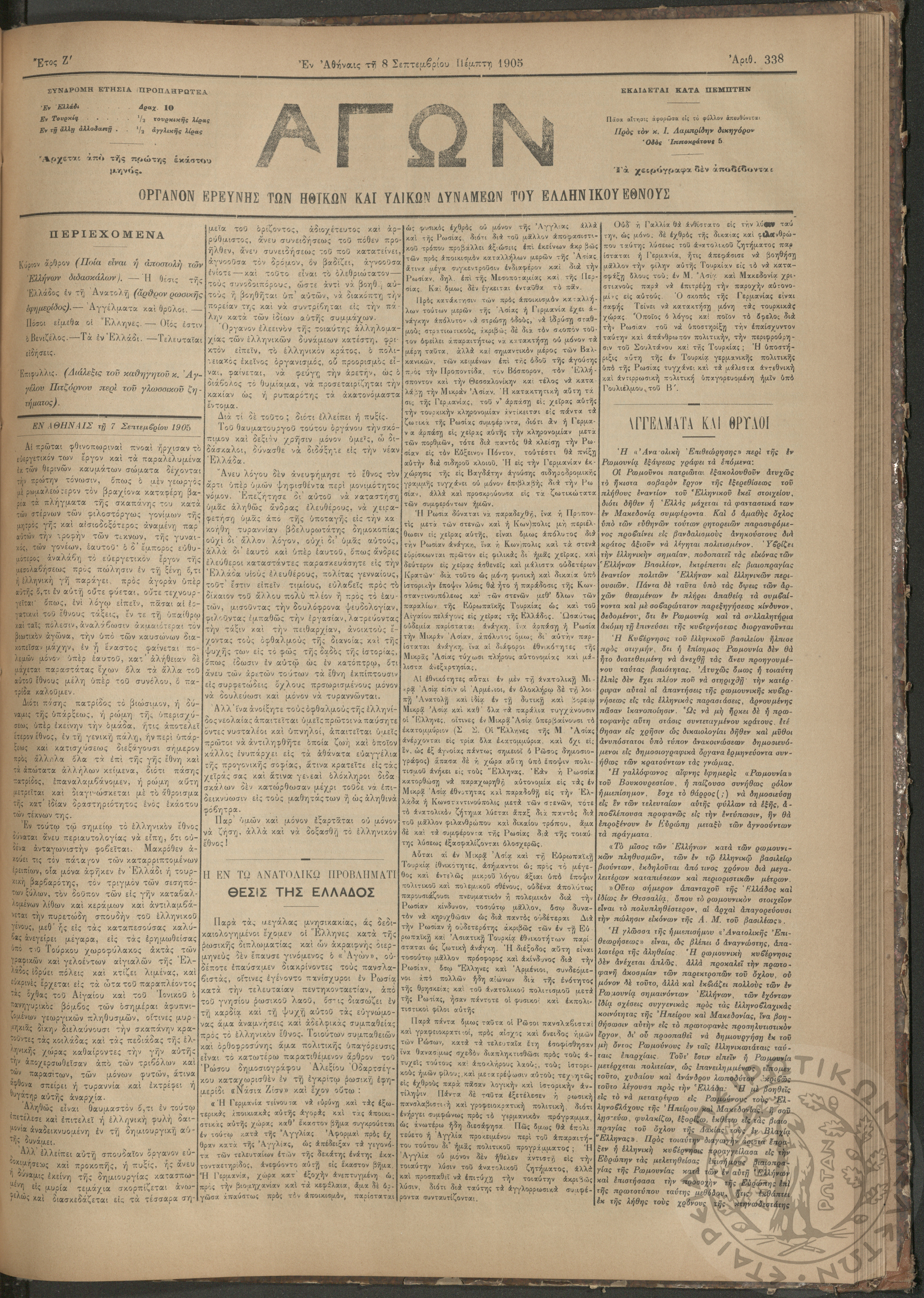 Αγών: Όργανον ερεύνης των ηθικών και υλικών δυνάμεων του Ελληνικού Έθνους, 1905 (Φ. 338)Έτος Ζ΄, Φ.338...
