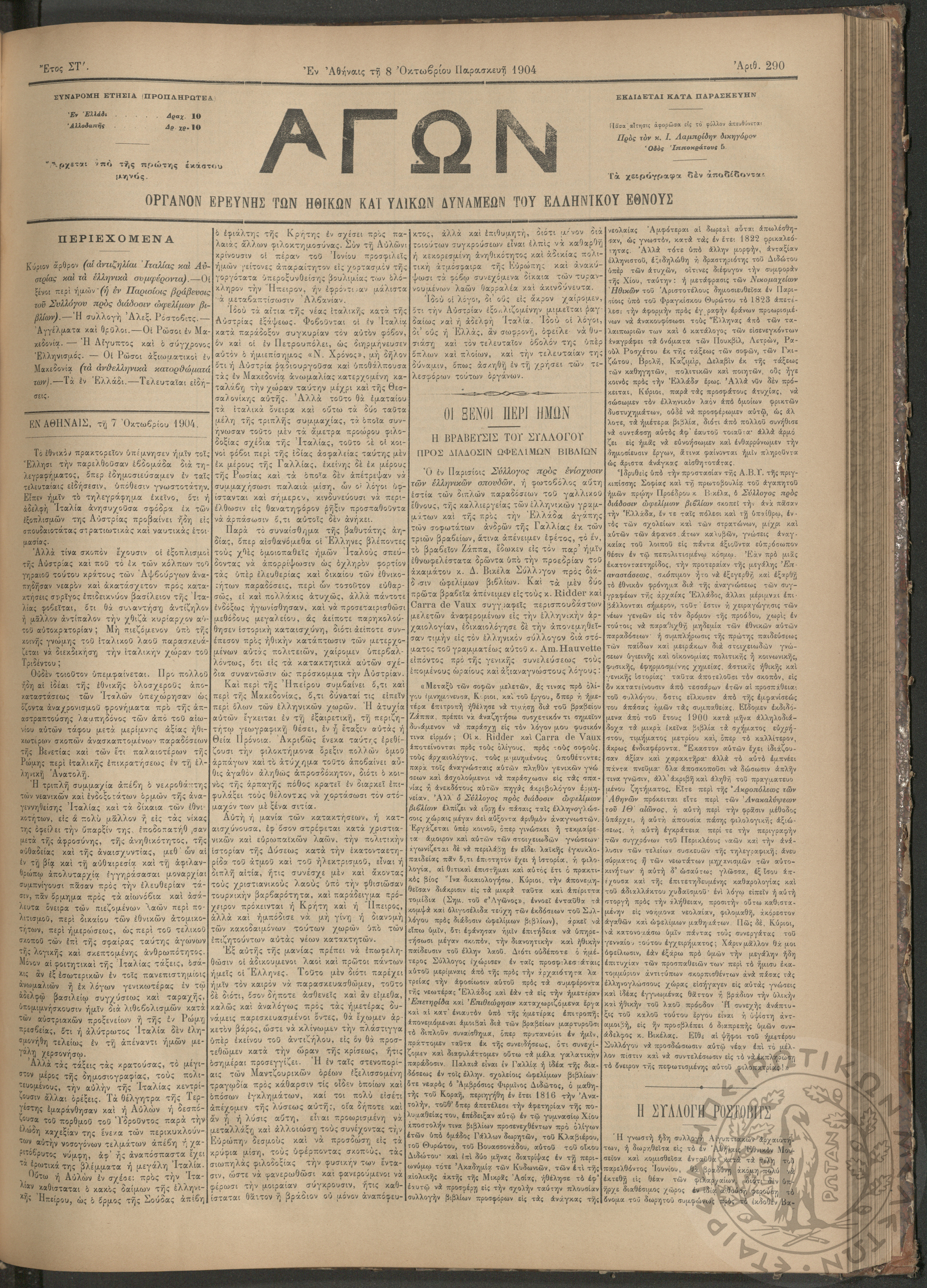 Αγών: Όργανον ερεύνης των ηθικών και υλικών δυνάμεων του Ελληνικού Έθνους, 1904 (Φ. 290)Έτος ΣΤ΄, Φ. 290...