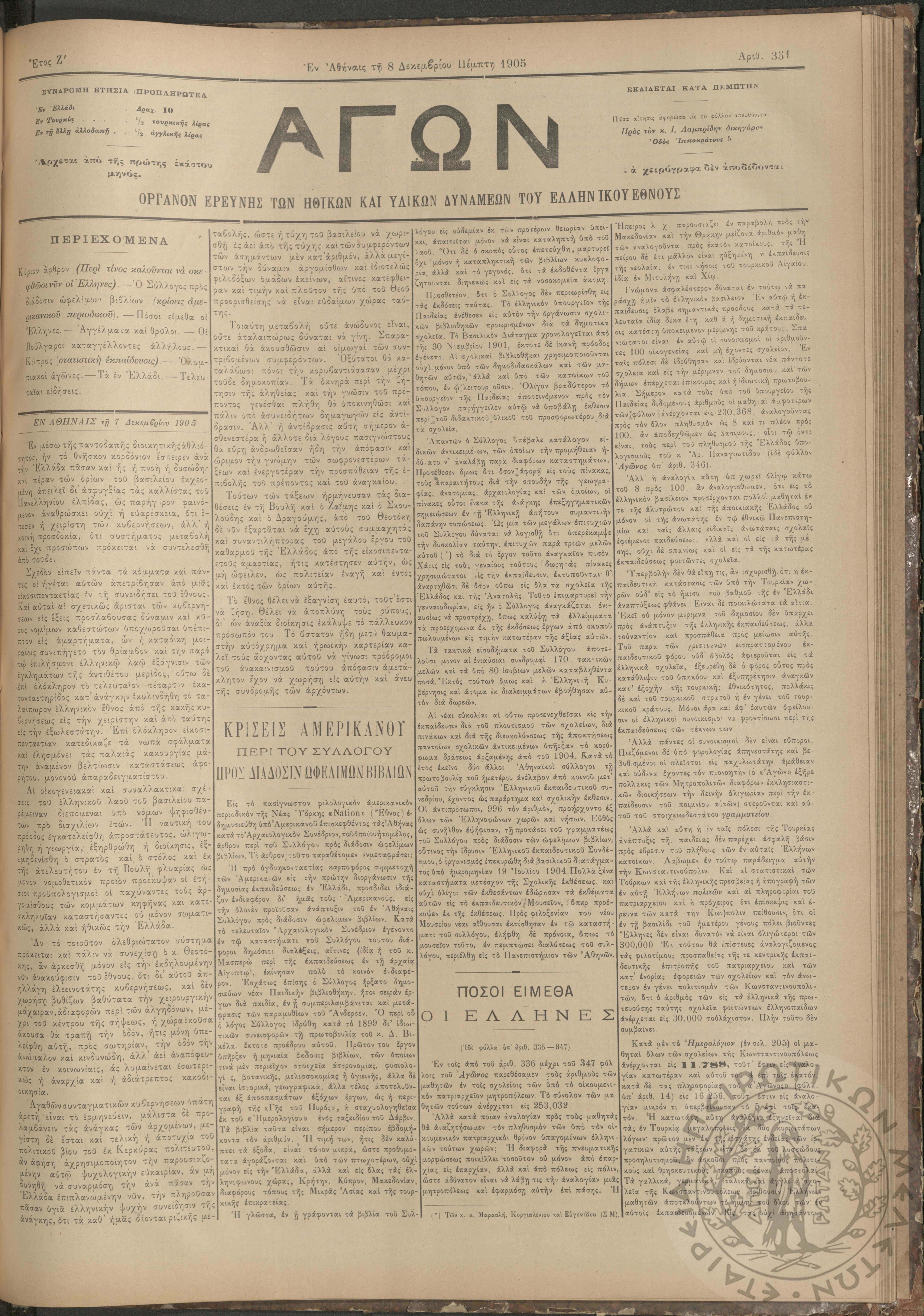 Αγών: Όργανον ερεύνης των ηθικών και υλικών δυνάμεων του Ελληνικού Έθνους, 1905 (Φ. 351)Έτος Ζ΄, Φ.351...