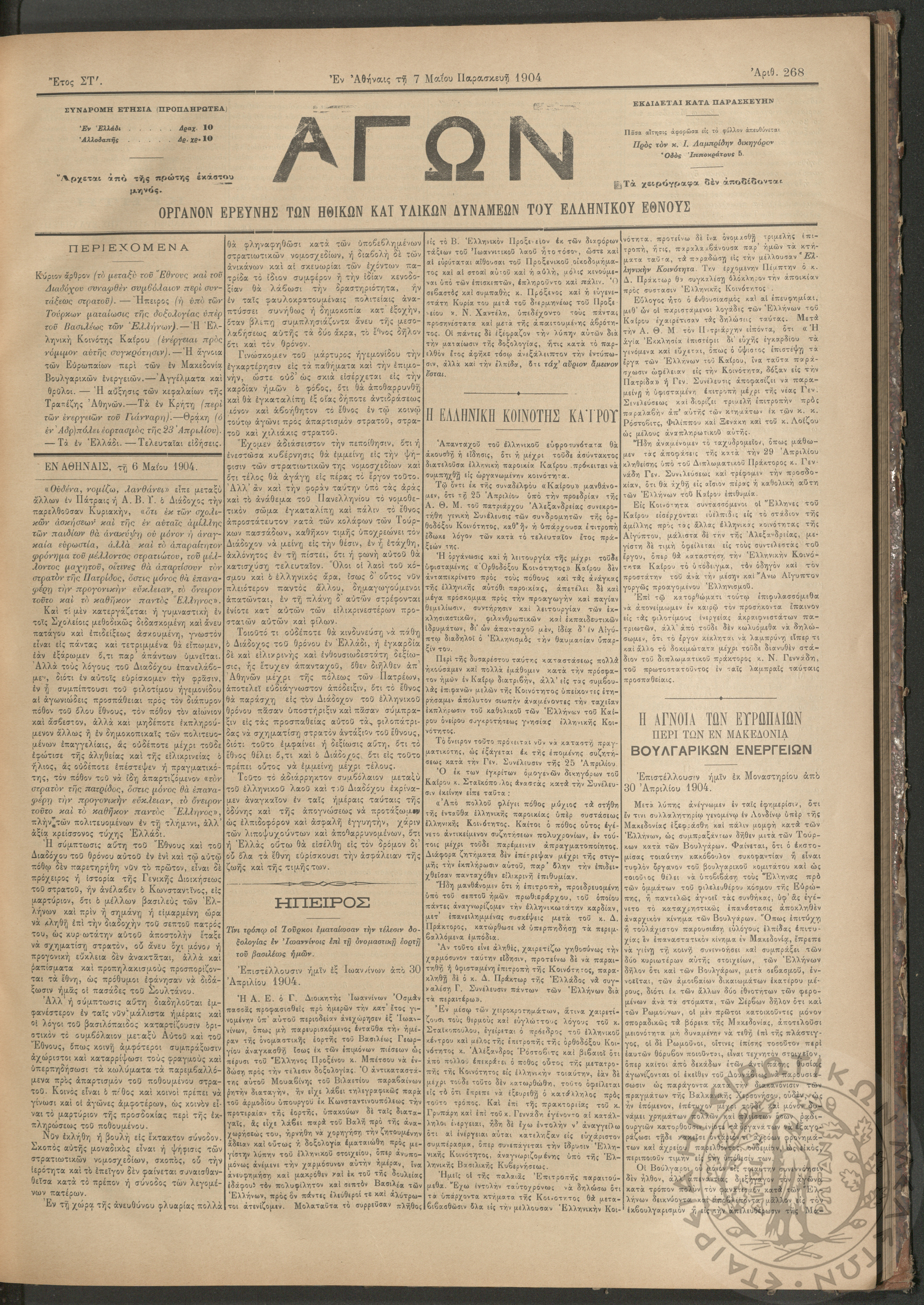 Αγών: Όργανον ερεύνης των ηθικών και υλικών δυνάμεων του Ελληνικού Έθνους, 1904 (Φ. 268)Έτος ΣΤ΄, Φ. 268...