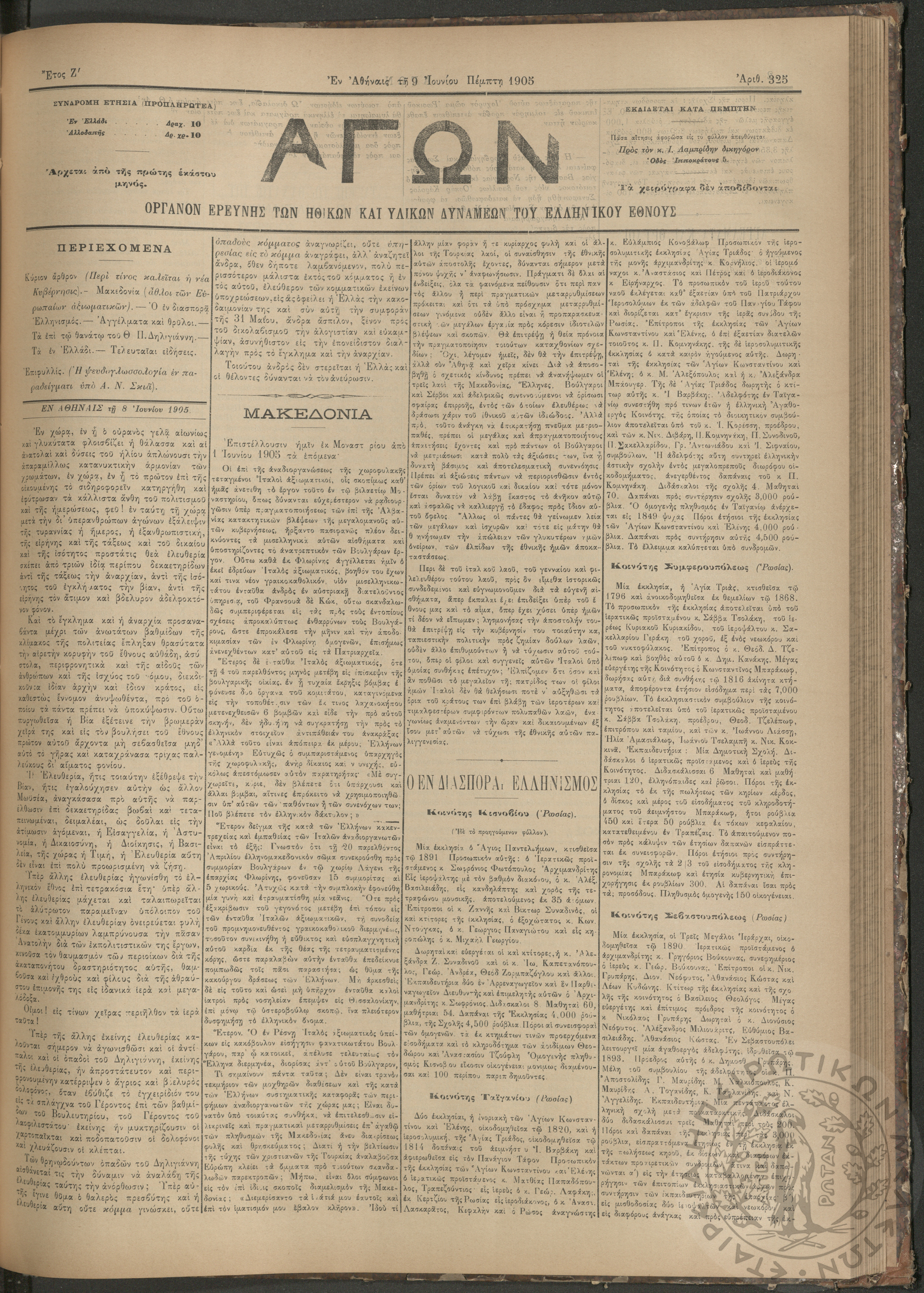 Αγών: Όργανον ερεύνης των ηθικών και υλικών δυνάμεων του Ελληνικού Έθνους, 1905 (Φ. 325)Έτος Ζ΄, Φ.325...