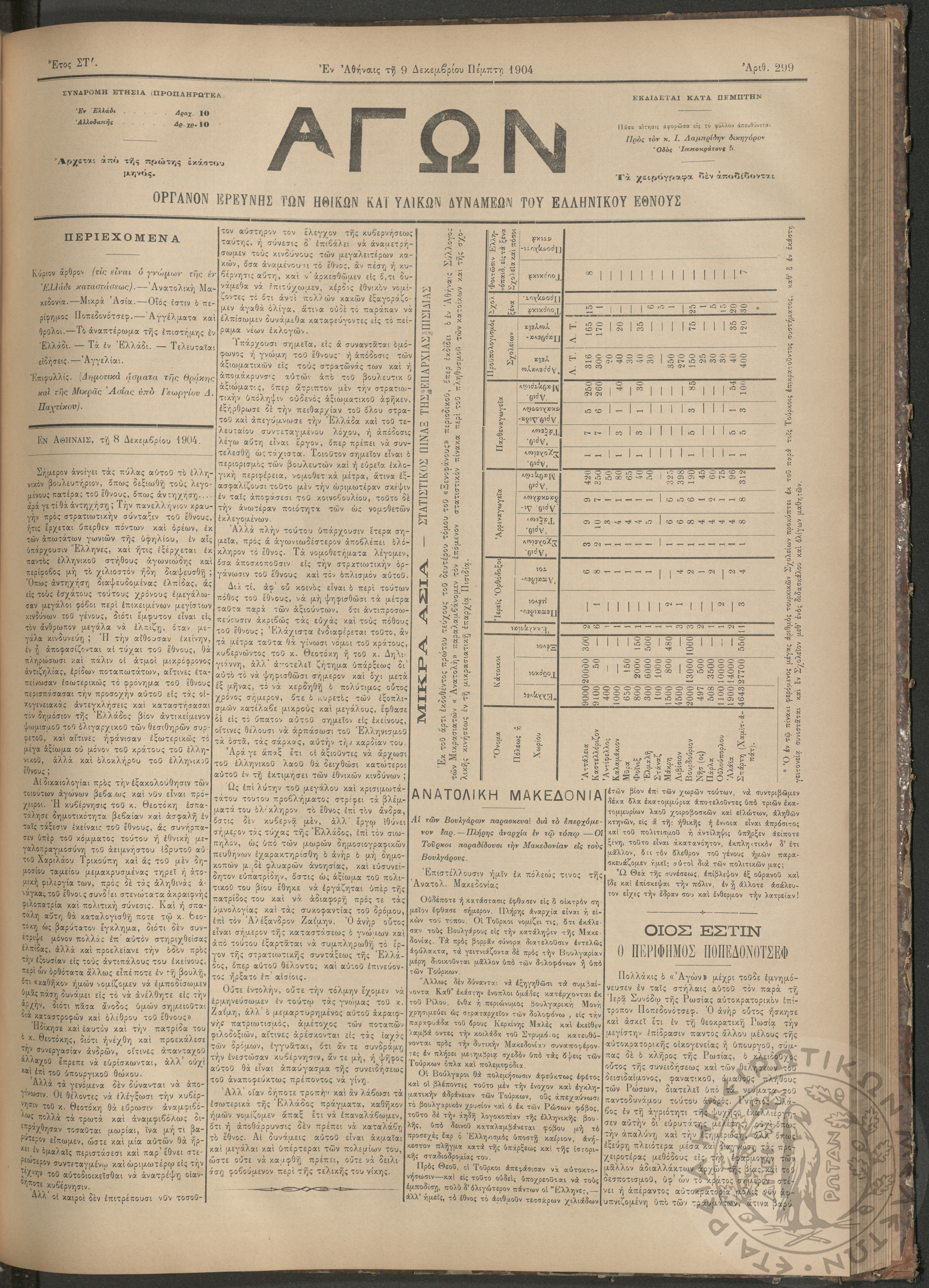 Αγών: Όργανον ερεύνης των ηθικών και υλικών δυνάμεων του Ελληνικού Έθνους, 1904 (Φ. 299)Έτος ΣΤ΄, Φ. 299...