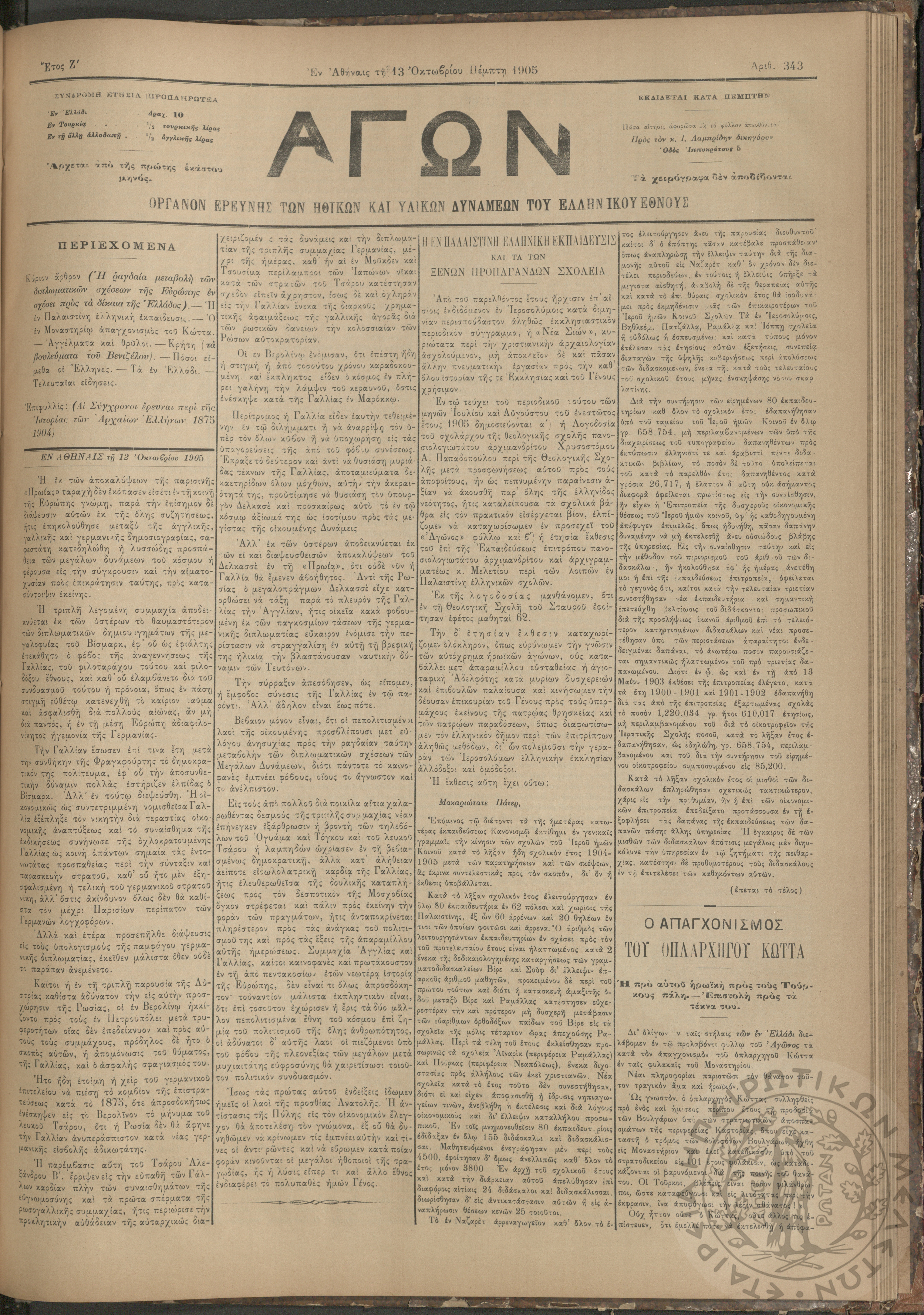 Αγών: Όργανον ερεύνης των ηθικών και υλικών δυνάμεων του Ελληνικού Έθνους, 1905 (Φ. 343)Έτος Ζ΄, Φ.343...