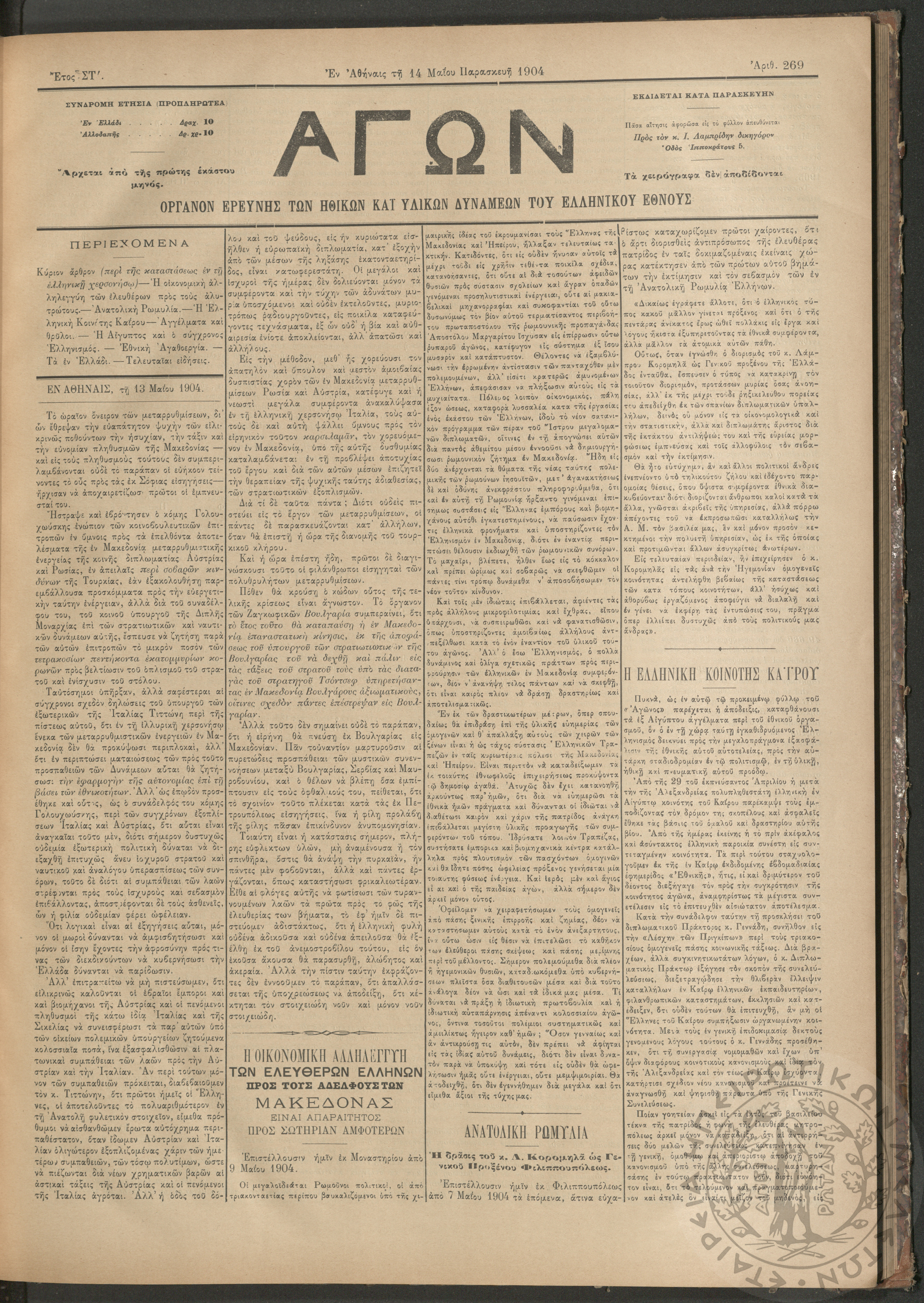 Αγών: Όργανον ερεύνης των ηθικών και υλικών δυνάμεων του Ελληνικού Έθνους, 1904 (Φ. 269)Έτος ΣΤ΄, Φ. 269...