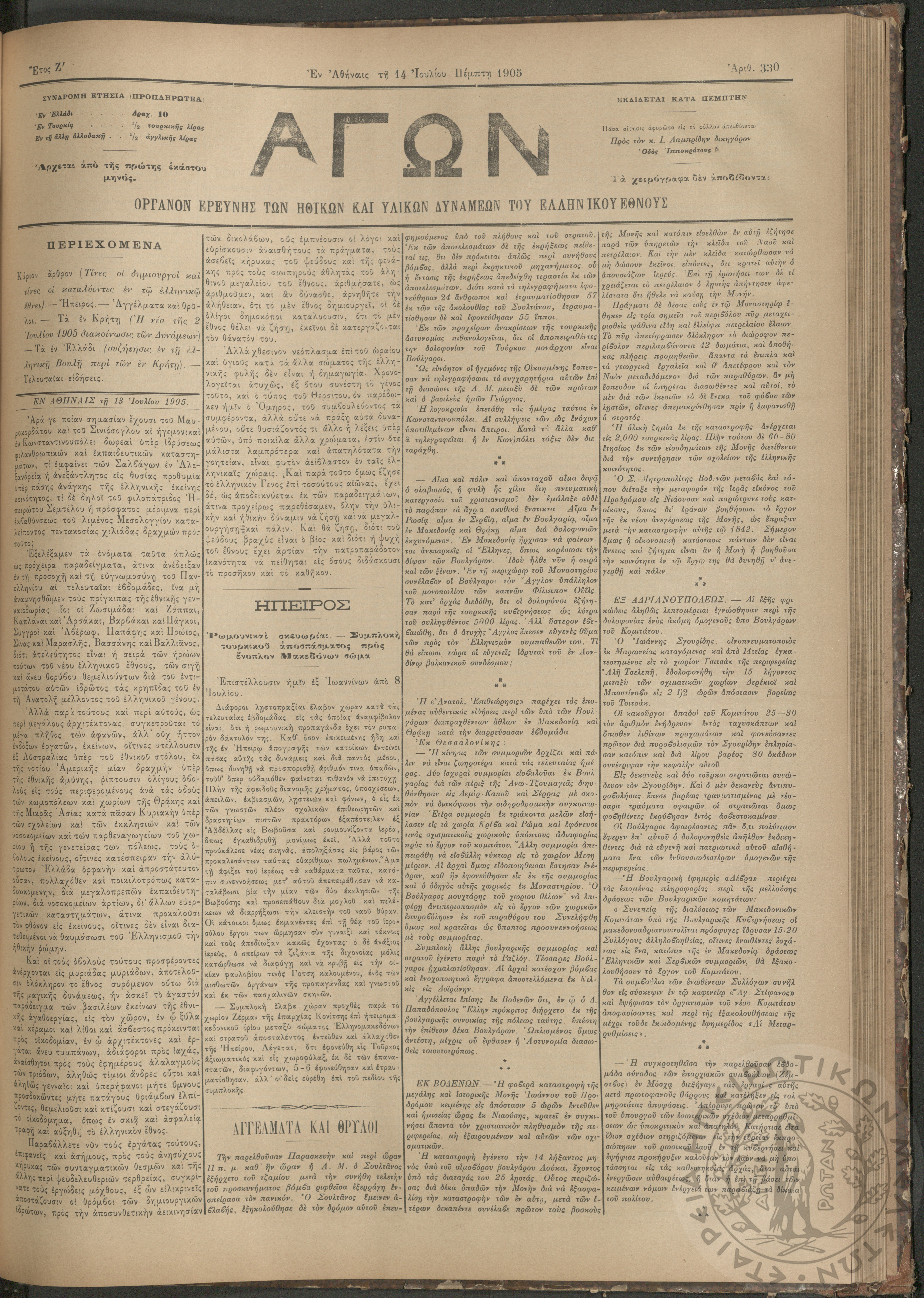 Αγών: Όργανον ερεύνης των ηθικών και υλικών δυνάμεων του Ελληνικού Έθνους, 1905 (Φ. 330)Έτος Ζ΄, Φ.330...