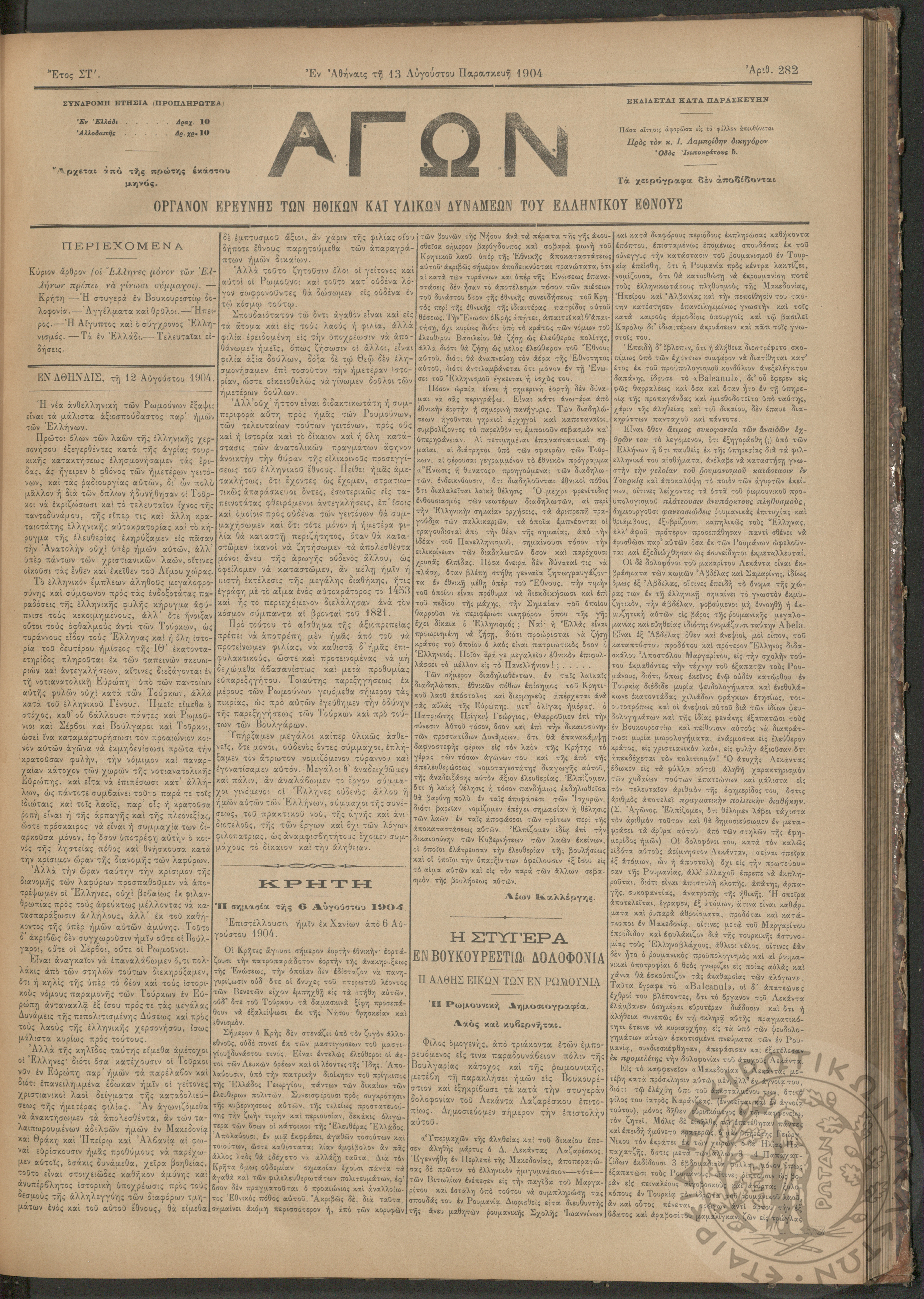 Αγών: Όργανον ερεύνης των ηθικών και υλικών δυνάμεων του Ελληνικού Έθνους, 1904 (Φ. 282)Έτος ΣΤ΄, Φ. 282...