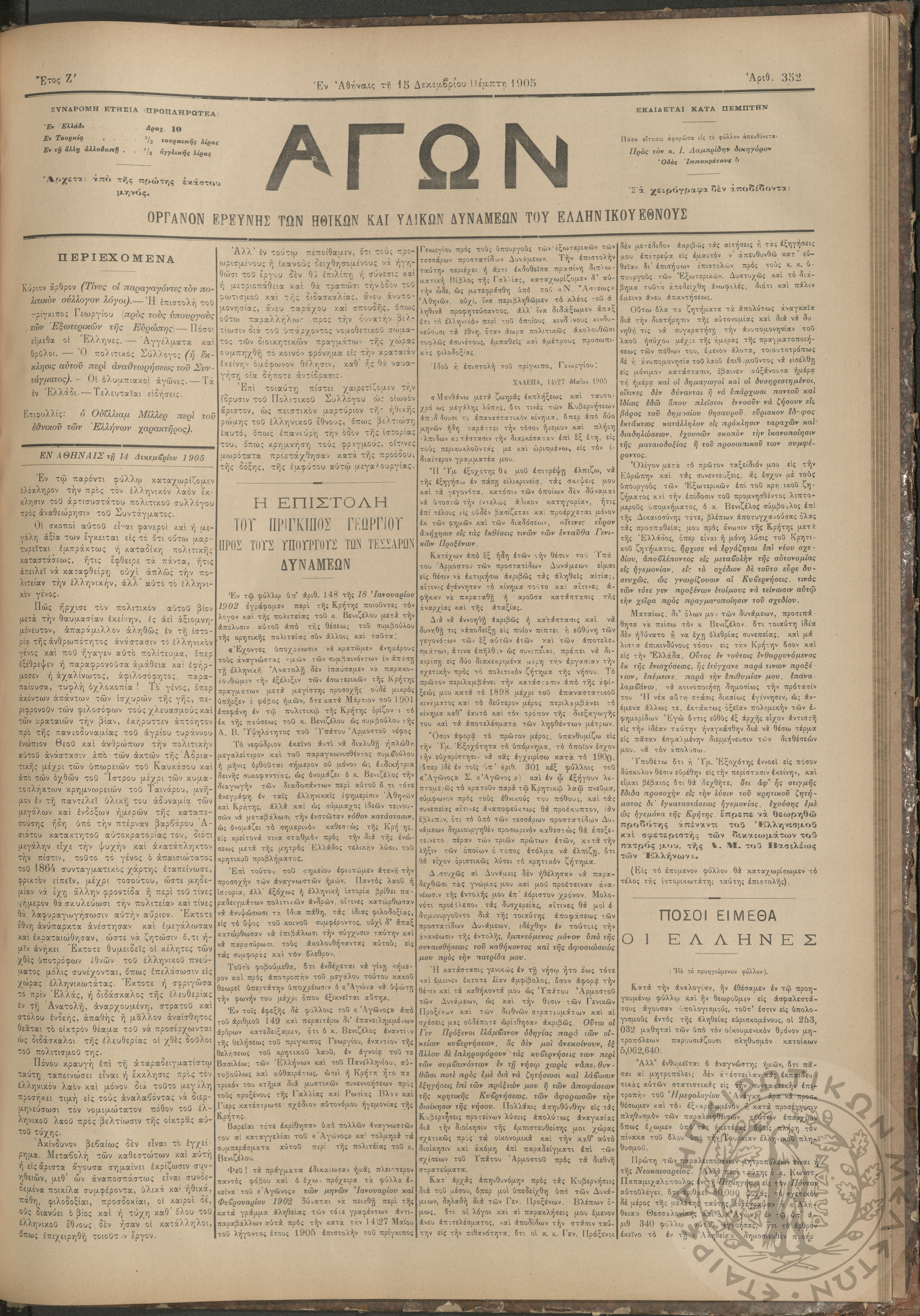 Αγών: Όργανον ερεύνης των ηθικών και υλικών δυνάμεων του Ελληνικού Έθνους, 1905 (Φ. 352)Έτος Ζ΄, Φ.352...