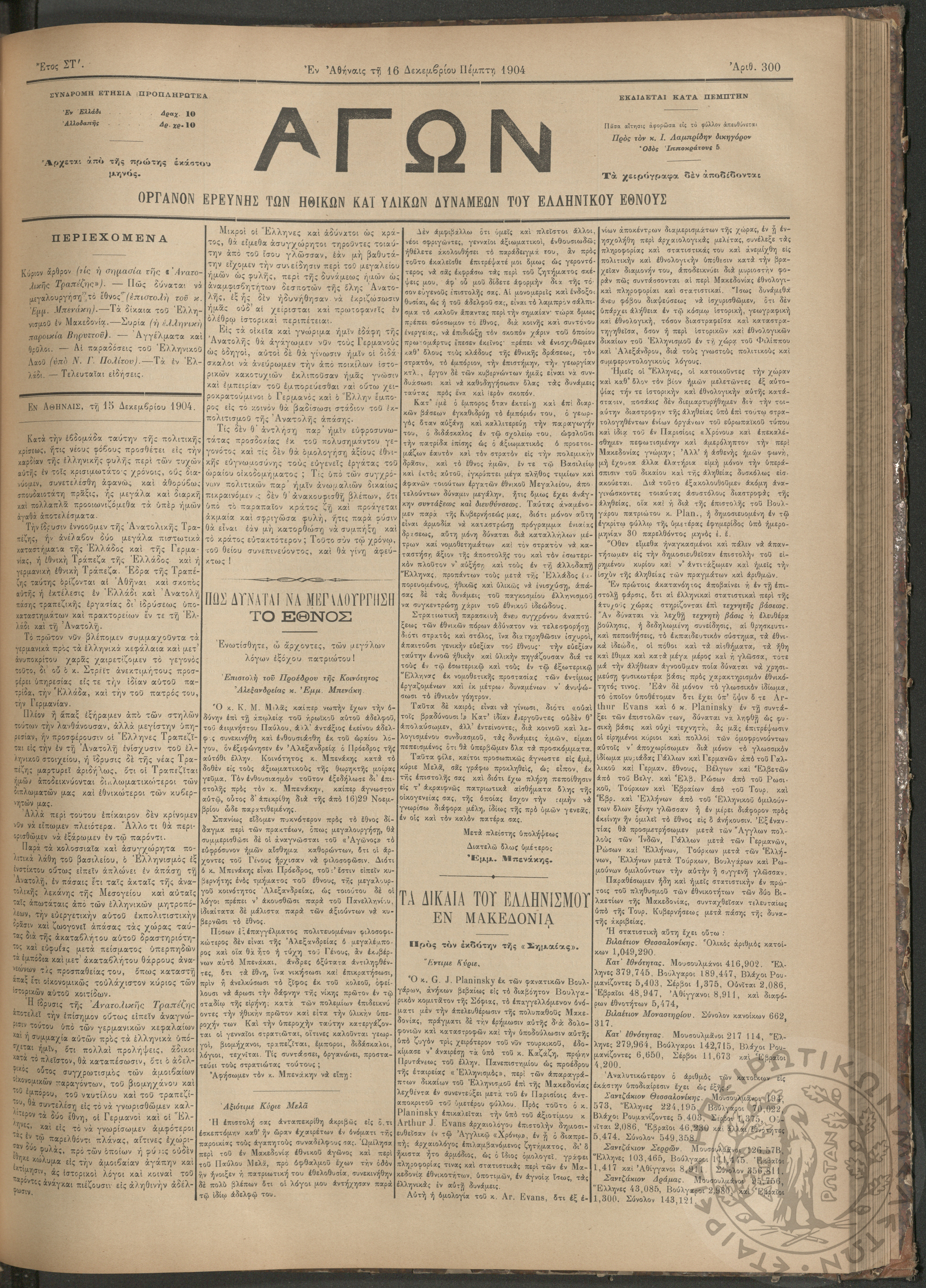 Αγών: Όργανον ερεύνης των ηθικών και υλικών δυνάμεων του Ελληνικού Έθνους, 1904 (Φ. 300)Έτος ΣΤ΄, Φ. 300...