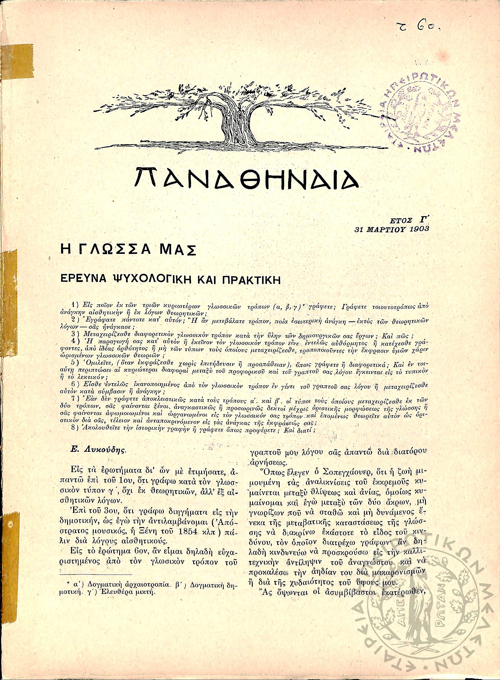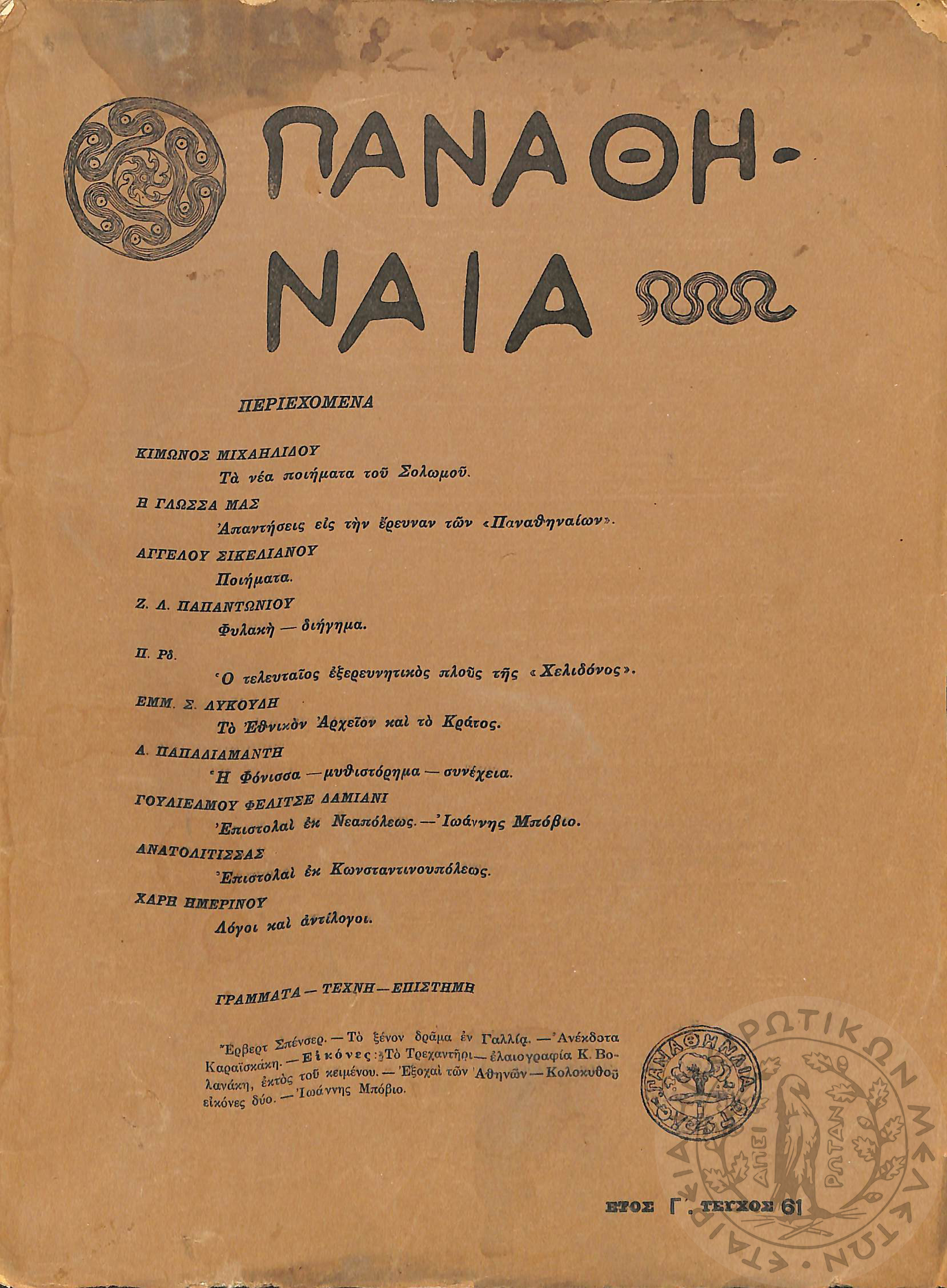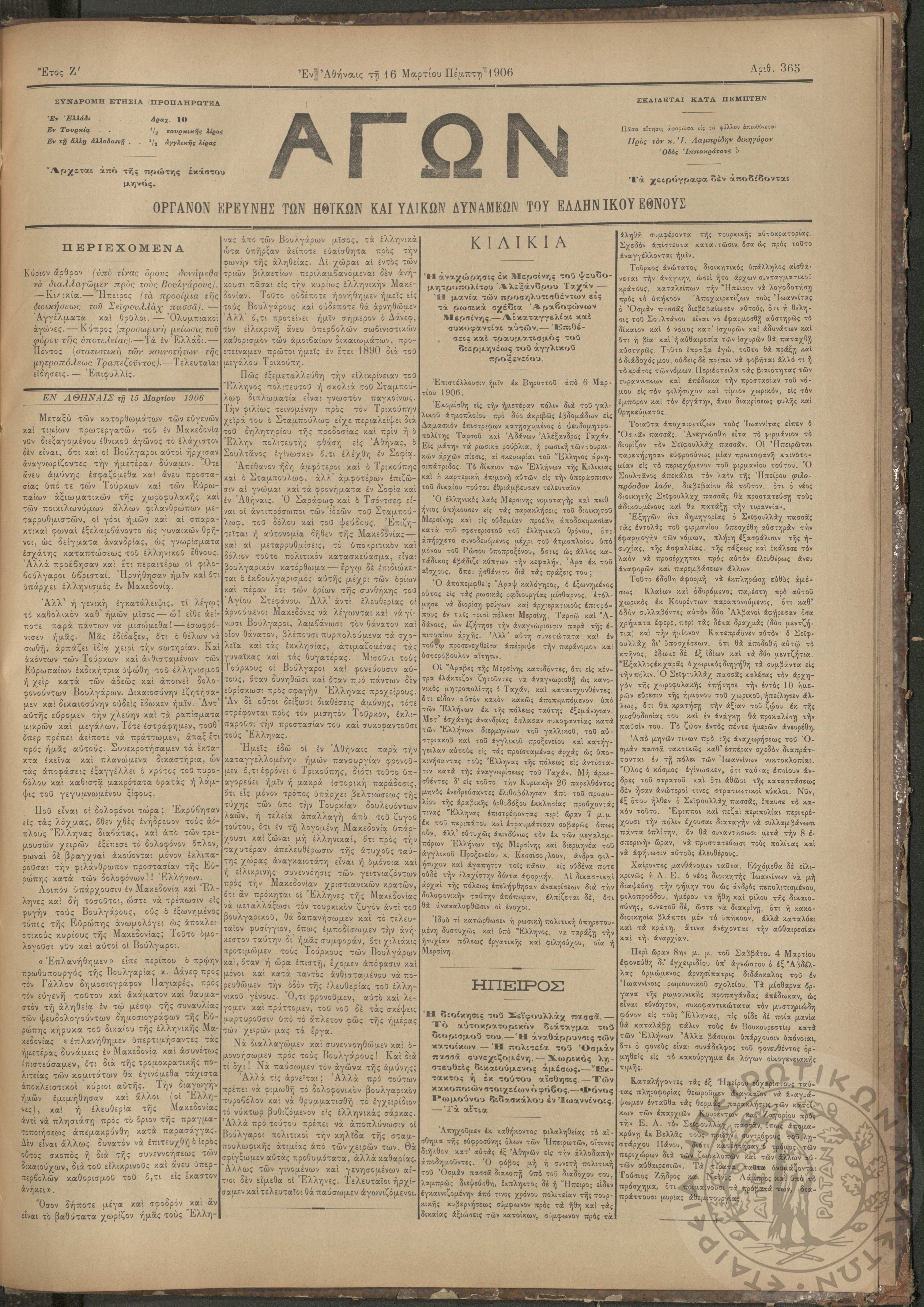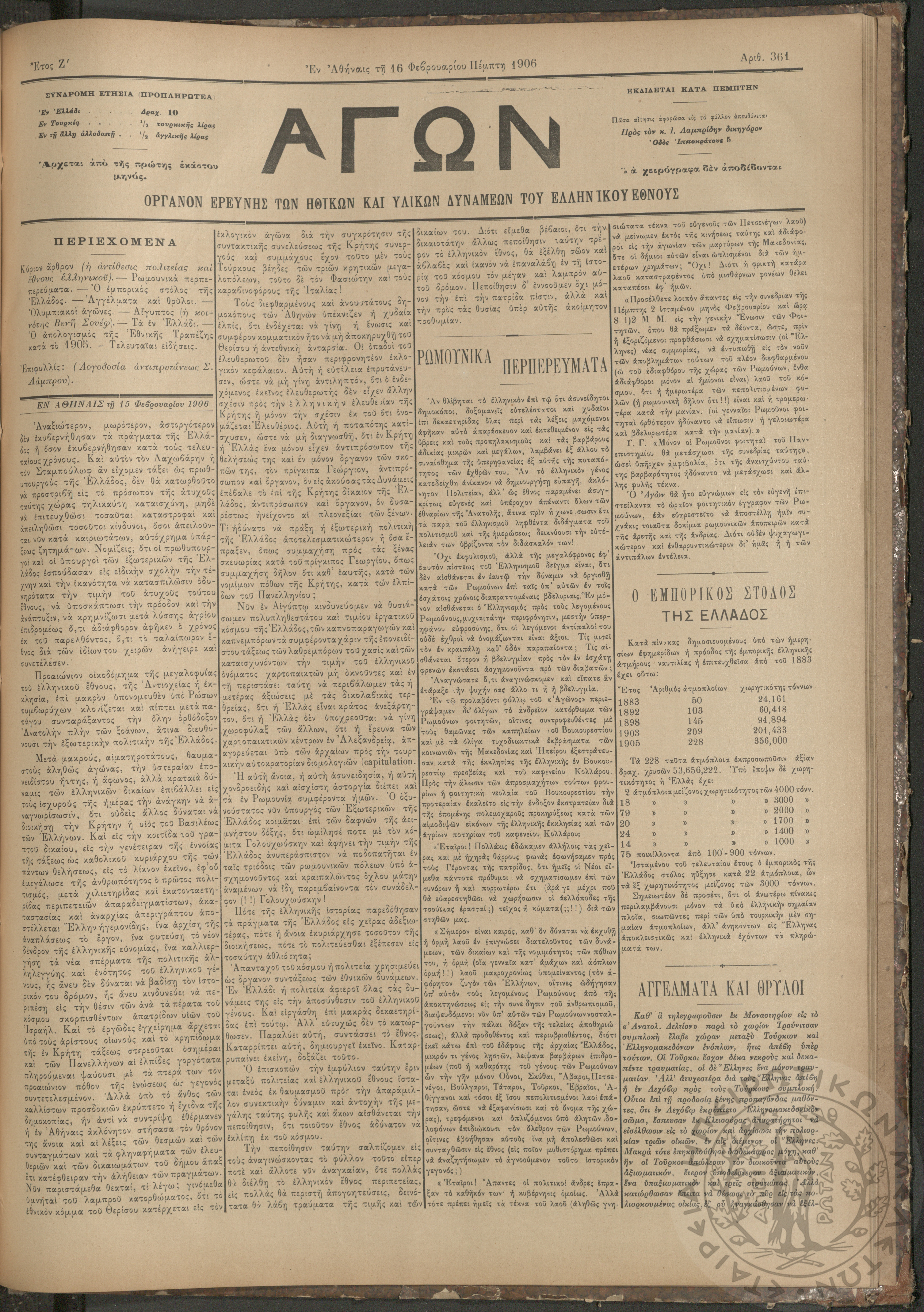 Αγών: Όργανον ερεύνης των ηθικών και υλικών δυνάμεων του Ελληνικού Έθνους, 1906 (Φ. 361)Έτος Ζ΄, Φ. 361...