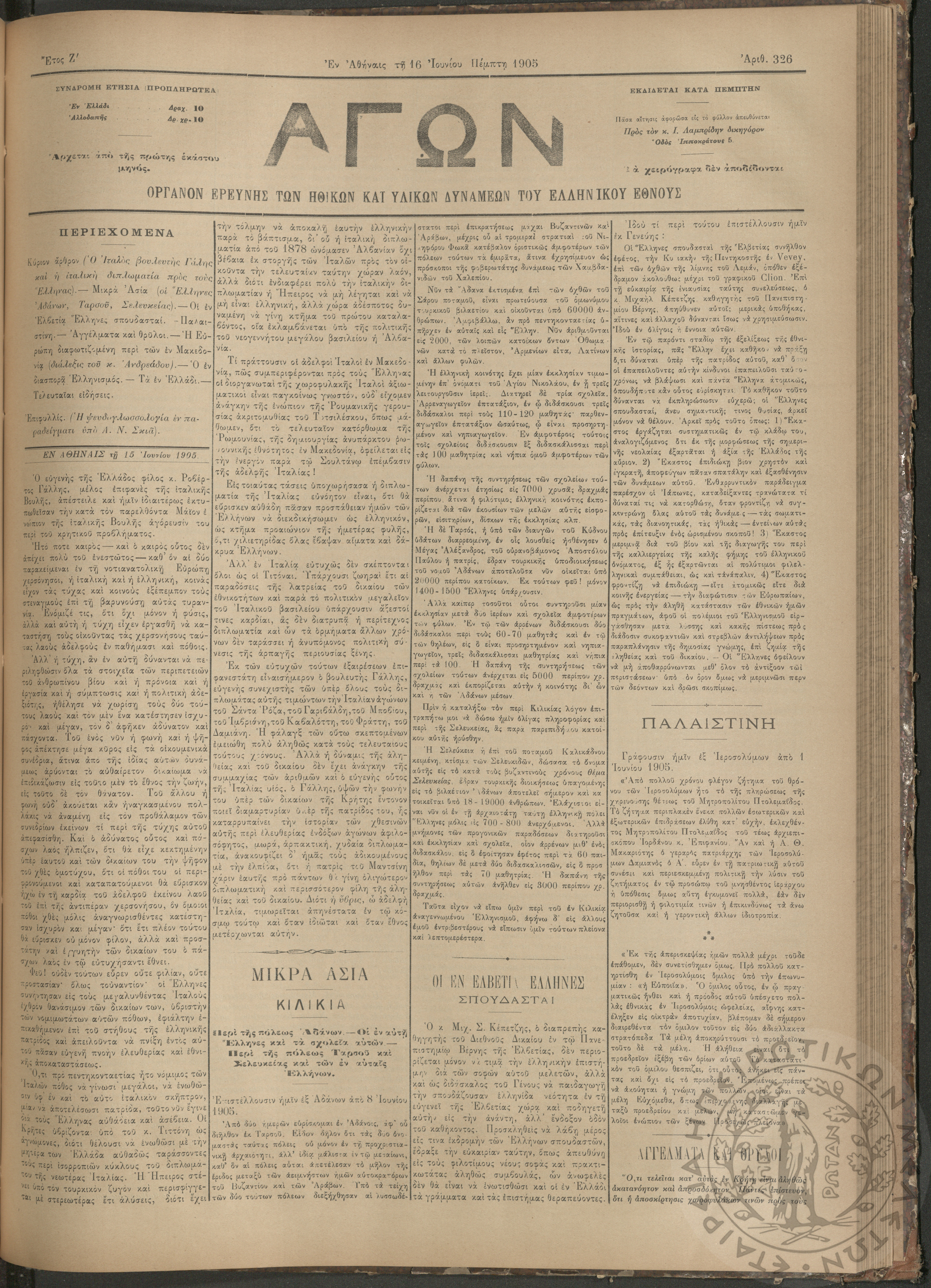 Αγών: Όργανον ερεύνης των ηθικών και υλικών δυνάμεων του Ελληνικού Έθνους, 1905 (Φ. 326)Έτος Ζ΄, Φ.326...