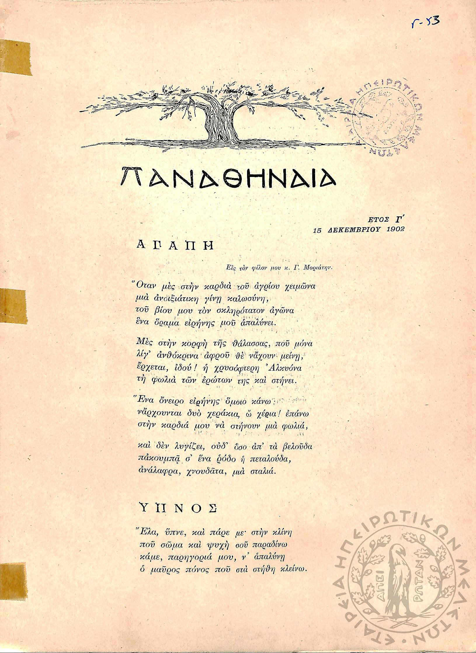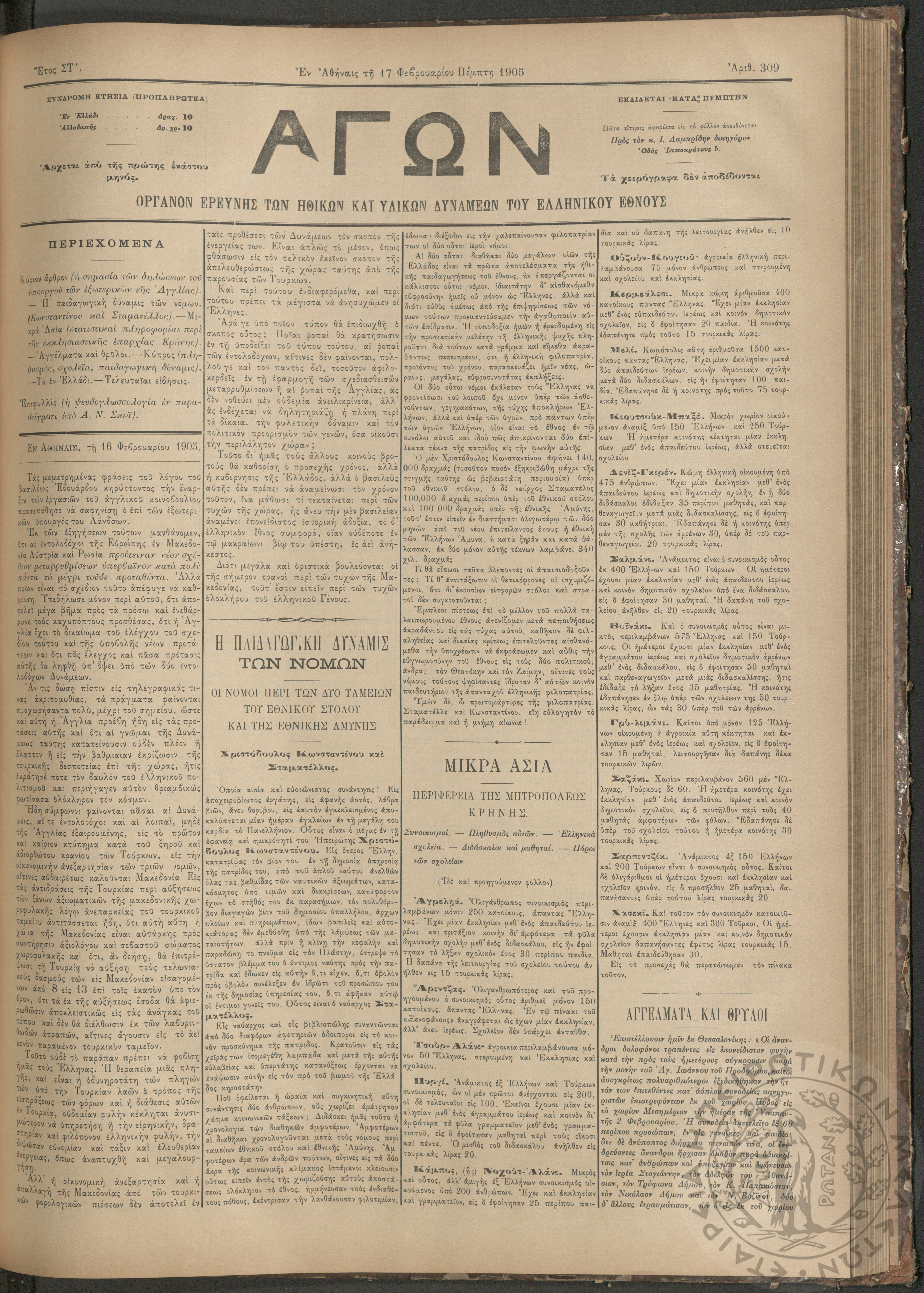 Αγών: Όργανον ερεύνης των ηθικών και υλικών δυνάμεων του Ελληνικού Έθνους, 1905 (Φ. 309)Έτος ΣΤ΄, Φ. 309...