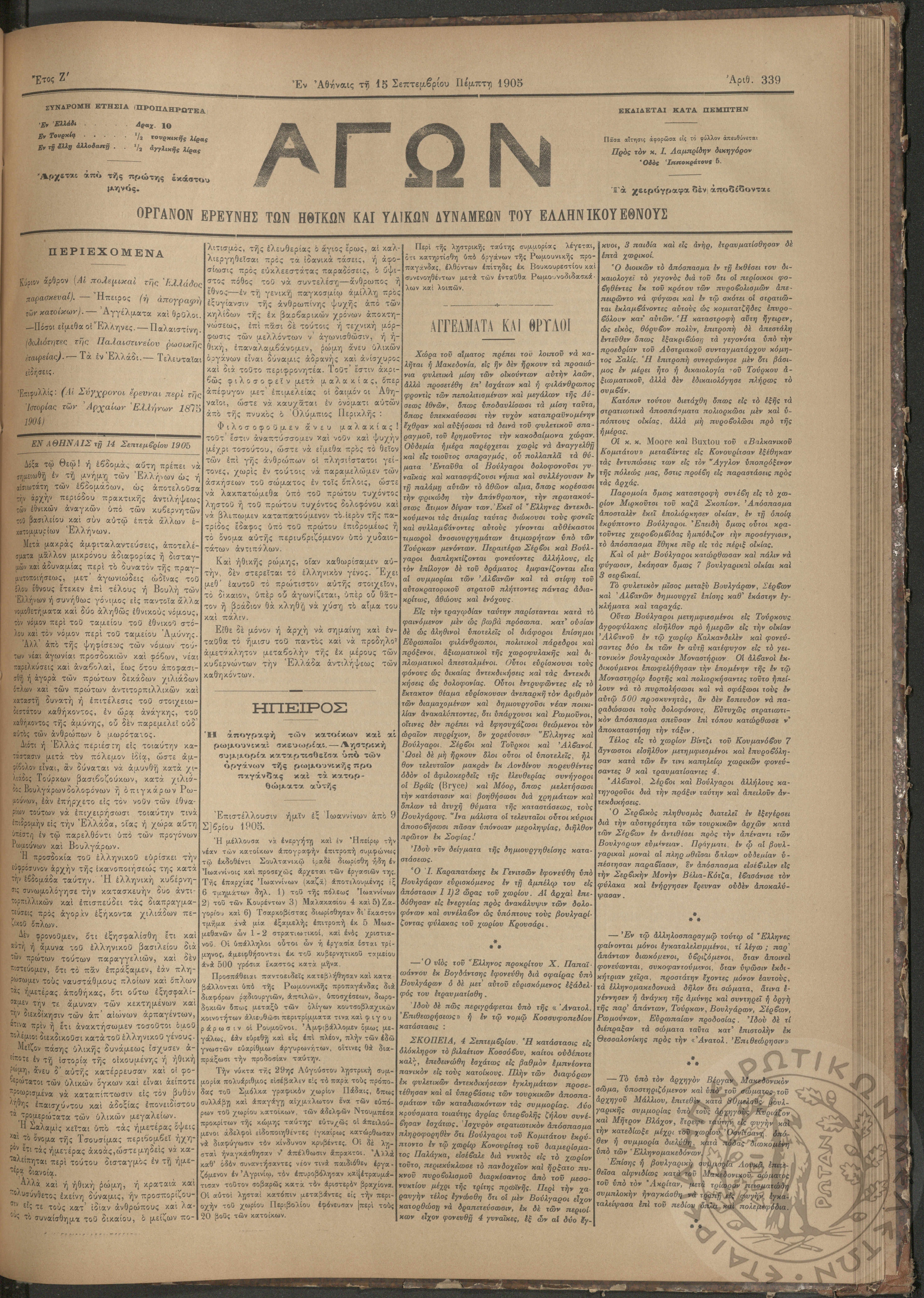 Αγών: Όργανον ερεύνης των ηθικών και υλικών δυνάμεων του Ελληνικού Έθνους, 1905 (Φ. 339)Έτος Ζ΄, Φ.339...