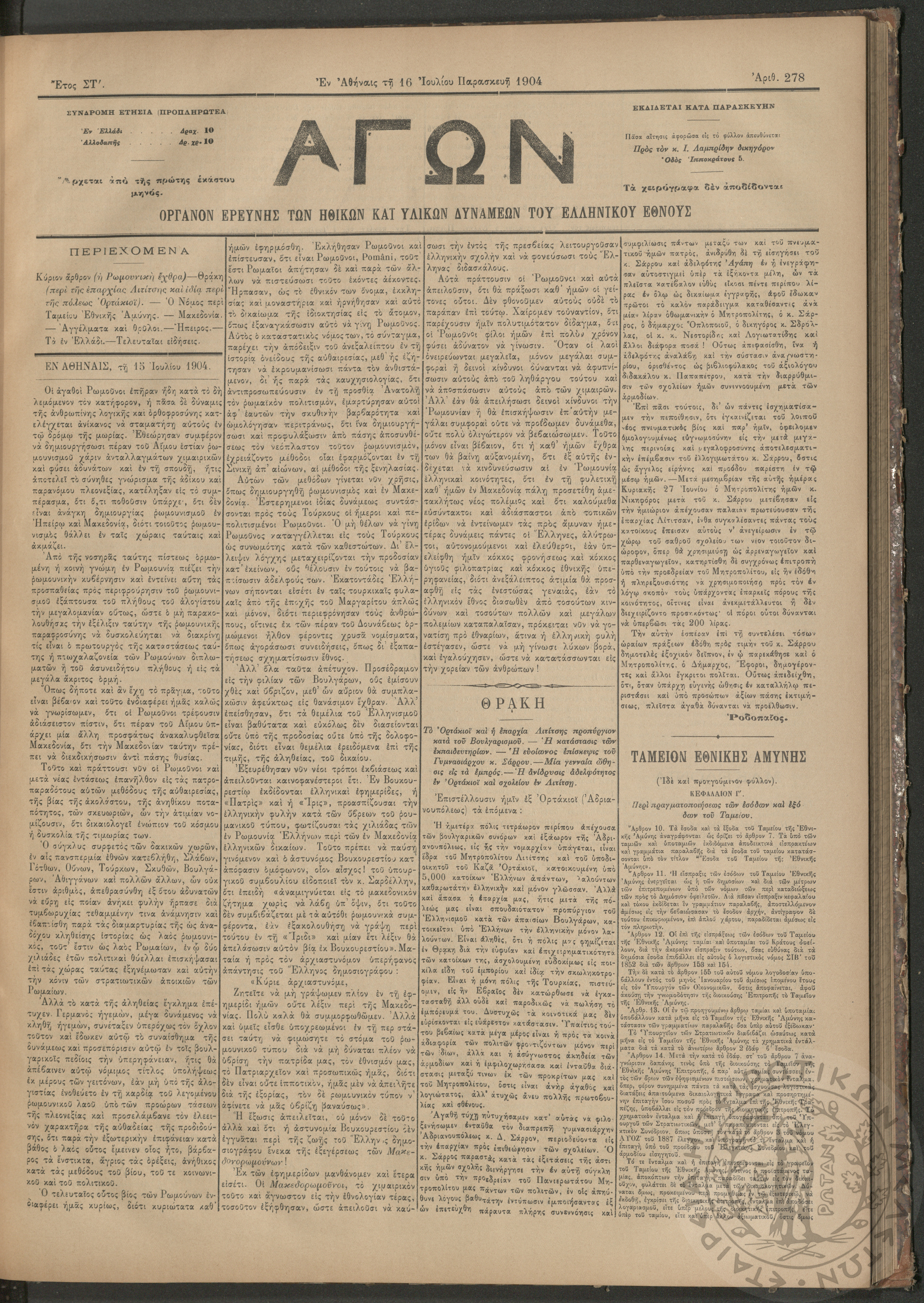 Αγών: Όργανον ερεύνης των ηθικών και υλικών δυνάμεων του Ελληνικού Έθνους, 1904 (Φ. 278)Έτος ΣΤ΄, Φ. 278...