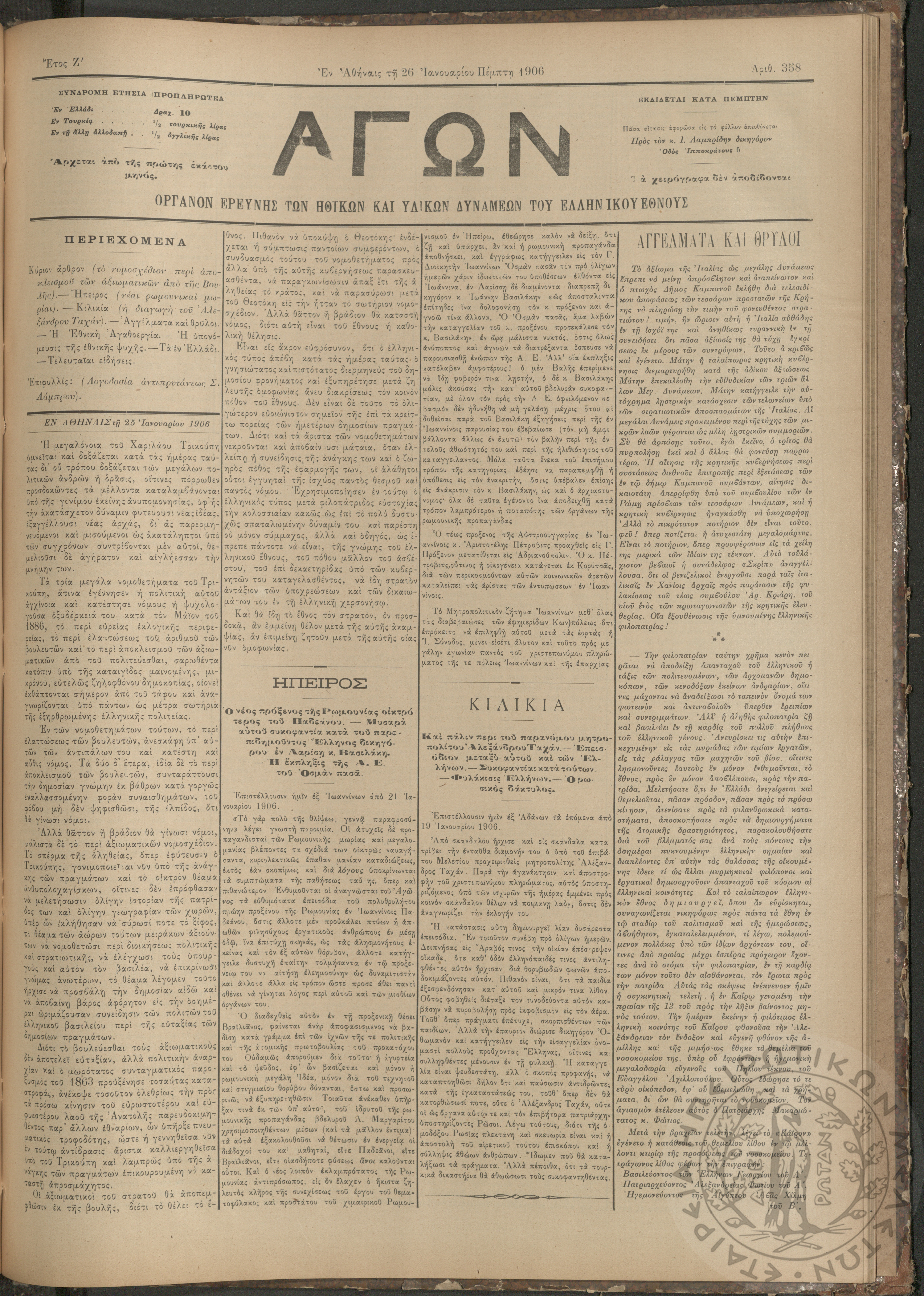 Αγών: Όργανον ερεύνης των ηθικών και υλικών δυνάμεων του Ελληνικού Έθνους, 1906 (Φ. 358)Έτος Ζ΄, Φ. 358...