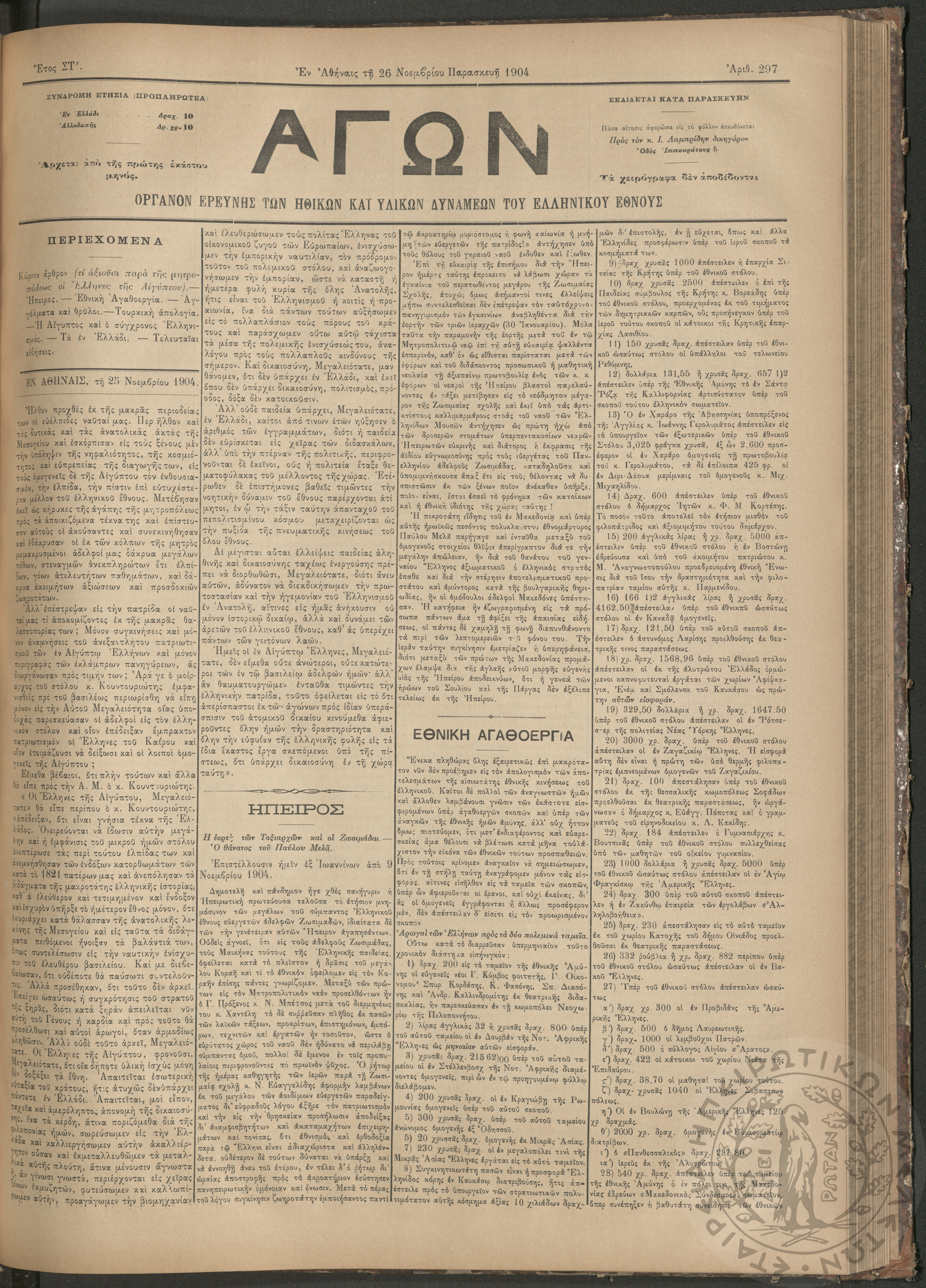 Αγών: Όργανον ερεύνης των ηθικών και υλικών δυνάμεων του Ελληνικού Έθνους, 1904 (Φ. 297)Έτος ΣΤ΄, Φ. 297...