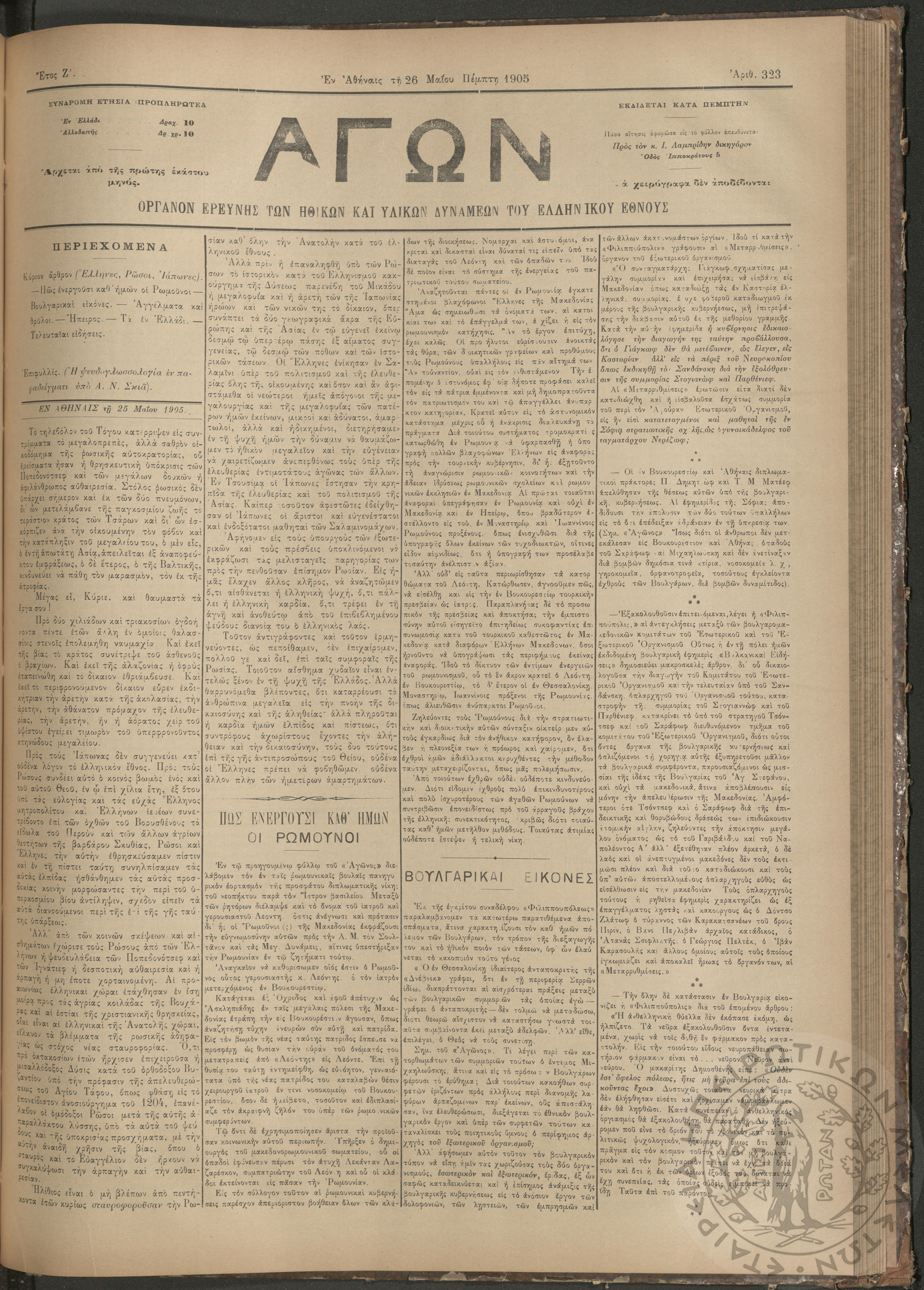 Αγών: Όργανον ερεύνης των ηθικών και υλικών δυνάμεων του Ελληνικού Έθνους, 1905 (Φ. 323)Έτος Ζ΄, Φ.323...