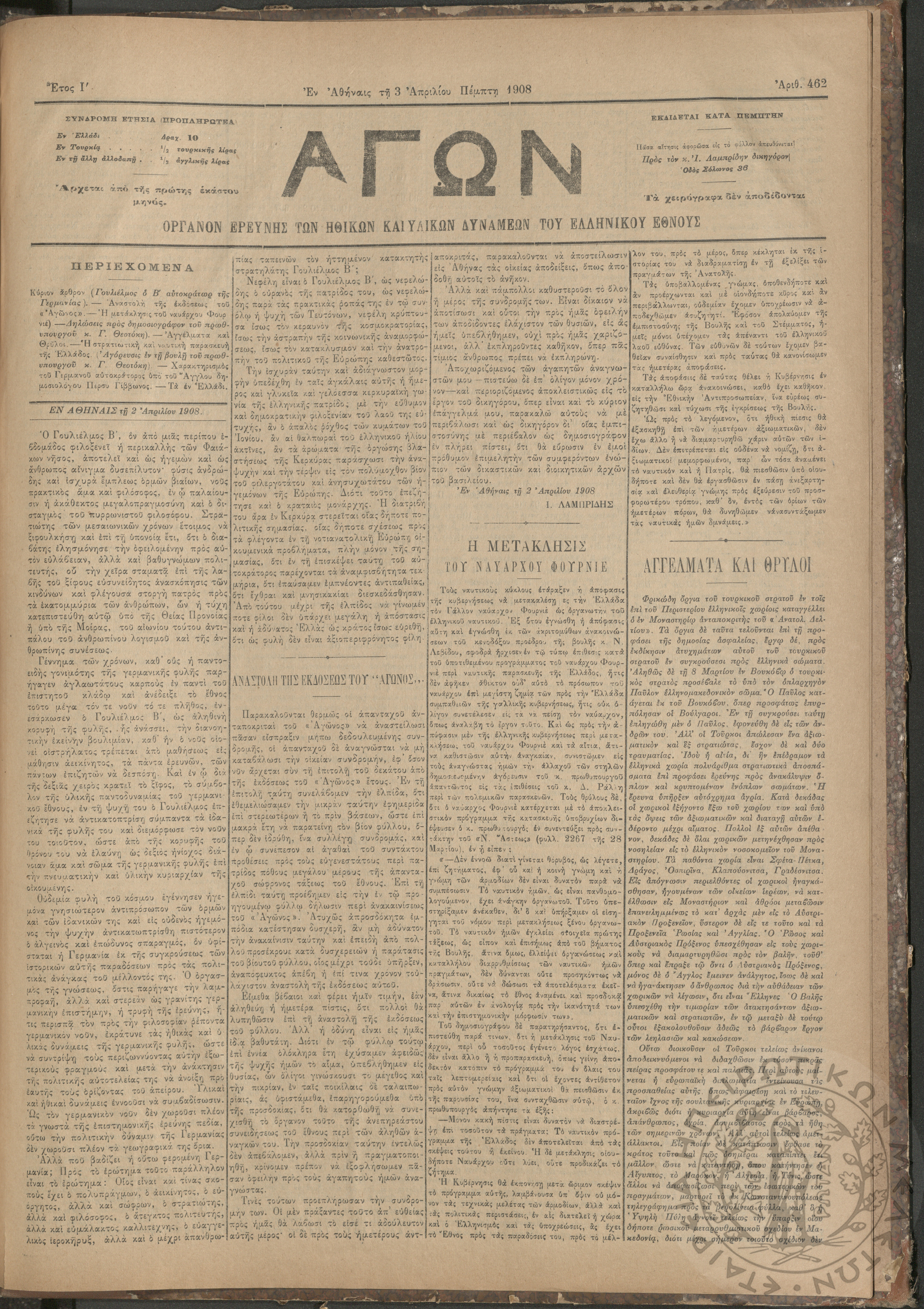 Αγών: Όργανον ερεύνης των ηθικών και υλικών δυνάμεων του Ελληνικού Έθνους, 1908 (Φ. 462)Έτος Ι΄, Φ. 462...