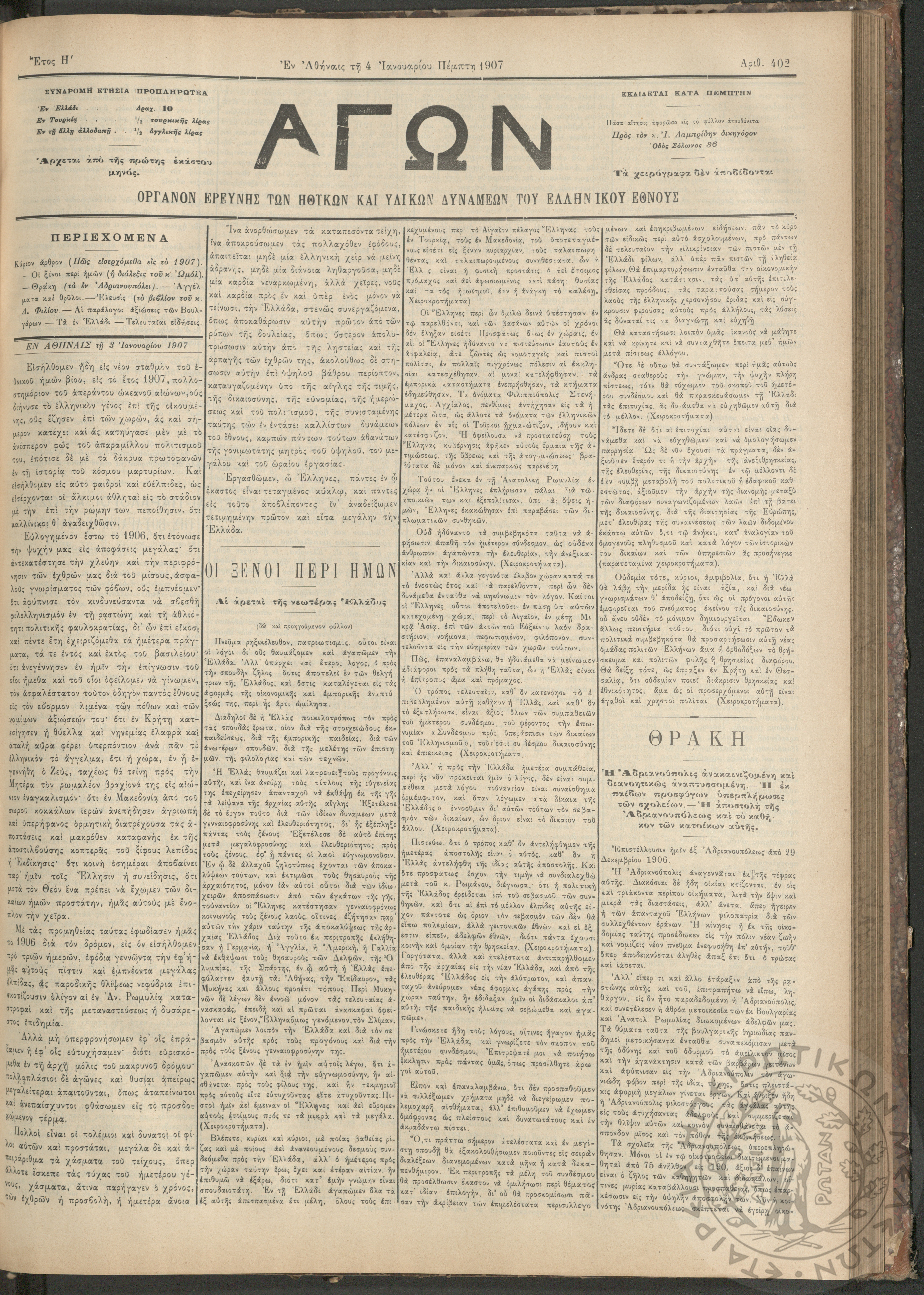 Αγών: Όργανον ερεύνης των ηθικών και υλικών δυνάμεων του Ελληνικού Έθνους, 1907 (Φ. 402)Έτος Η΄, Φ. 402...