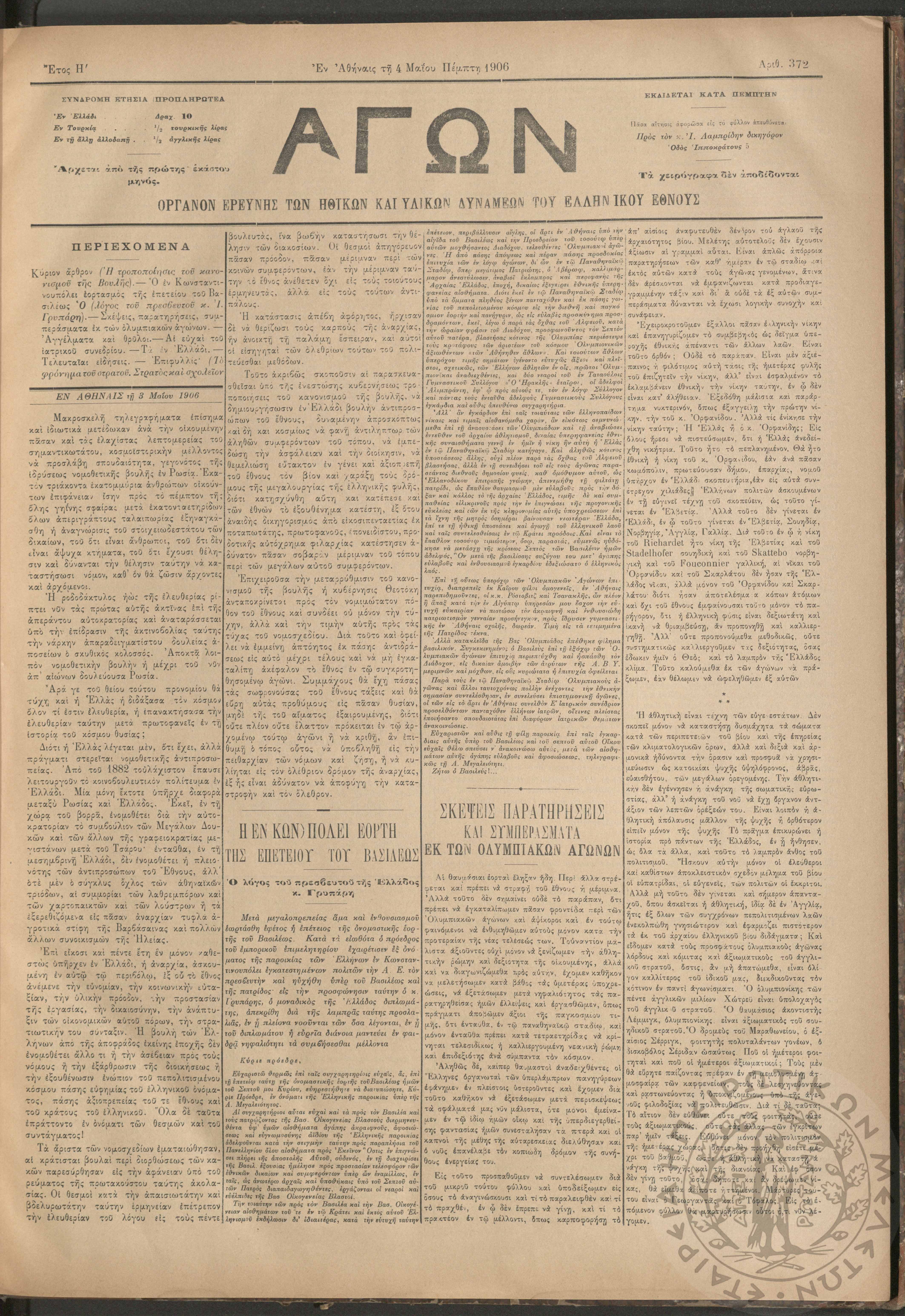Αγών: Όργανον ερεύνης των ηθικών και υλικών δυνάμεων του Ελληνικού Έθνους, 1906 (Φ. 372)Έτος Η΄, Φ. 372...