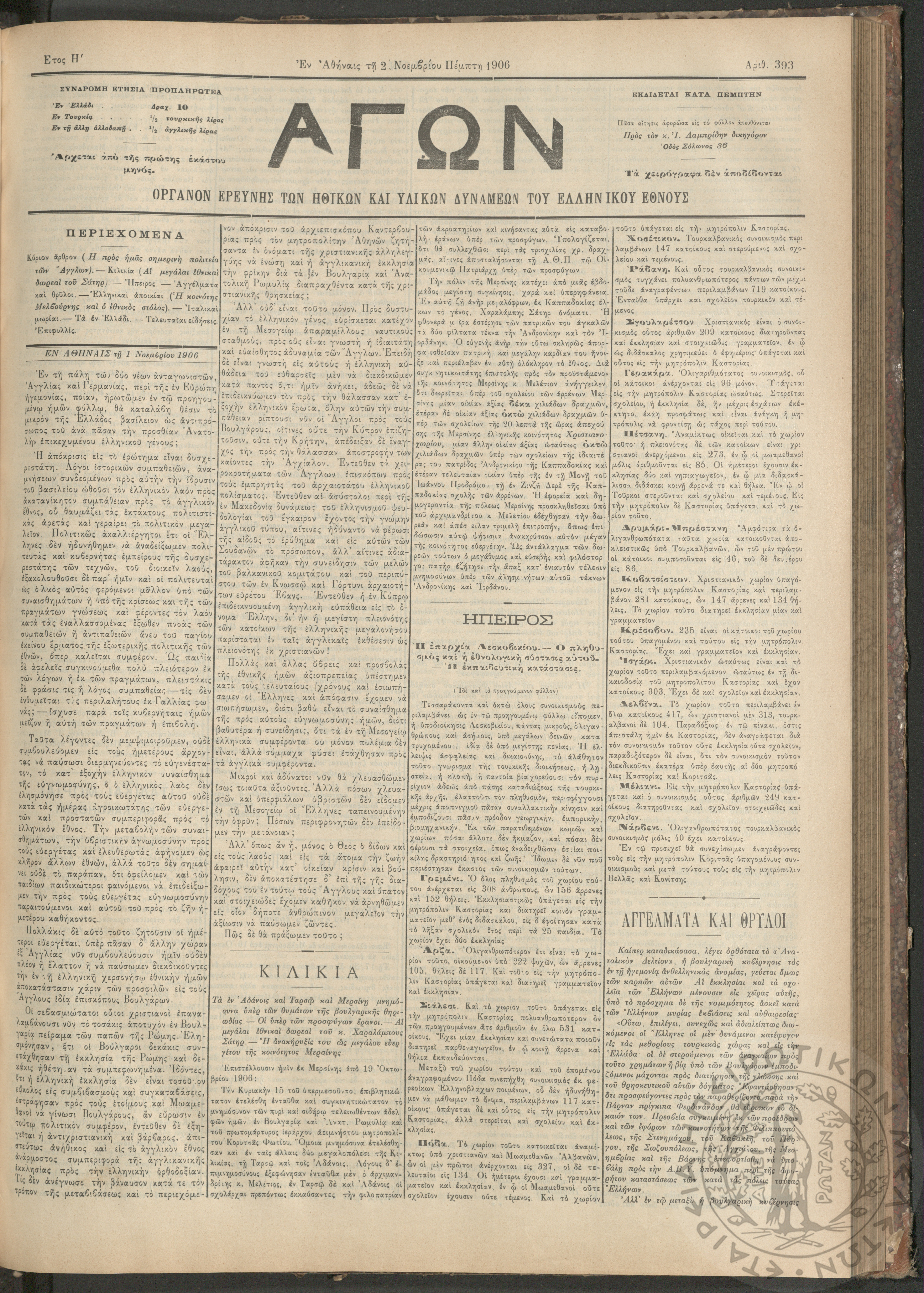 Αγών: Όργανον ερεύνης των ηθικών και υλικών δυνάμεων του Ελληνικού Έθνους, 1906 (Φ. 393)Έτος Η΄, Φ. 393...