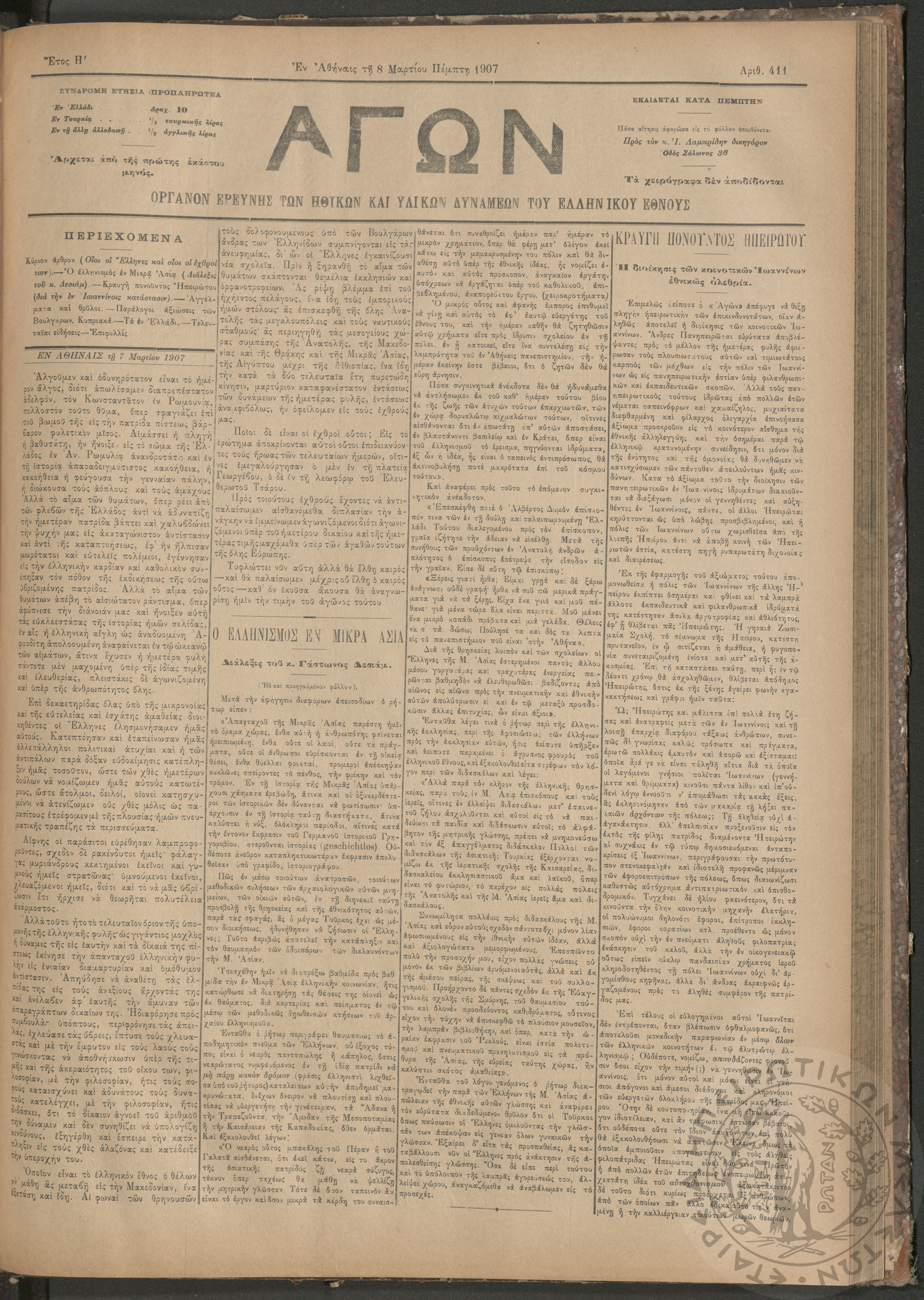 Αγών: Όργανον ερεύνης των ηθικών και υλικών δυνάμεων του Ελληνικού Έθνους, 1907 (Φ. 411)Έτος Η΄, Φ. 411...
