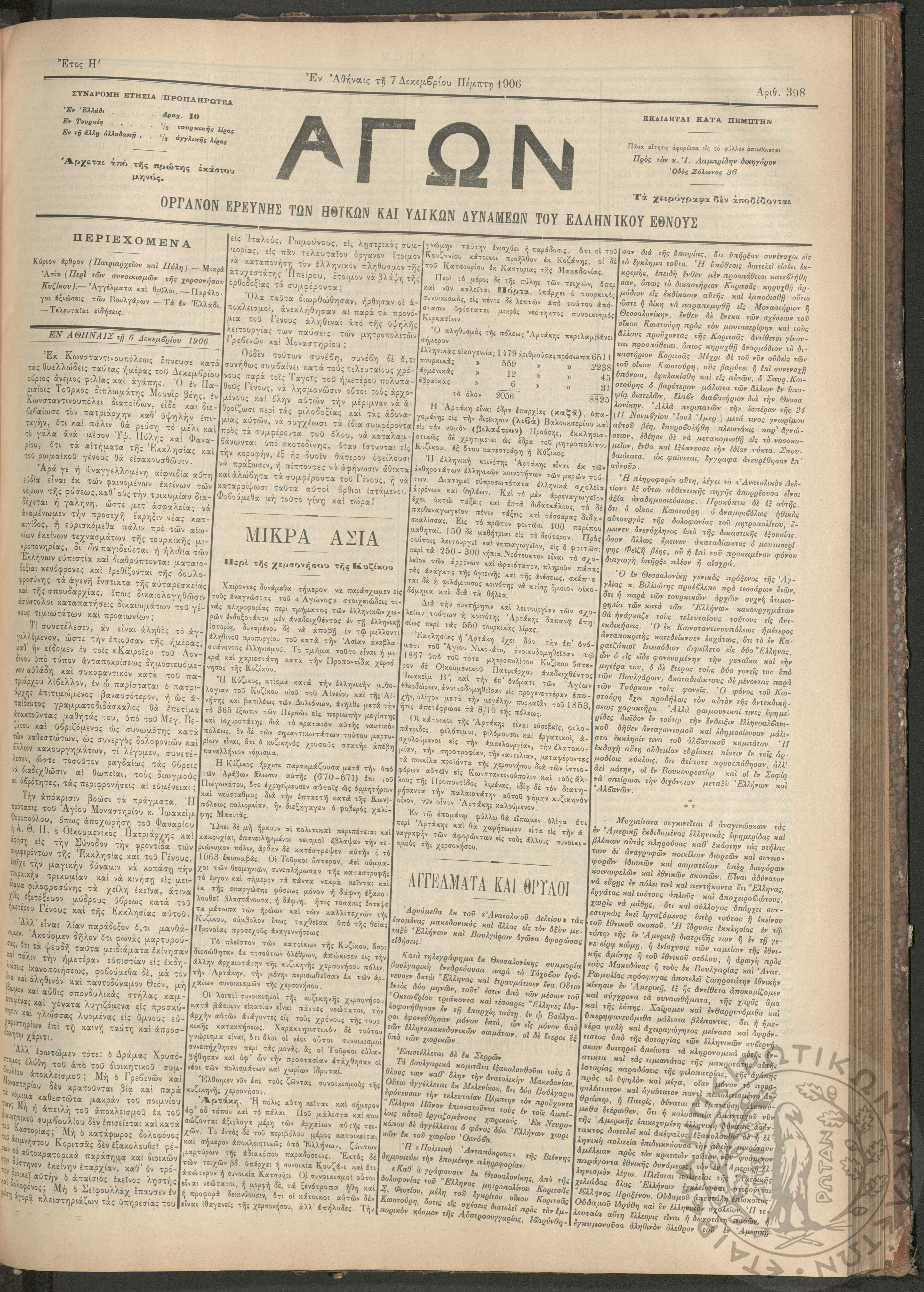 Αγών: Όργανον ερεύνης των ηθικών και υλικών δυνάμεων του Ελληνικού Έθνους. 1906 (Φ. 398)Έτος Η΄, Φ. 398...