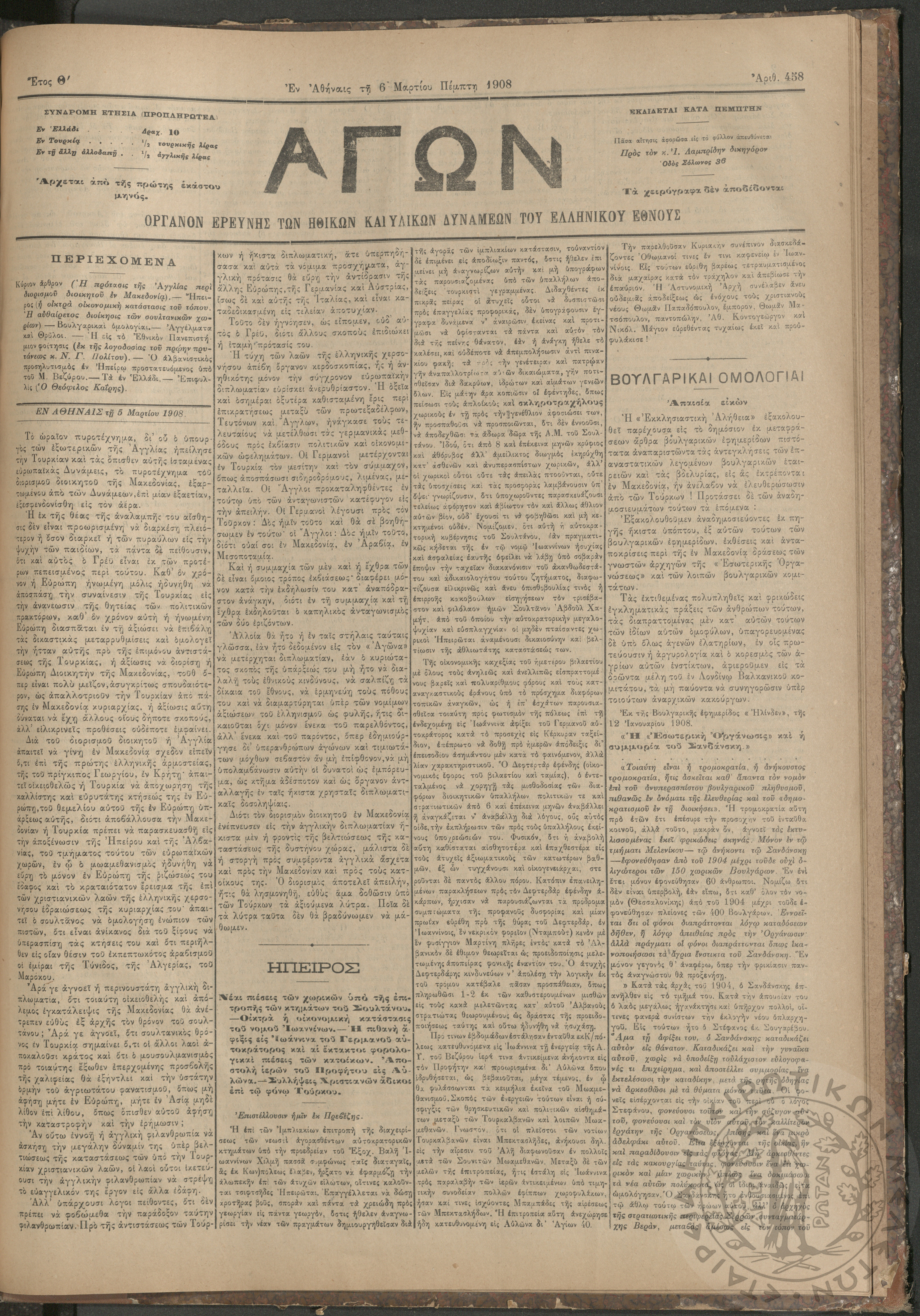 Αγών: Όργανον ερεύνης των ηθικών και υλικών δυνάμεων του Ελληνικού Έθνους, 1908 (Φ. 458)Έτος Θ΄, Φ. 458...