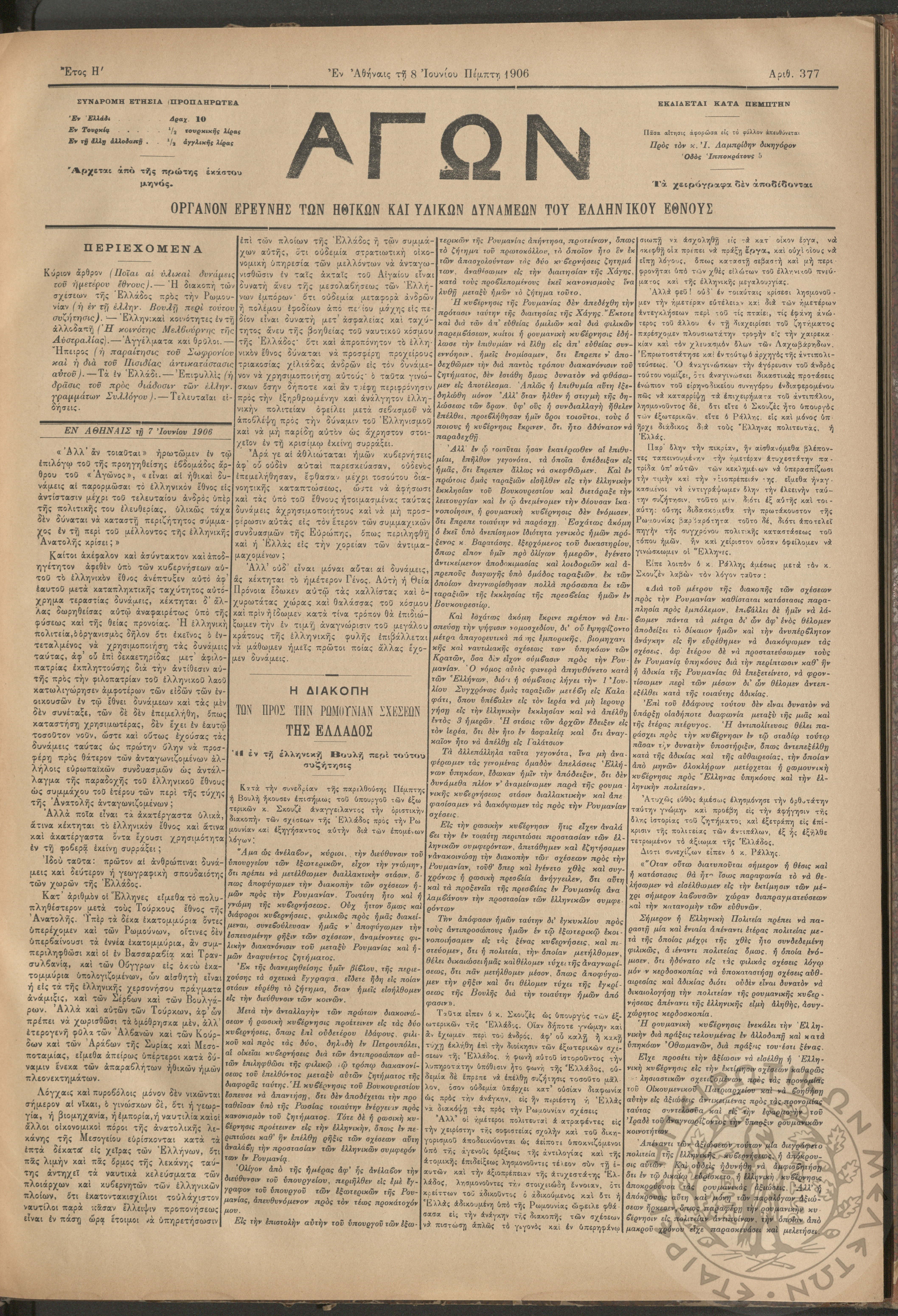 Αγών: Όργανον ερεύνης των ηθικών και υλικών δυνάμεων του Ελληνικού Έθνους, 1906 (Φ. 377)Έτος Η΄, Φ. 377...