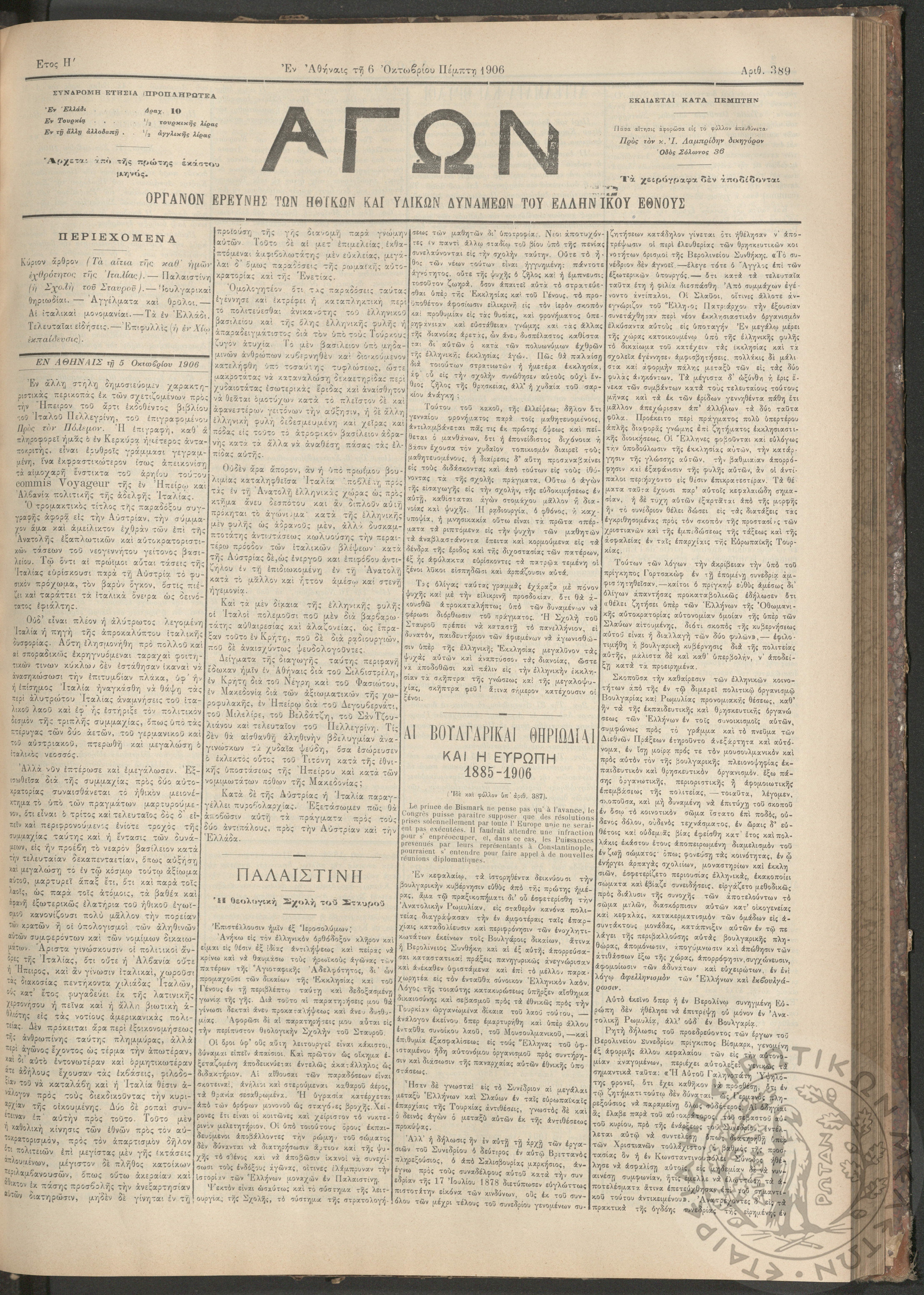 Αγών: Όργανον ερεύνης των ηθικών και υλικών δυνάμεων του Ελληνικού Έθνους, 1906 (Φ. 389)Έτος Η΄, Φ. 389...
