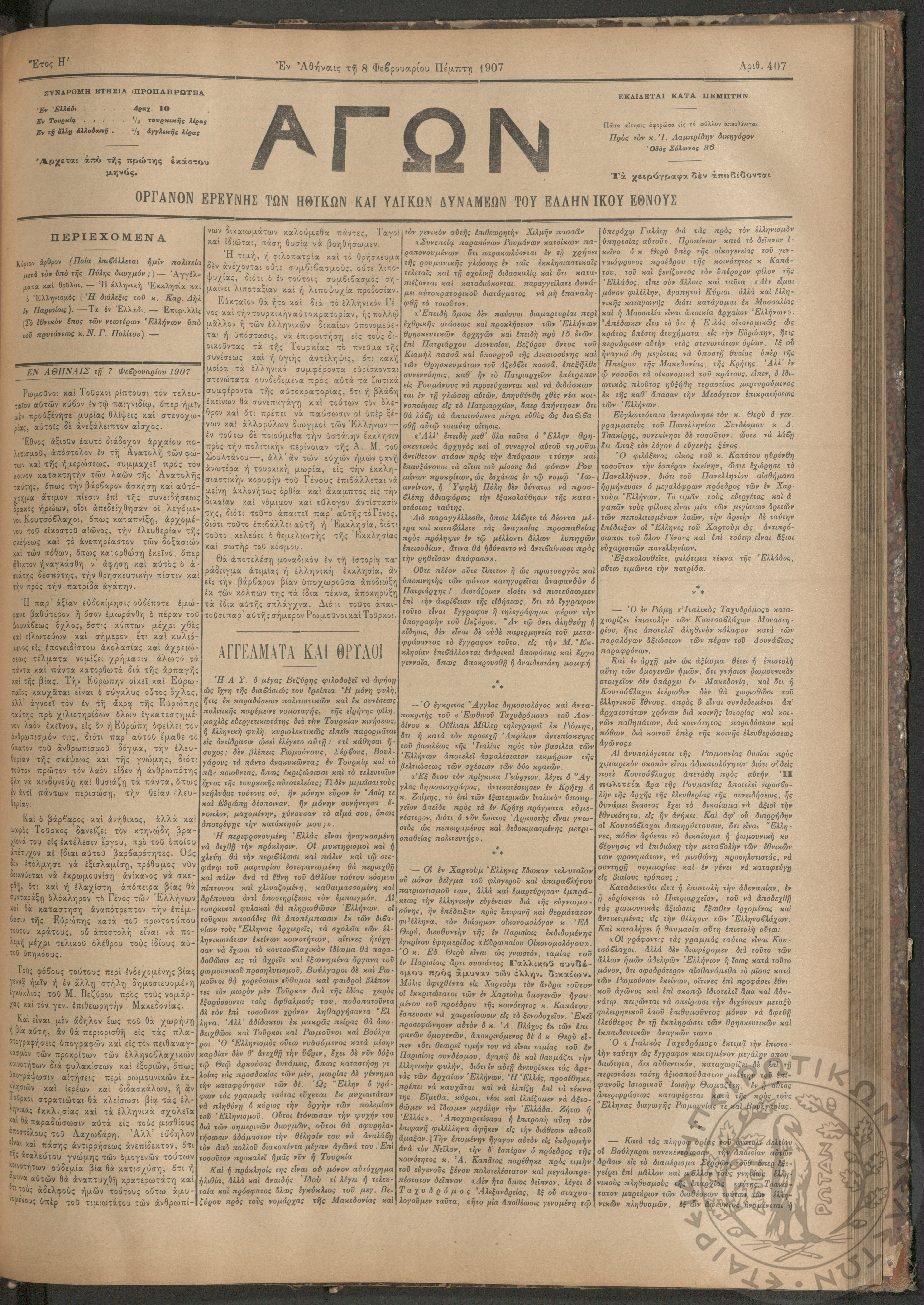 Αγών: Όργανον ερεύνης των ηθικών και υλικών δυνάμεων του Ελληνικού Έθνους, 1907 (Φ. 407)Έτος Η΄, Φ. 407...