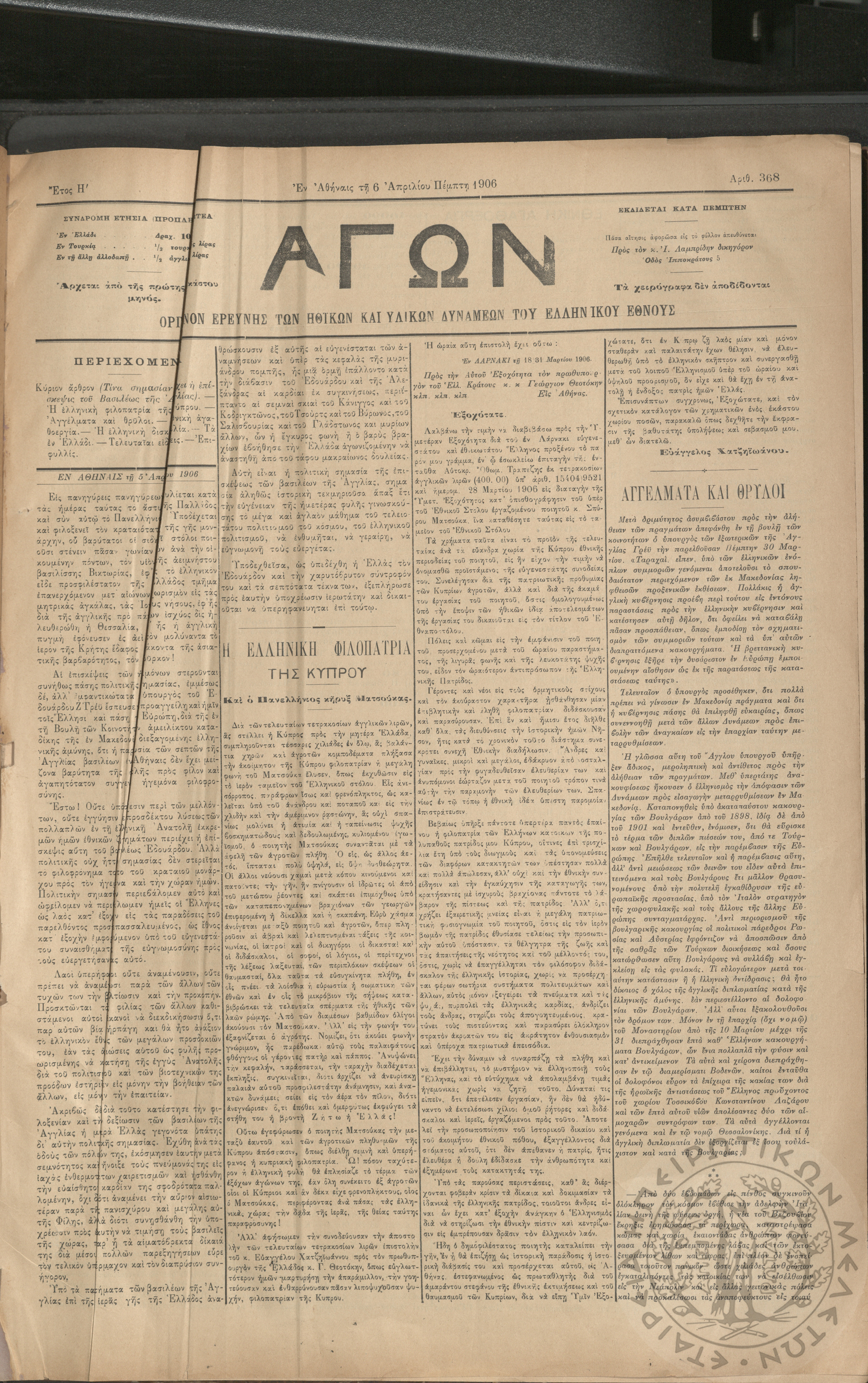 Αγών: Όργανον ερεύνης των ηθικών και υλικών δυνάμεων του Ελληνικού Έθνους, 1906 (Φ. 368)Έτος Η΄, Φ. 368...