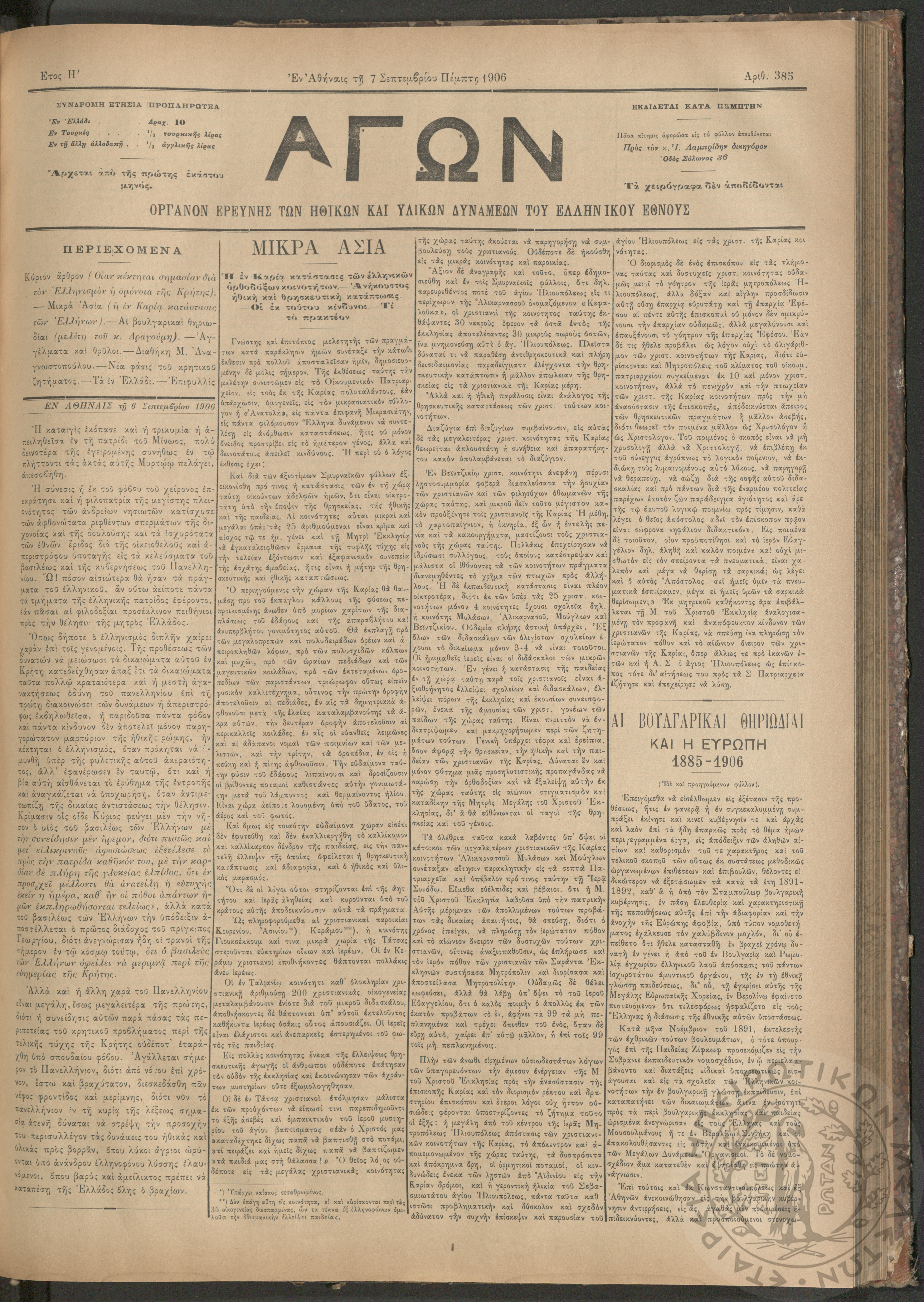 Αγών: Όργανον ερεύνης των ηθικών και υλικών δυνάμεων του Ελληνικού Έθνους, 1906 (Φ. 385)Έτος Η΄, Φ. 385...