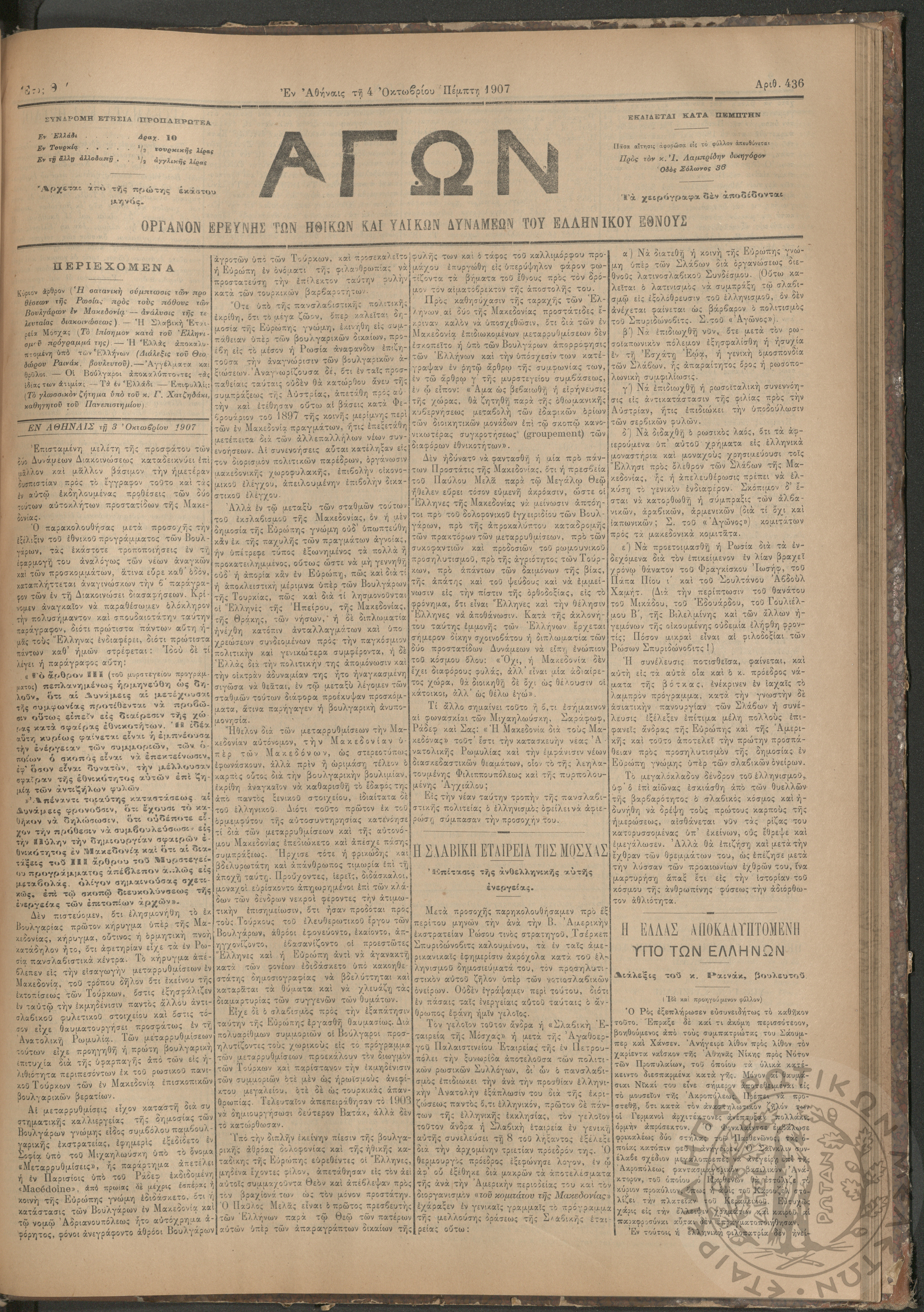 Αγών: Όργανον ερεύνης των ηθικών και υλικών δυνάμεων του Ελληνικού Έθνους, 1907 (Φ. 436)Έτος Θ΄, Φ. 436...