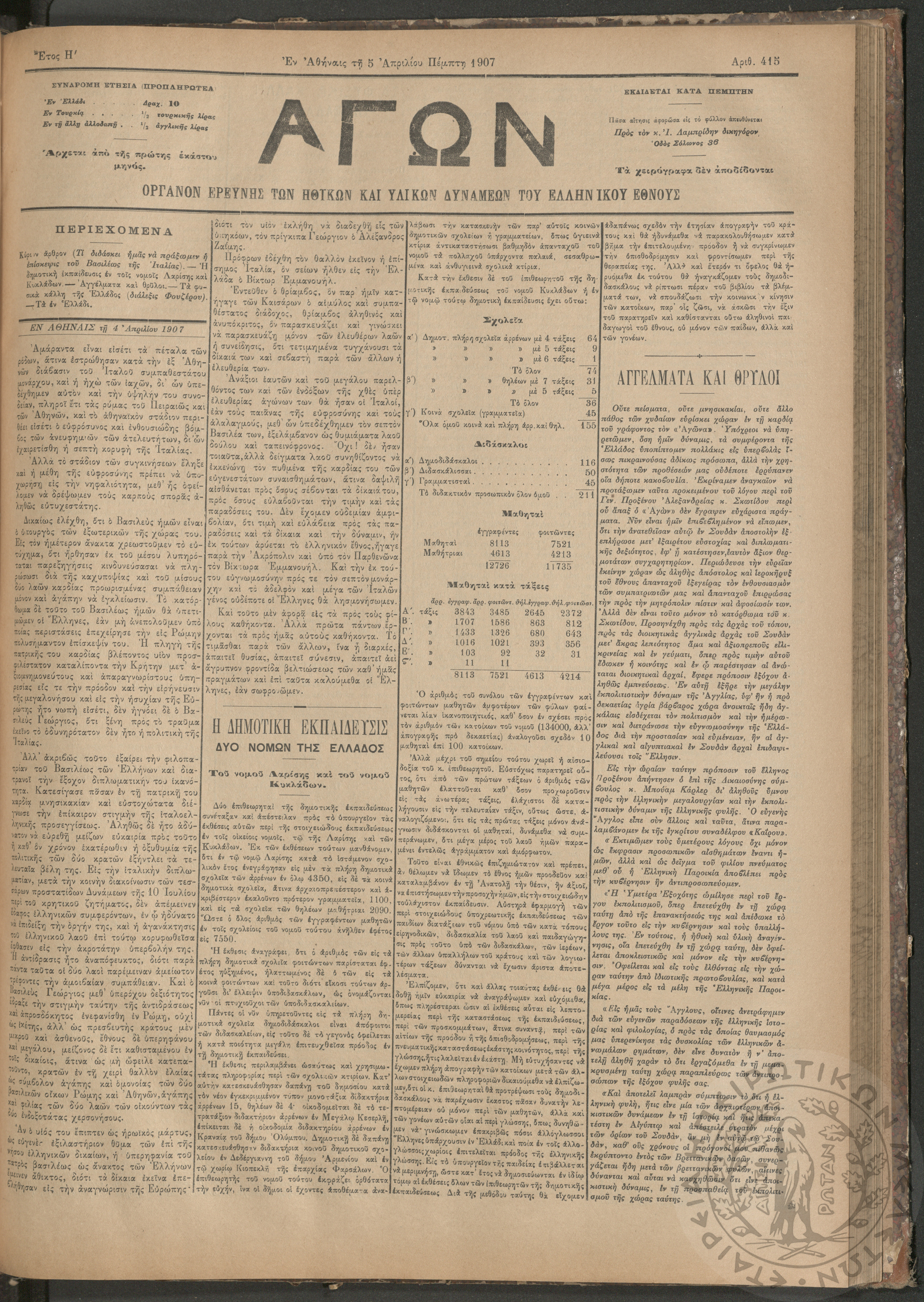 Αγών: Όργανον ερεύνης των ηθικών και υλικών δυνάμεων του Ελληνικού Έθνους, 1907 (Φ. 415)Έτος Η΄, Φ. 415...