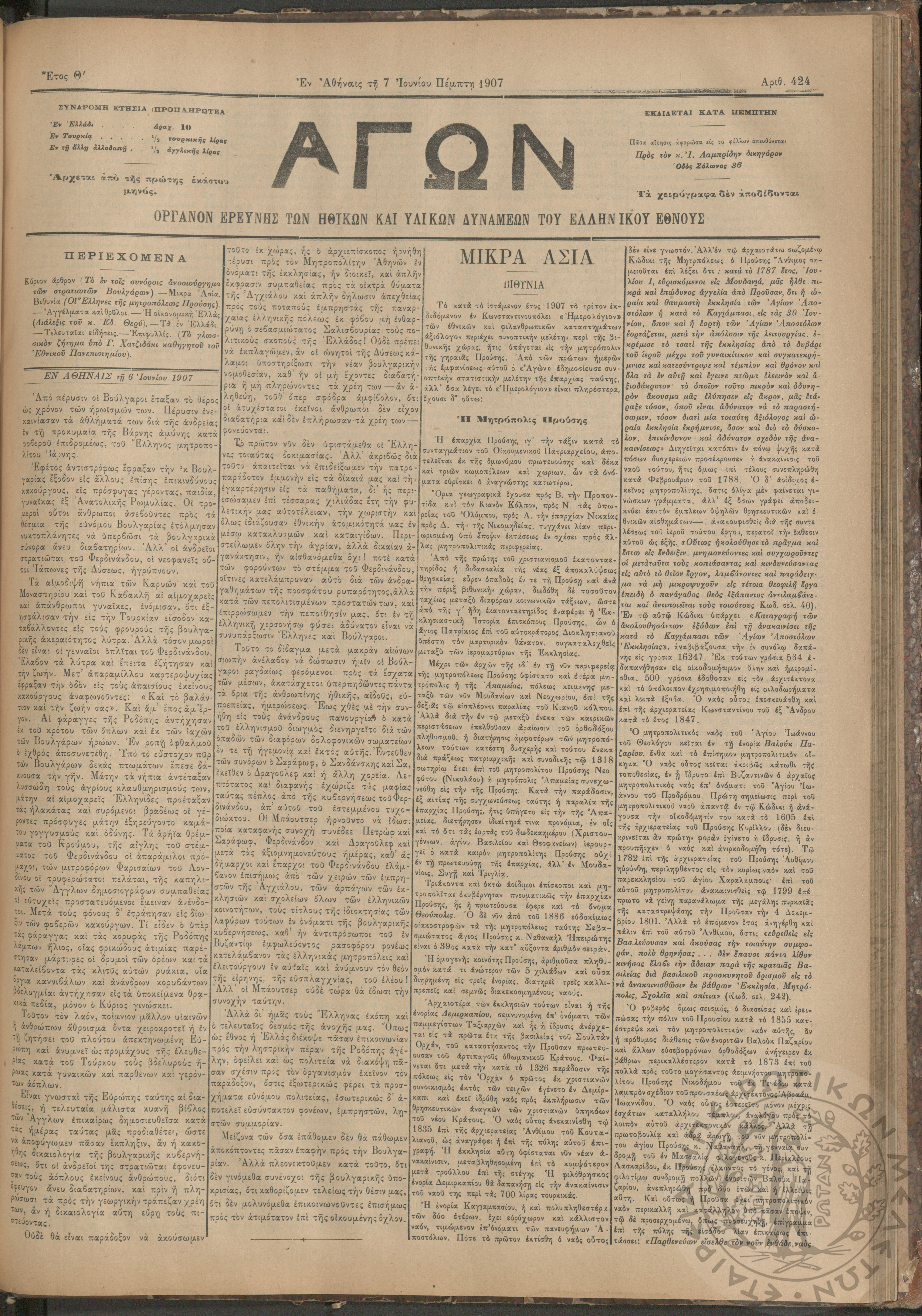 Αγών: Όργανον ερεύνης των ηθικών και υλικών δυνάμεων του Ελληνικού Έθνους, 1907 (Φ. 424)Έτος Θ΄, Φ. 424...