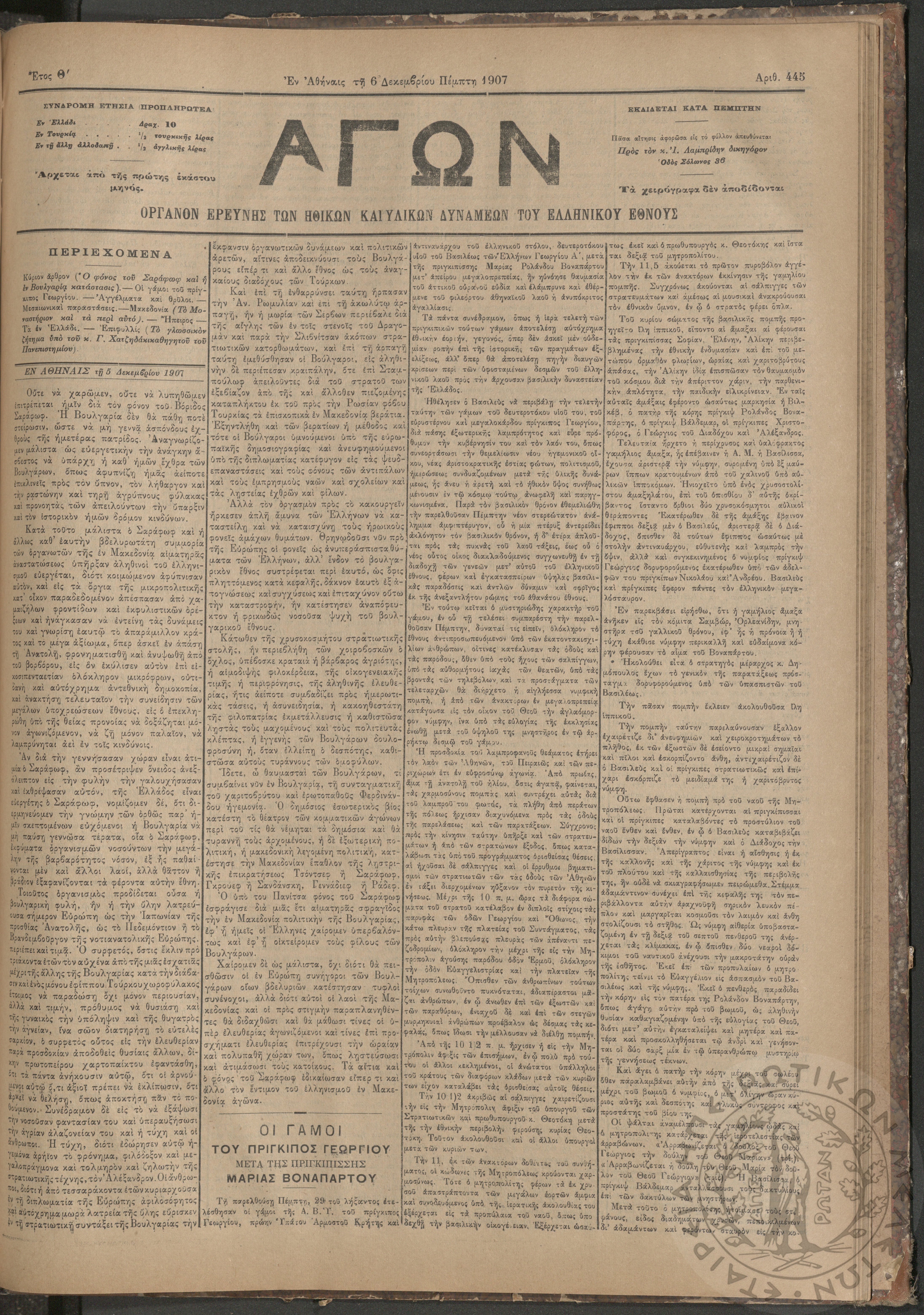Αγών: Όργανον ερεύνης των ηθικών και υλικών δυνάμεων του Ελληνικού Έθνους, 1907 (Φ. 445)Έτος Θ΄, Φ.445...