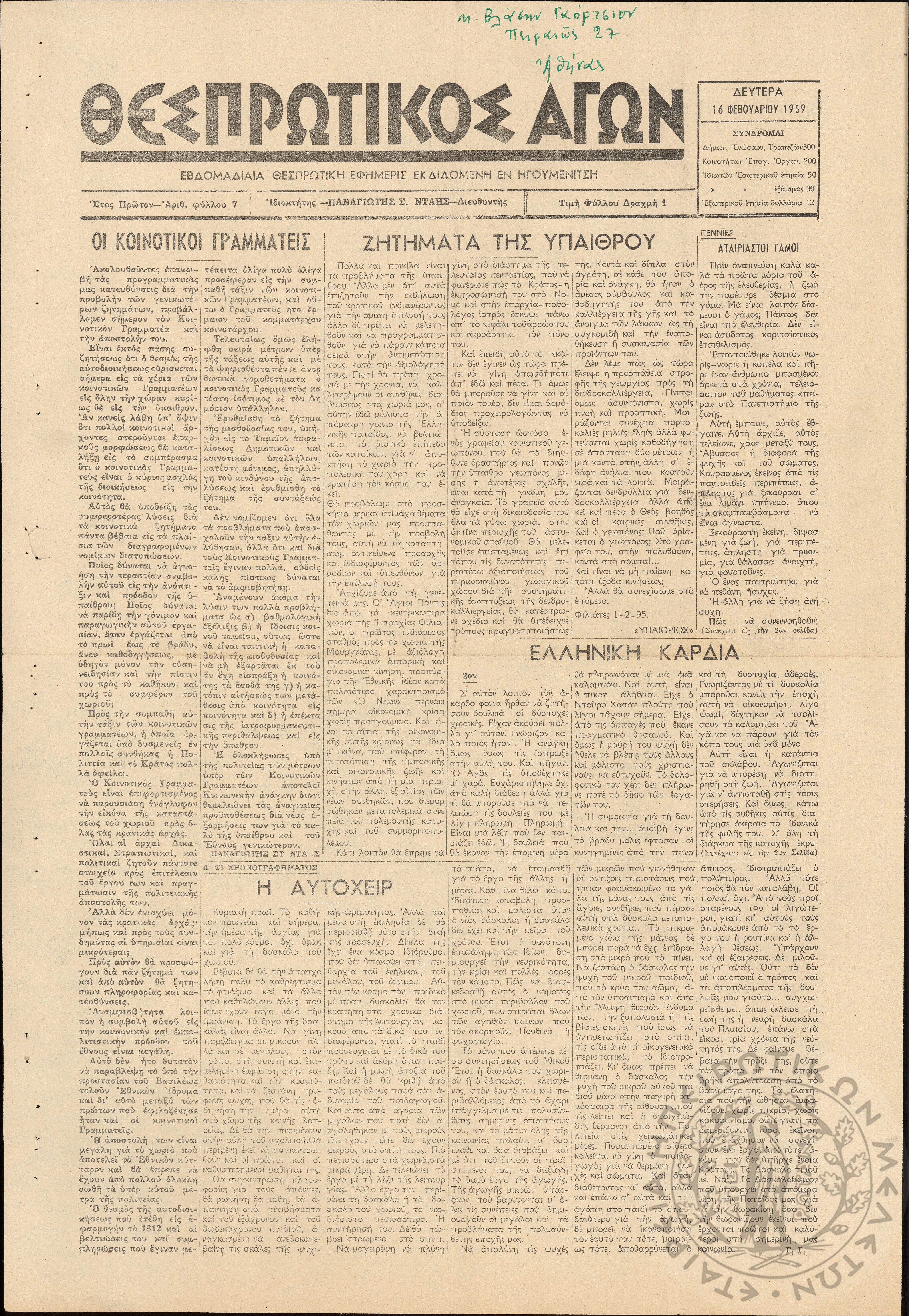 Θεσπρωτικός Αγών: εβδομαδιαία Θεσπρωτική εφημερίς εκδιδομένη εν Ηγουμενίτση, 1959, φ. 7Έτος Α΄, φ. 7...