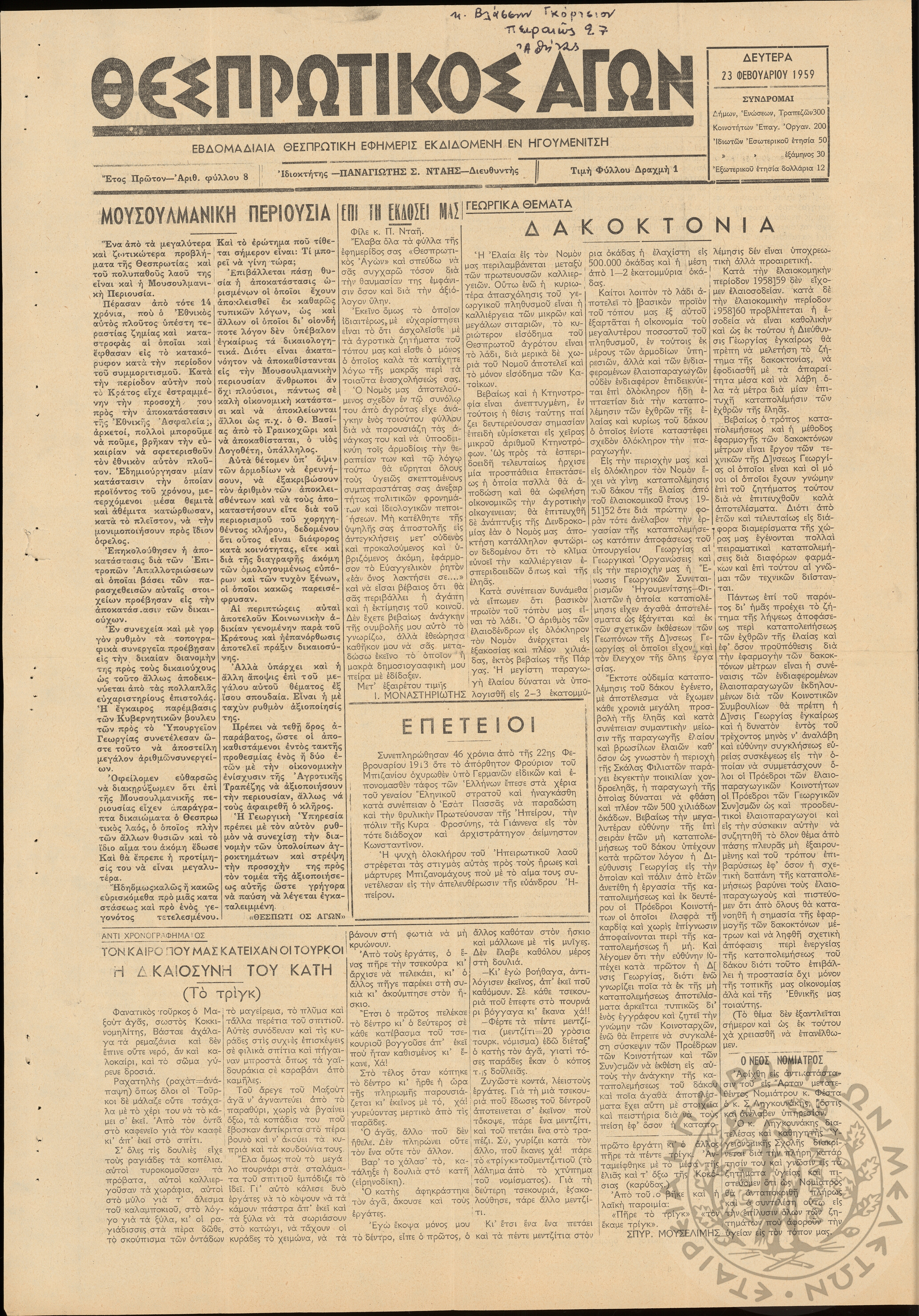 Θεσπρωτικός Αγών: εβδομαδιαία Θεσπρωτική εφημερίς εκδιδομένη εν Ηγουμενίτση, 1959, φ. 8Έτος Α΄, φ. 8...