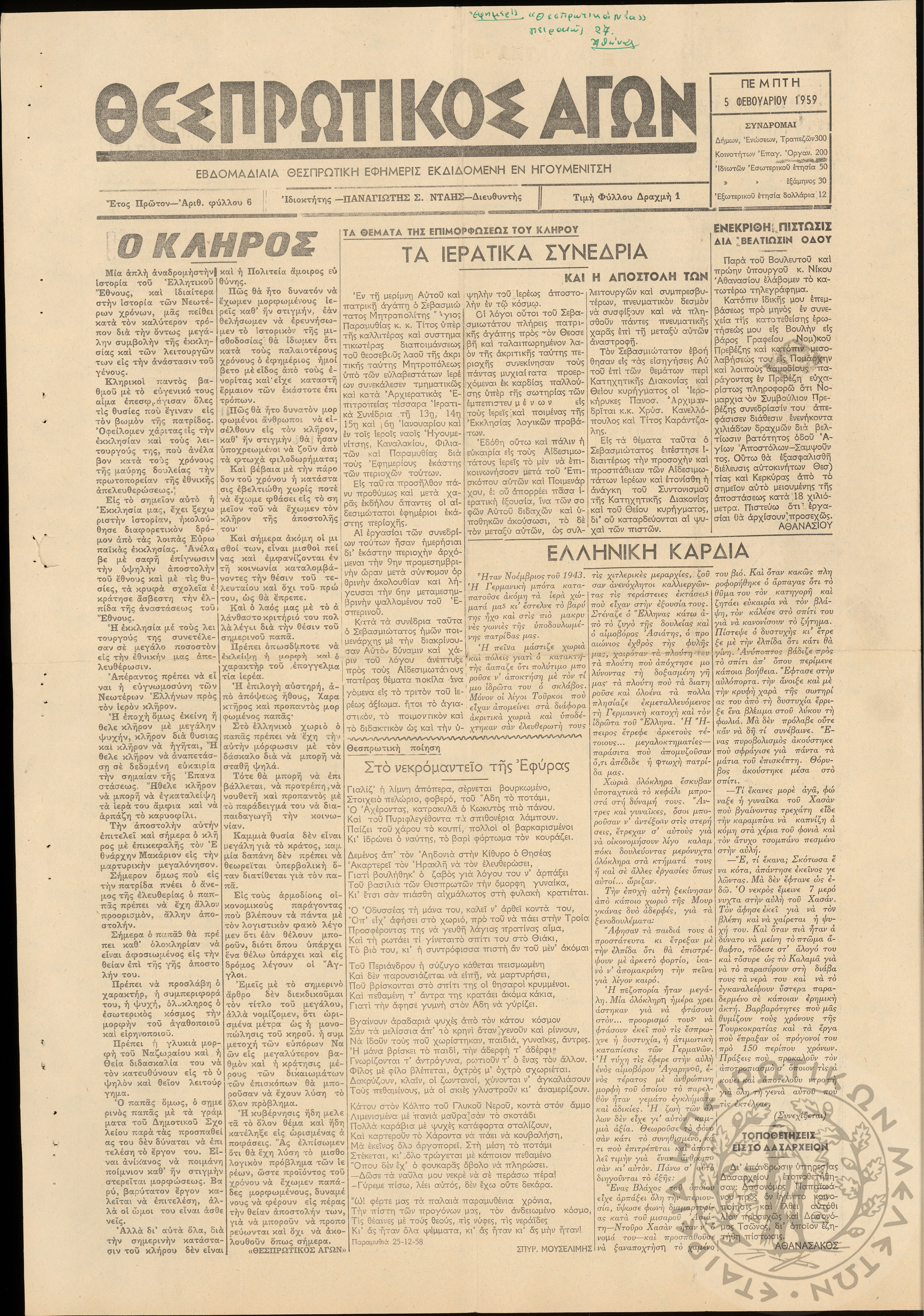 Θεσπρωτικός Αγών: εβδομαδιαία Θεσπρωτική εφημερίς εκδιδομένη εν Ηγουμενίτση, 1959, φ. 6Έτος Α΄, φ. 6...