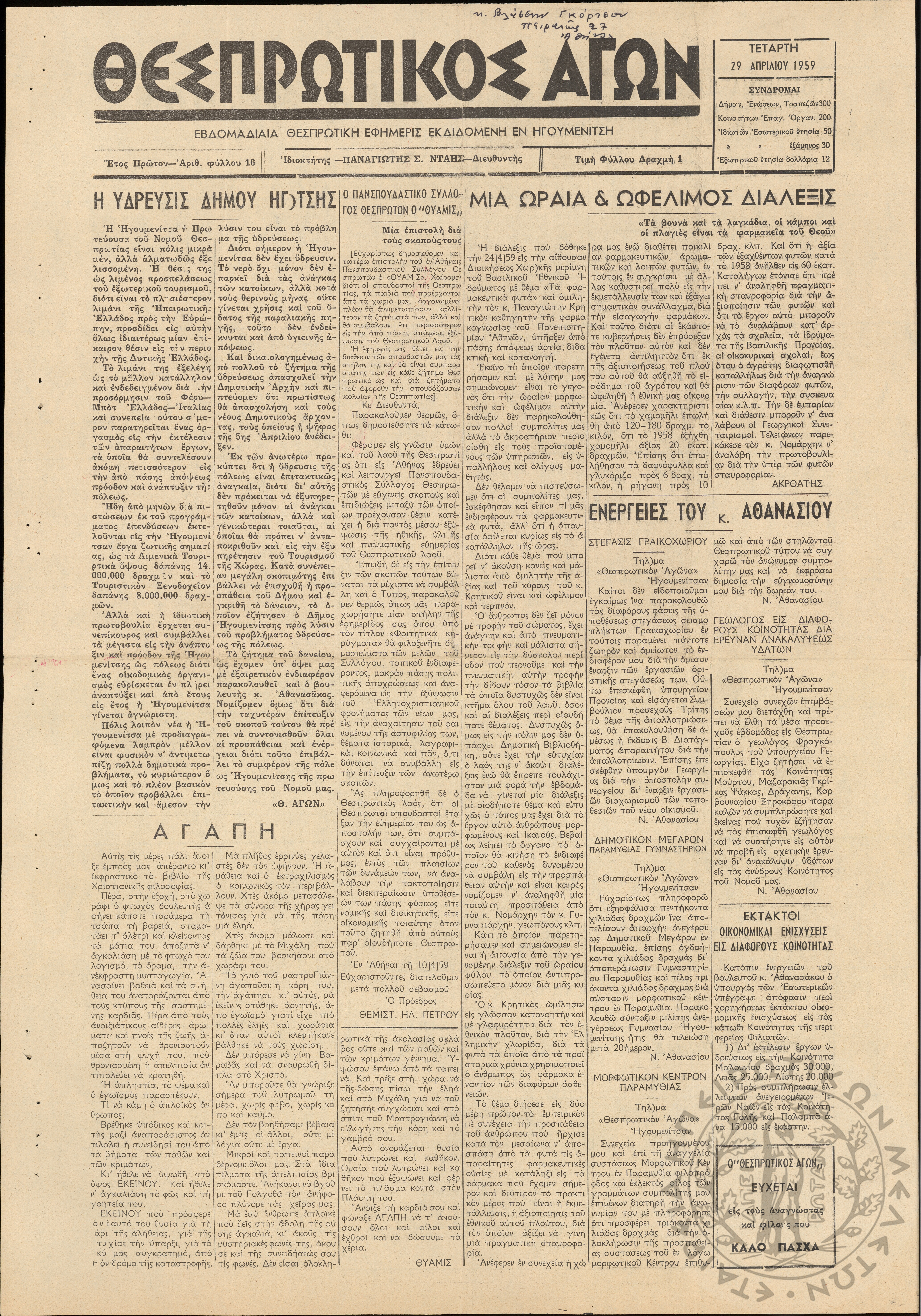 Θεσπρωτικός Αγών: εβδομαδιαία Θεσπρωτική εφημερίς εκδιδομένη εν Ηγουμενίτση, 1959, φ. 16Έτος Α΄, φ. 16...