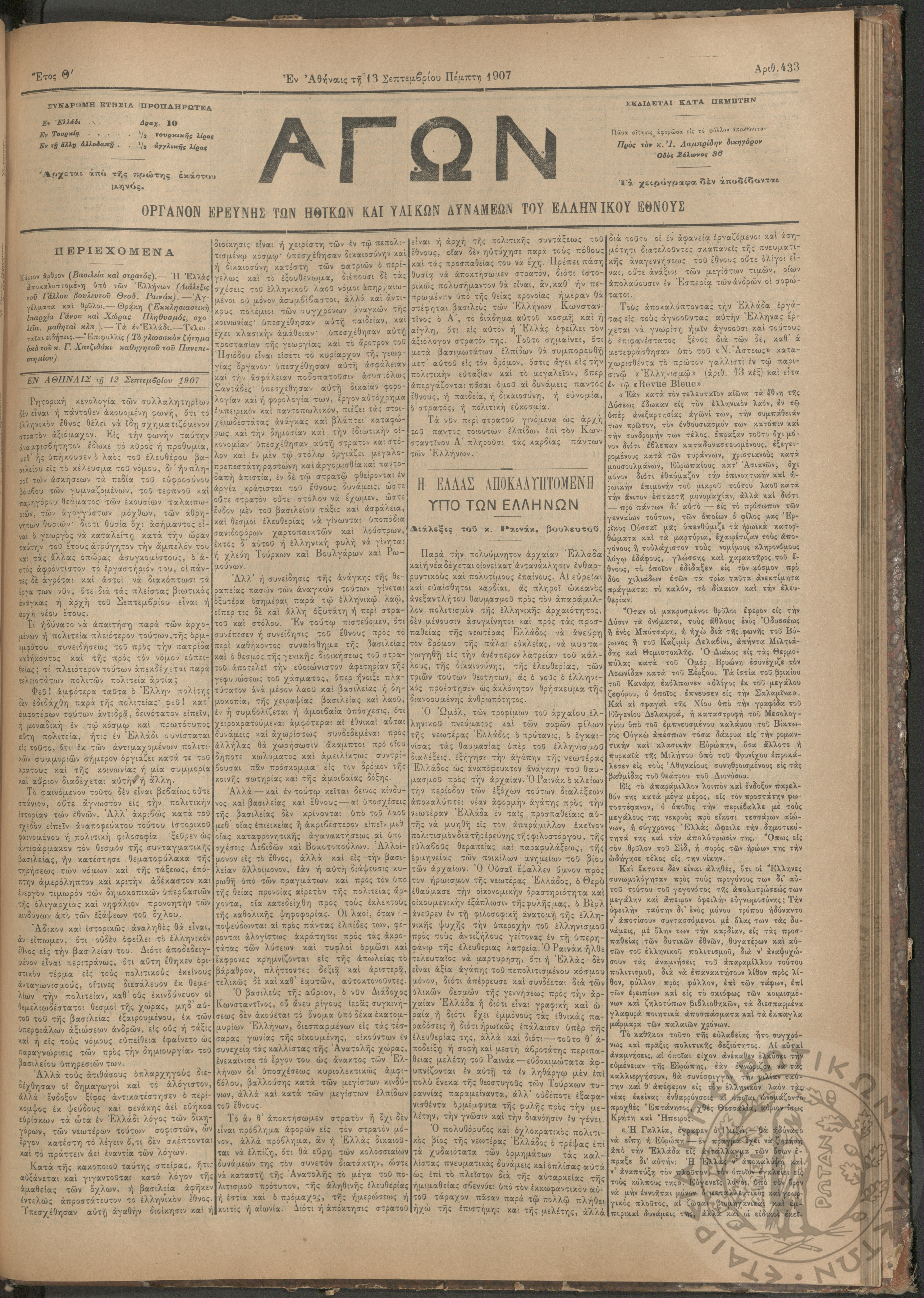 Αγών: Όργανον ερεύνης των ηθικών και υλικών δυνάμεων του Ελληνικού Έθνους, 1907 (Φ. 433)Έτος Θ΄, Φ. 433...