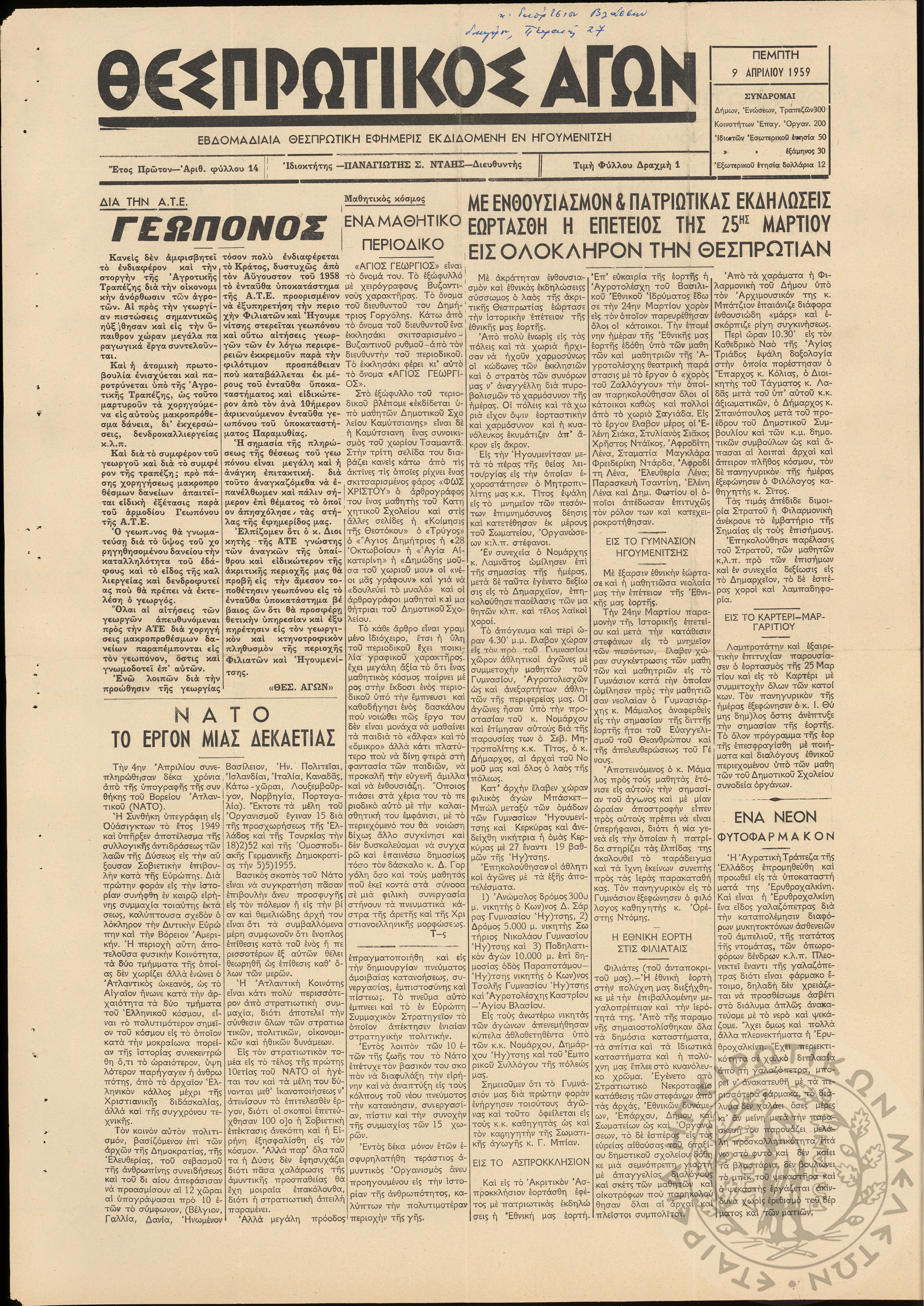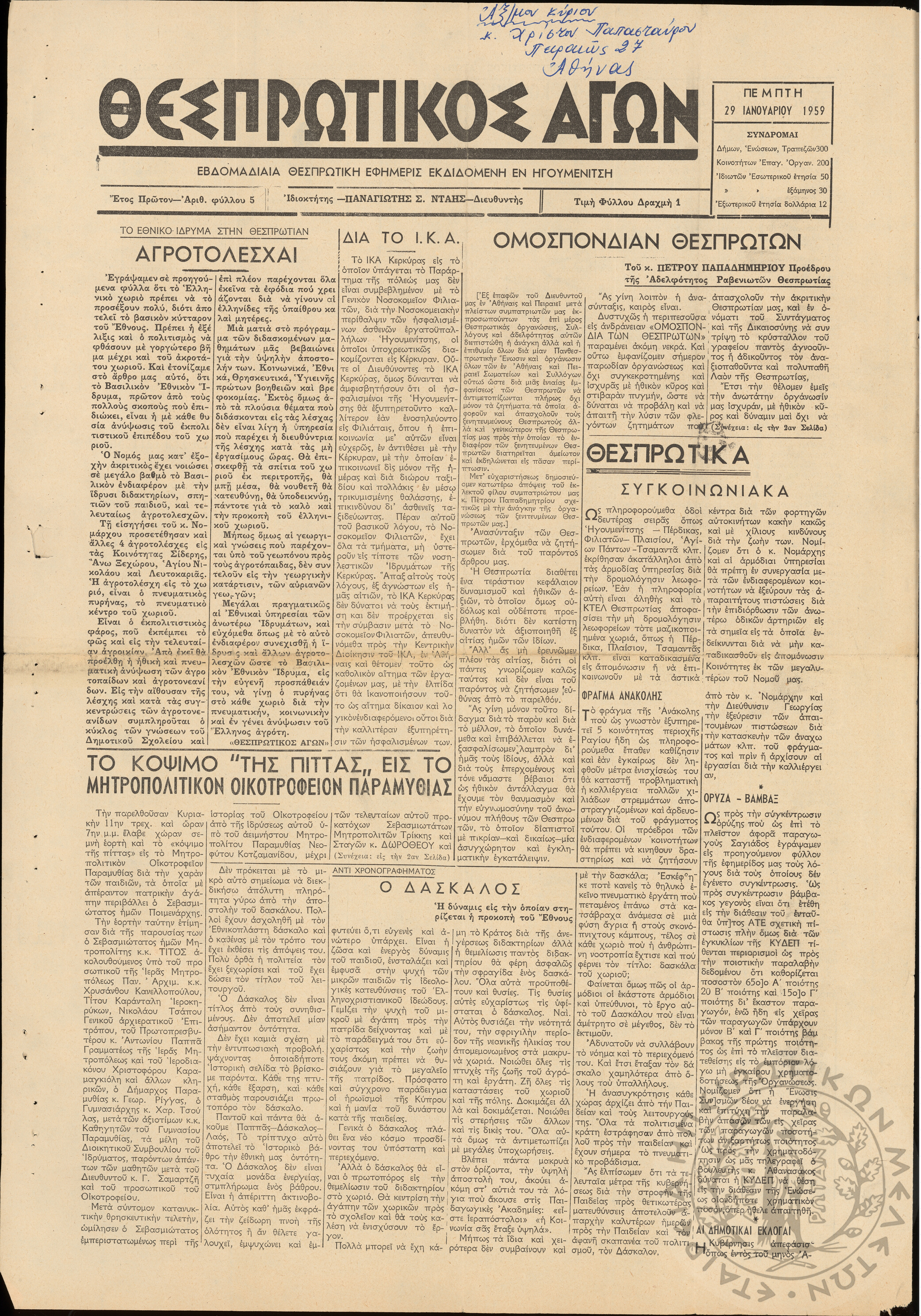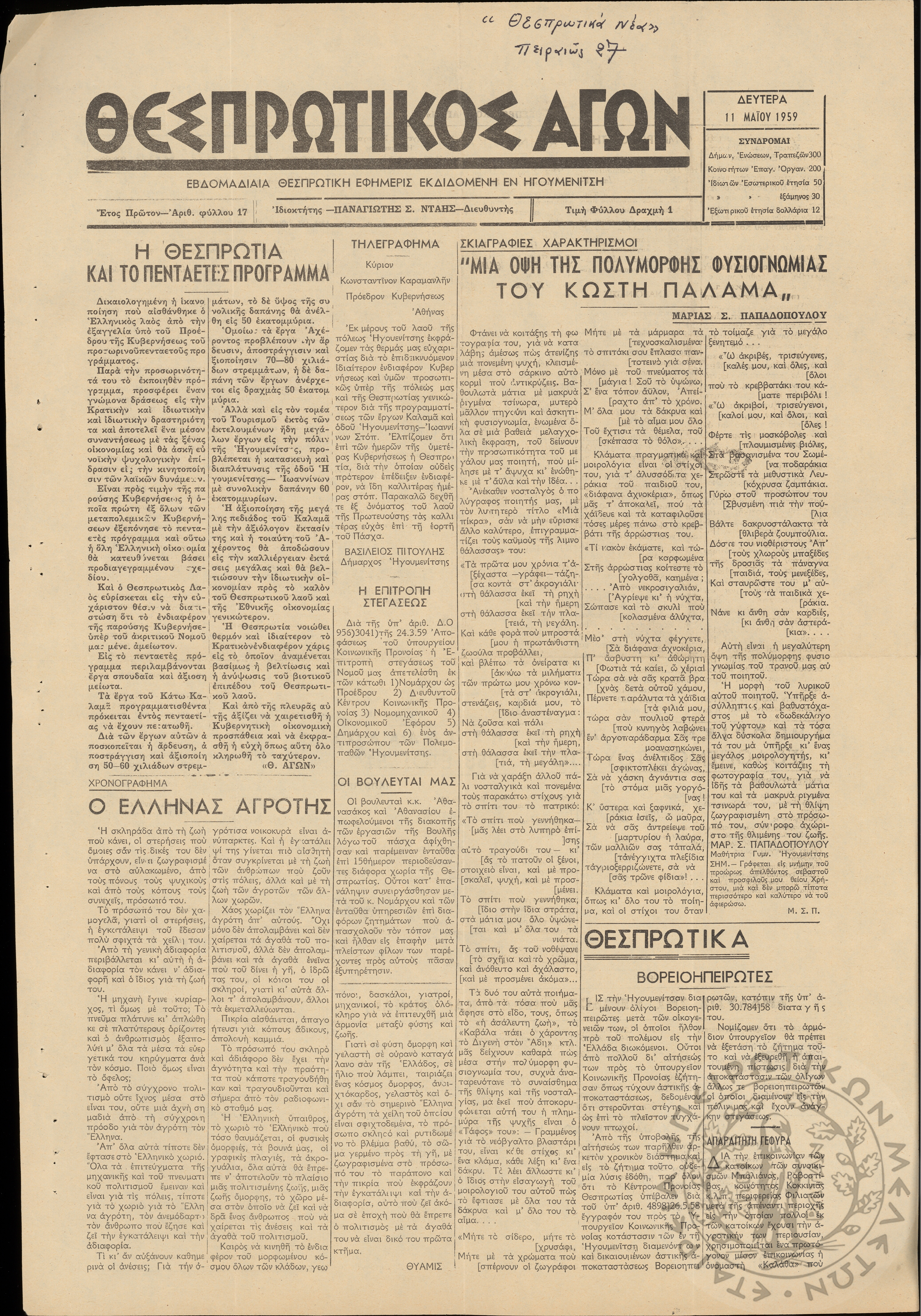 Θεσπρωτικός Αγών: εβδομαδιαία Θεσπρωτική εφημερίς εκδιδομένη εν Ηγουμενίτση, 1959, φ. 5Έτος Α΄, φ. 5...