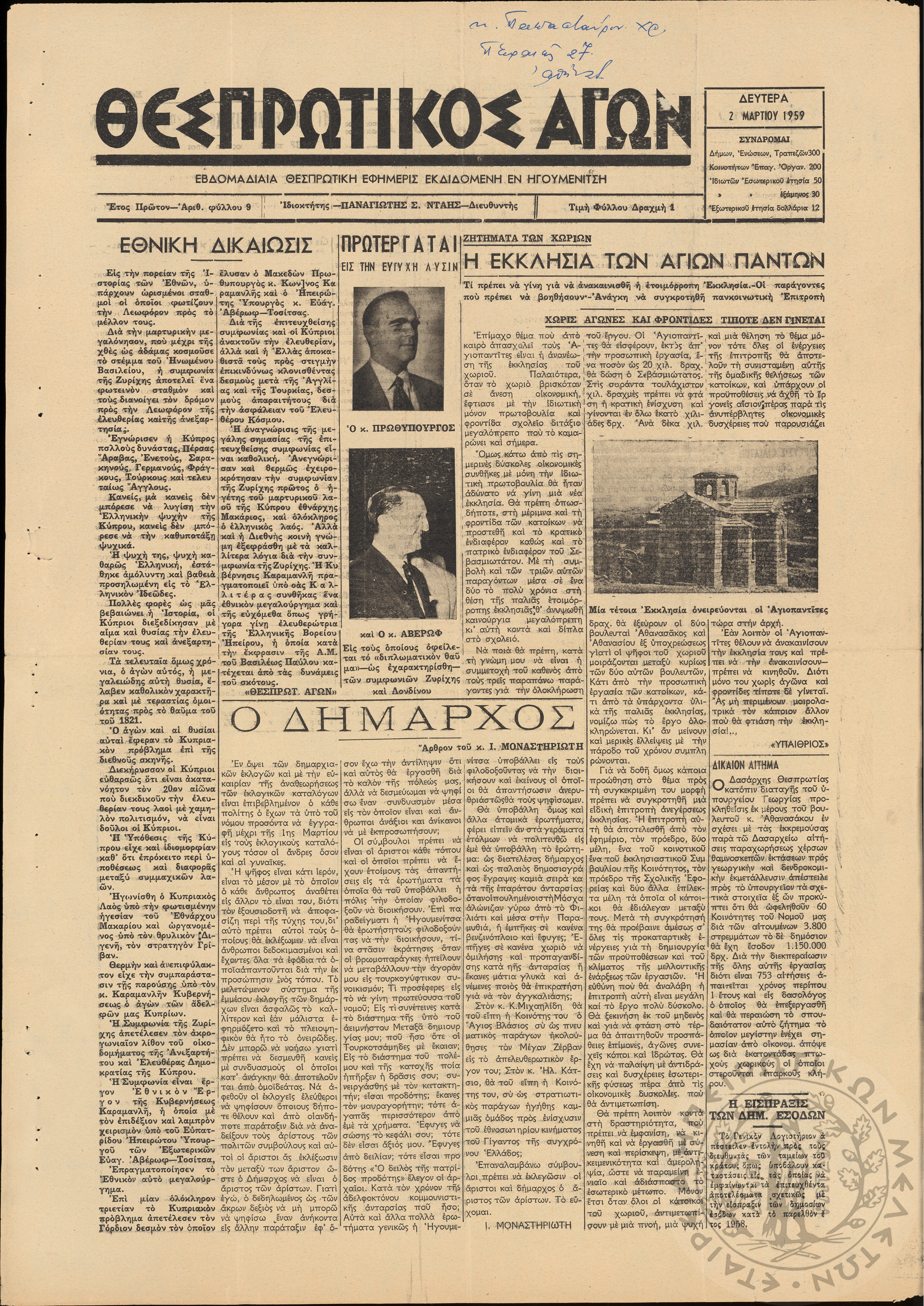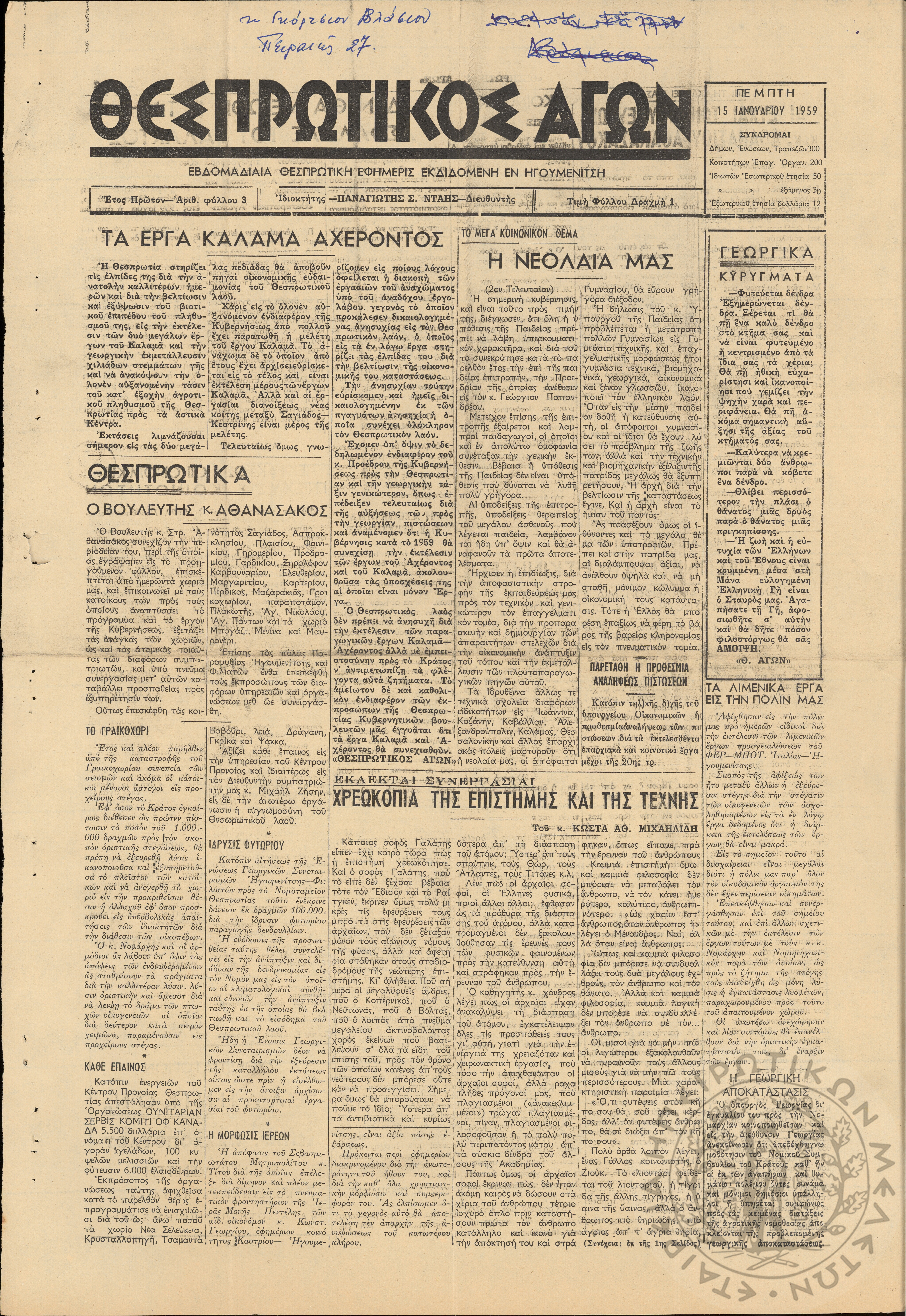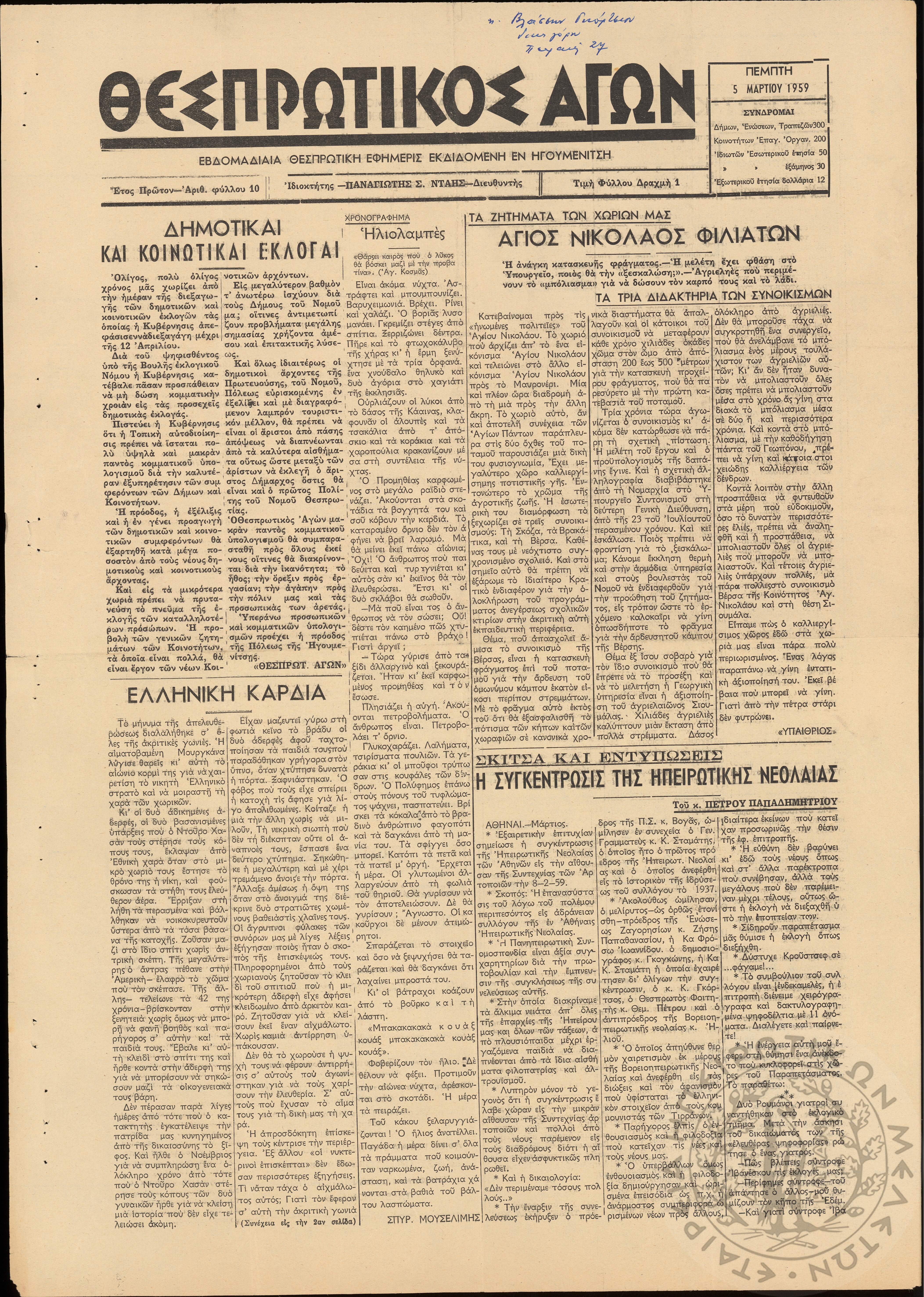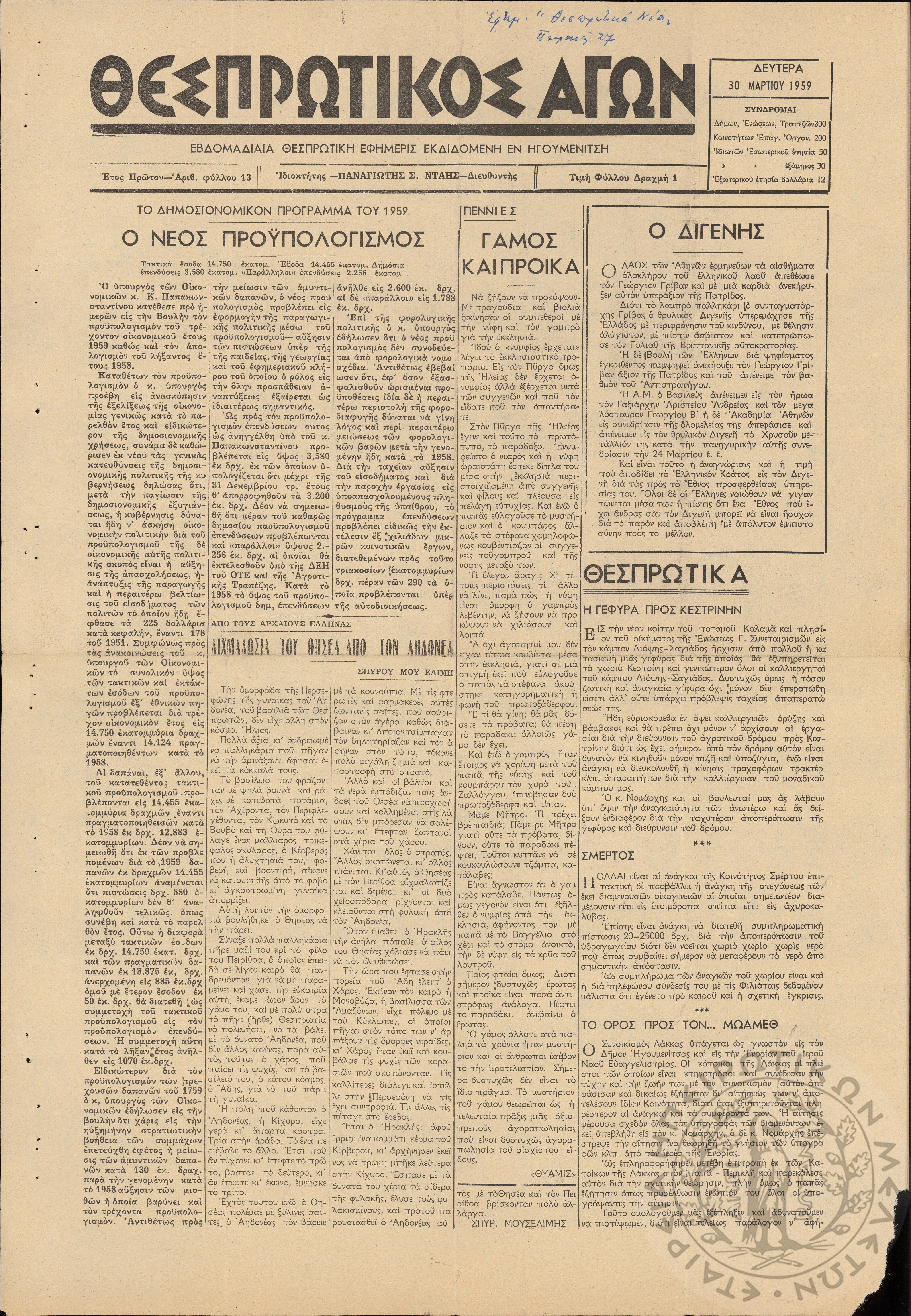 Θεσπρωτικός Αγών: εβδομαδιαία Θεσπρωτική εφημερίς εκδιδομένη εν Ηγουμενίτση, 1959, φ. 3Έτος Α΄, φ. 3...